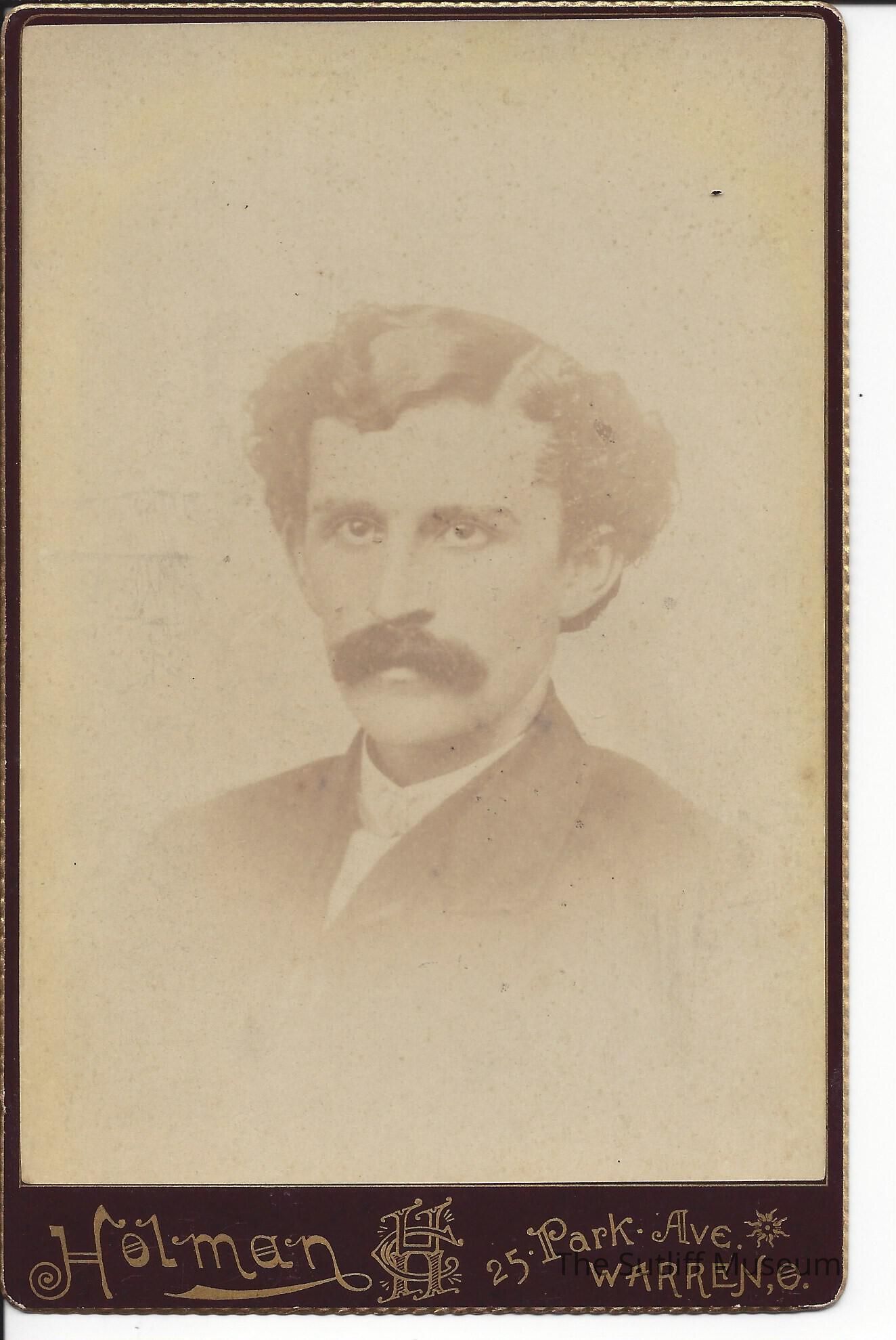 The item is a photograph portrait of Levi Granger Sutliff. It is sepia toned and he is wearing a jacket and a white shirt. The photograph was taken by Holman, Park Avenue, in Warren, Ohio. The bottom portion of the portrait features a brown box with the photographer's information.Collection