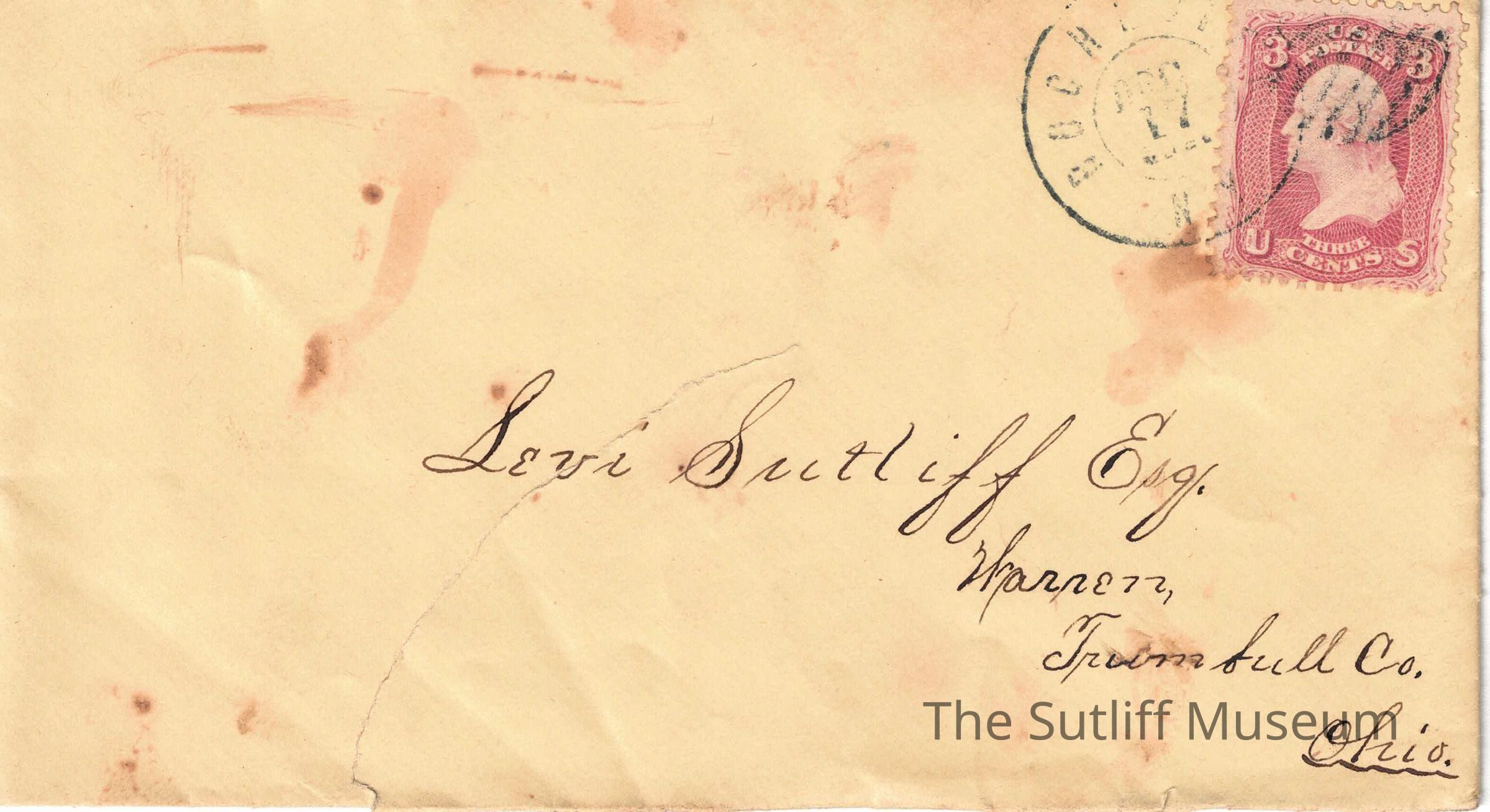 An envelope addressed to Levi Sutliff in Warren, Trumbull County Ohio. Stamped Dec 17, [?].Relationships