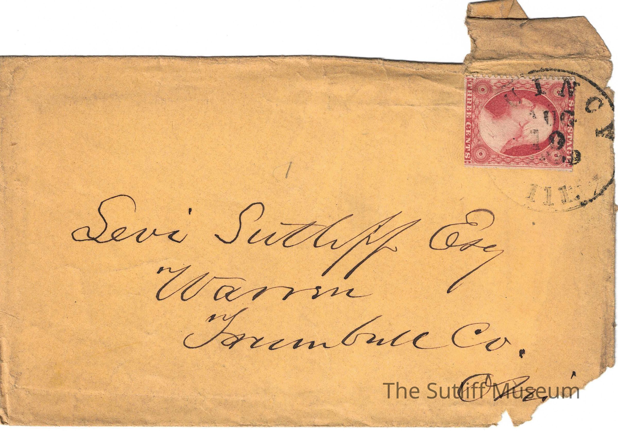 An envelope addressed to Levi Sutliff in Warren, Trumbull County Ohio. Dated August 10.Relationships