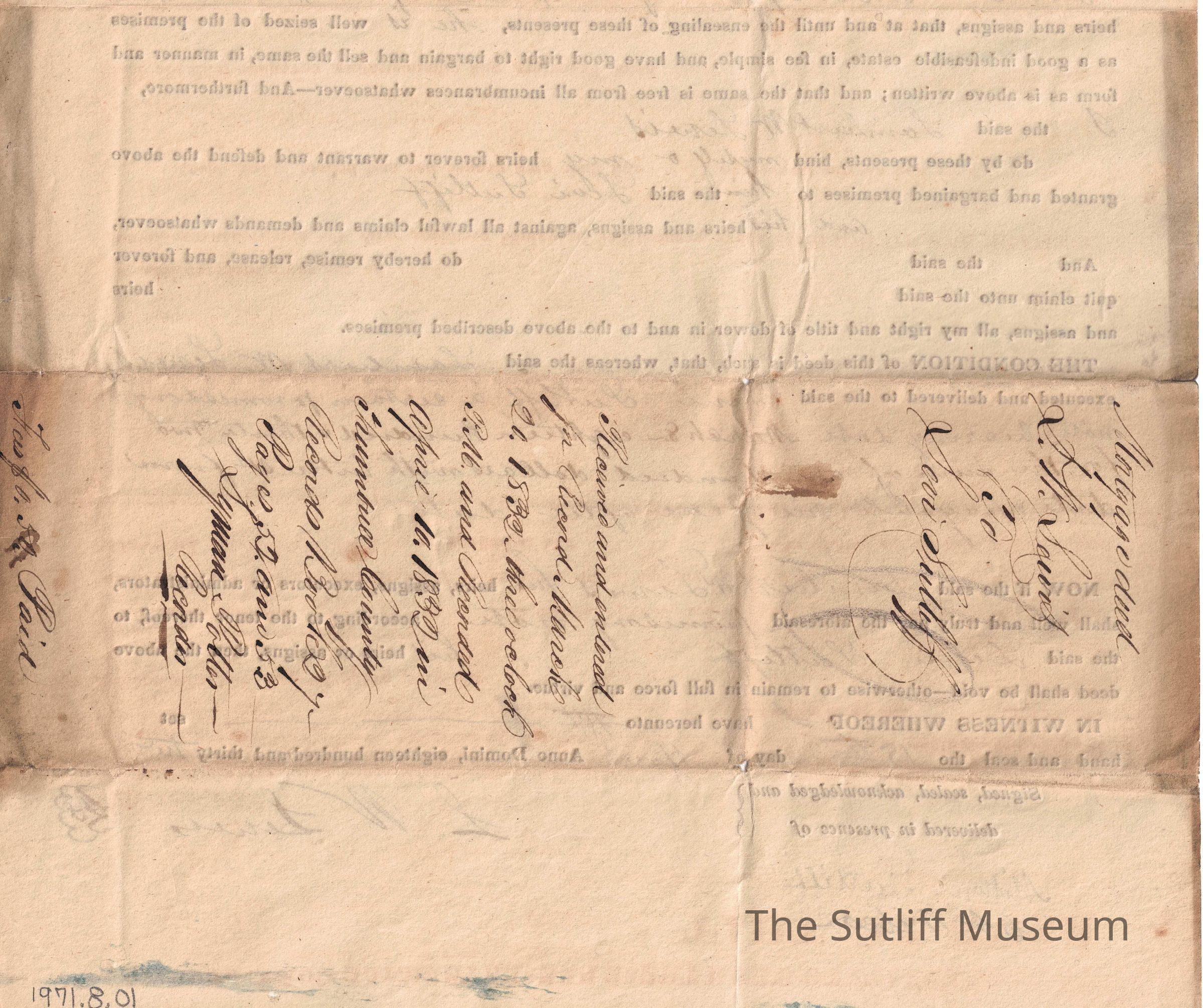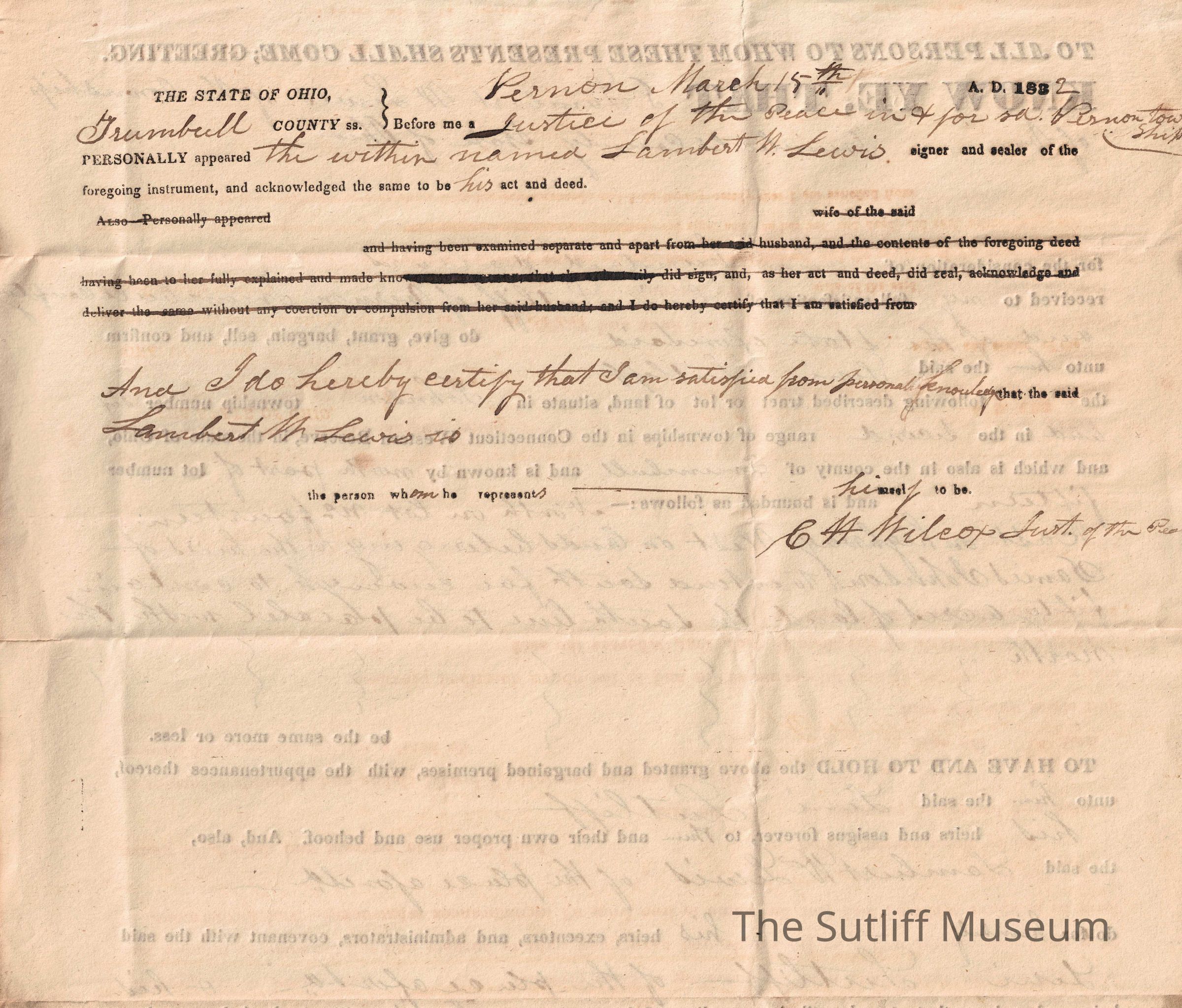 A legal transfer of land in Johnson township to Levi Sutliff, witnessed by Milton Sutliff.Relationships