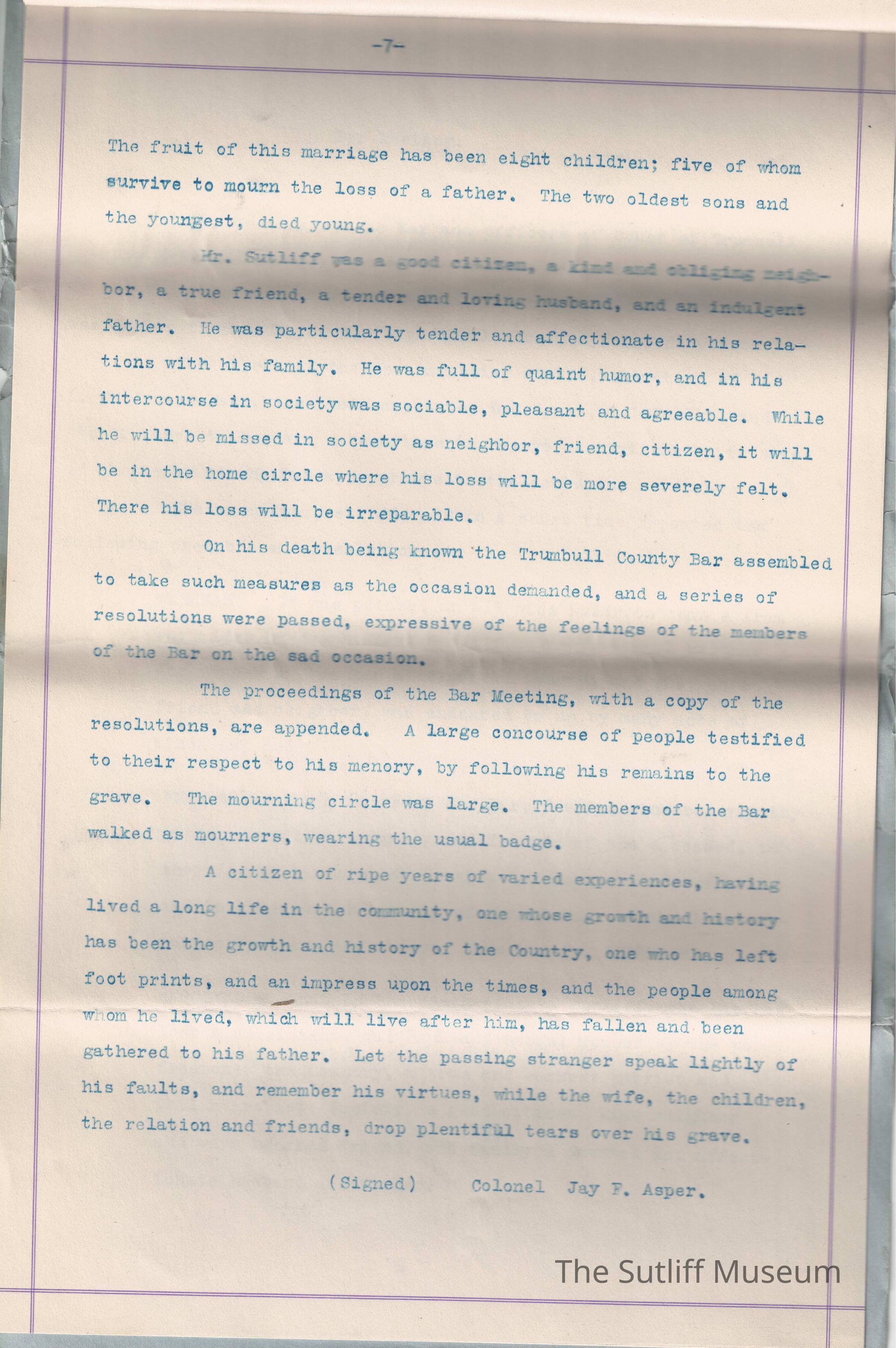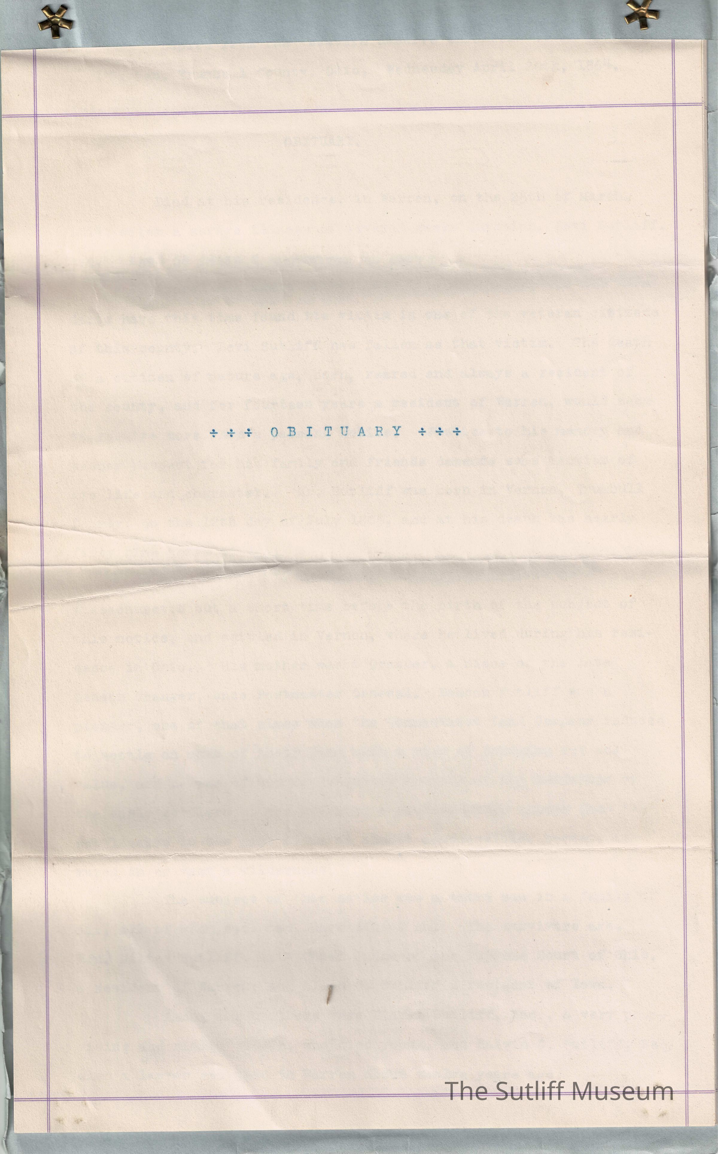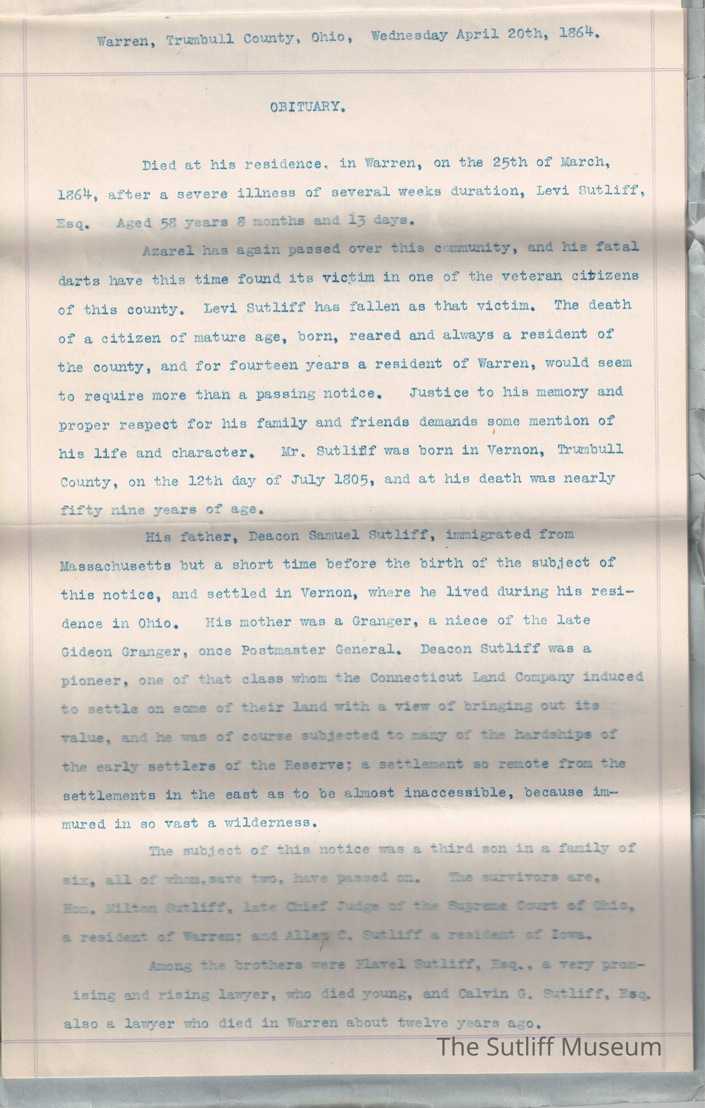 A copy of Levi Sutliff's obituary, stating he died at his residence in Warren on March 25, 1864 at 58 before recounting his family and life.Collection