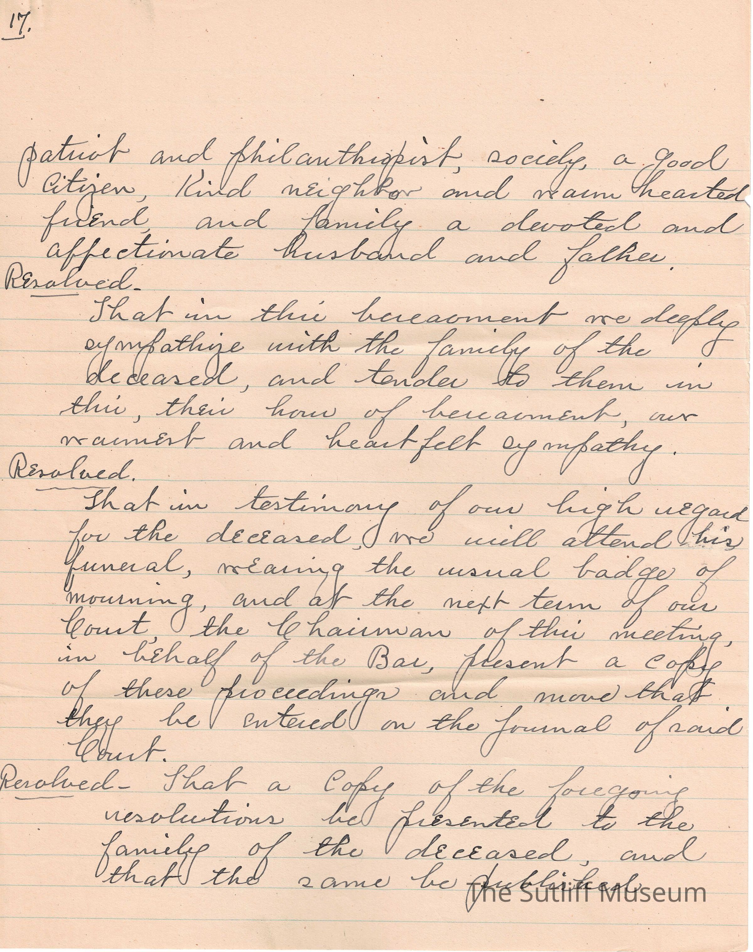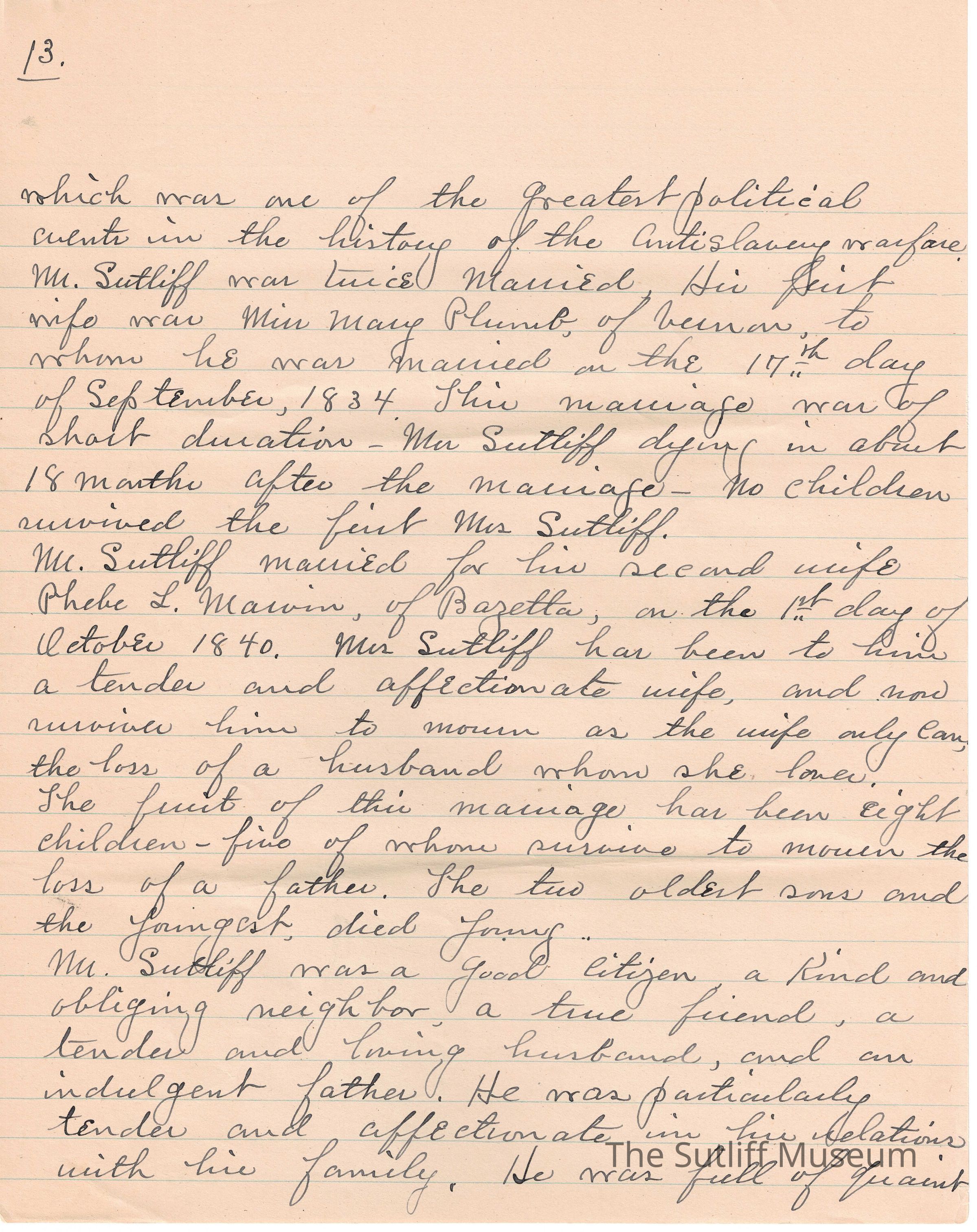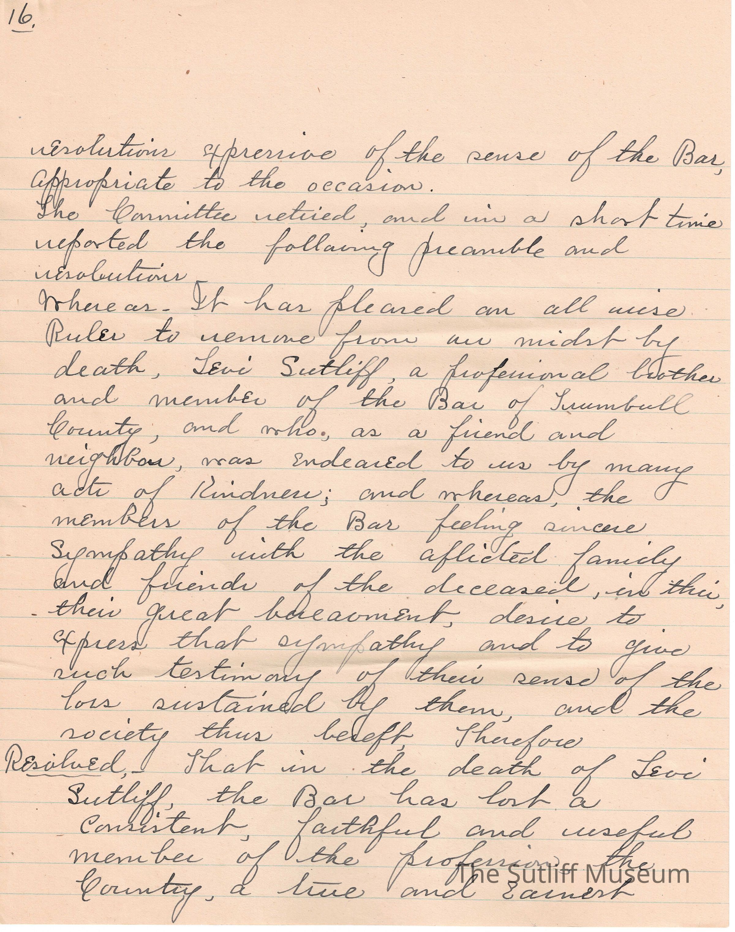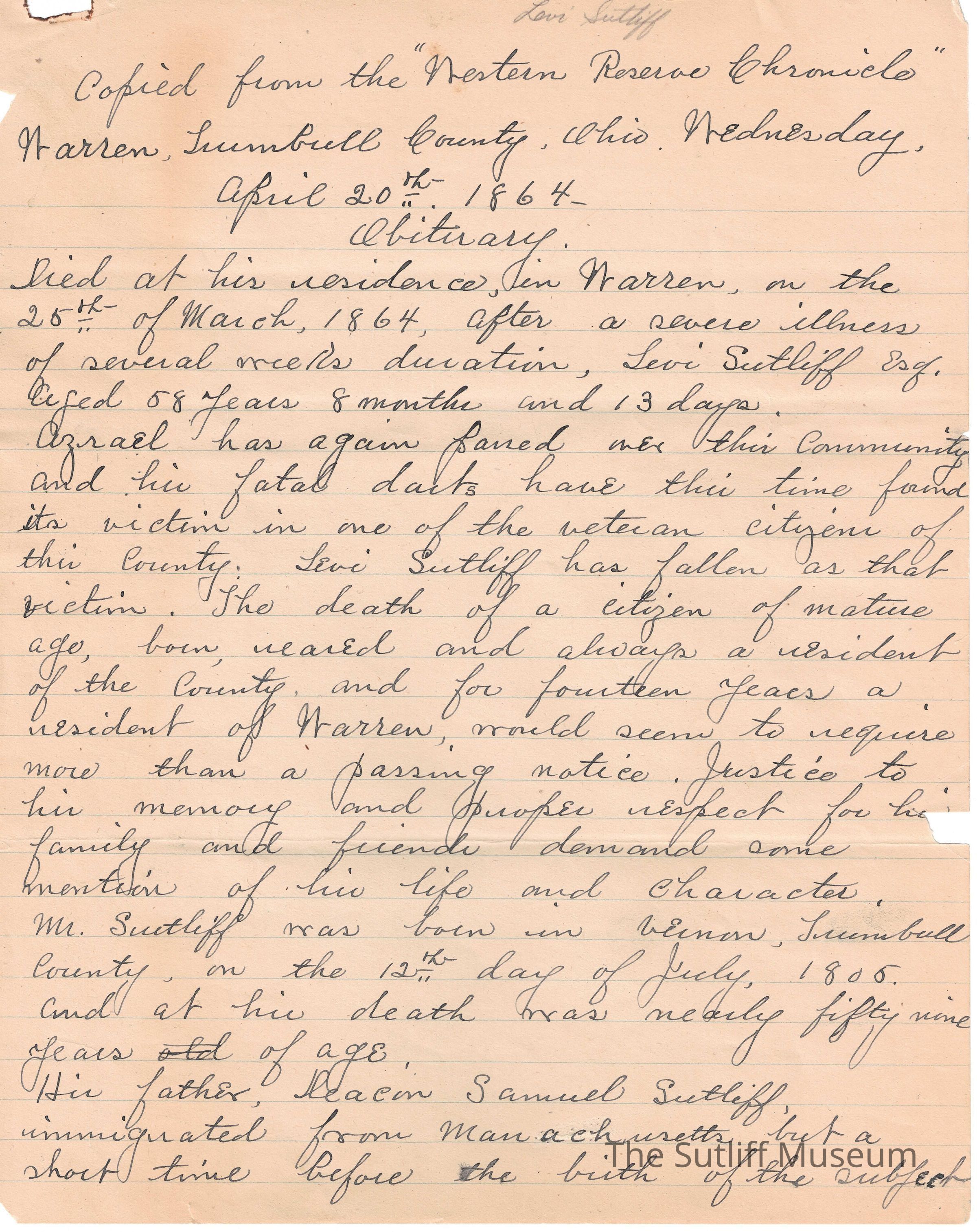 A handwritten copy of Levi Sutliff's obituary written by M. Birchard.