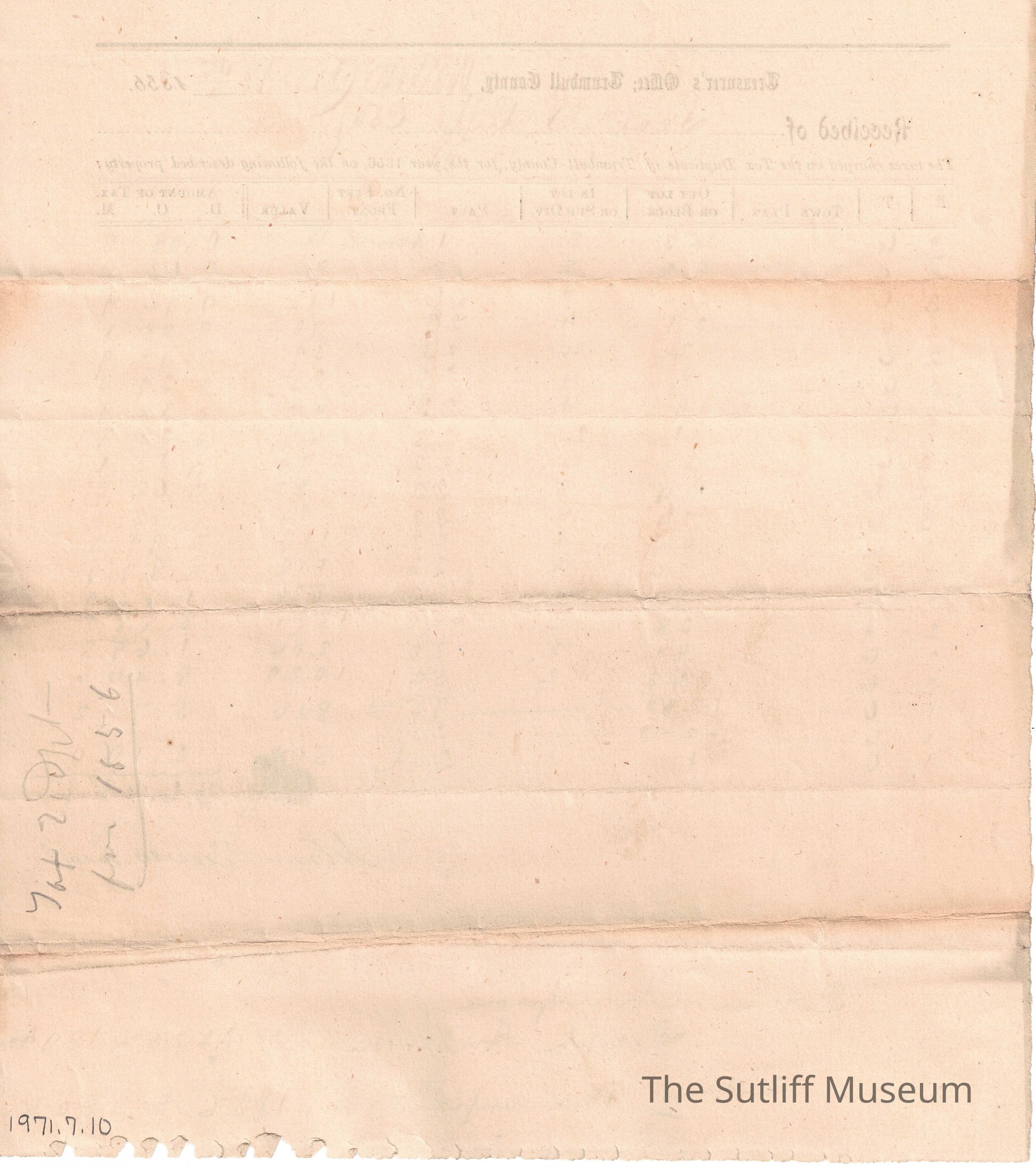 A small sheet listing Levi Sutliff's taxes for the 1856 year, most likely a business account.Relationships