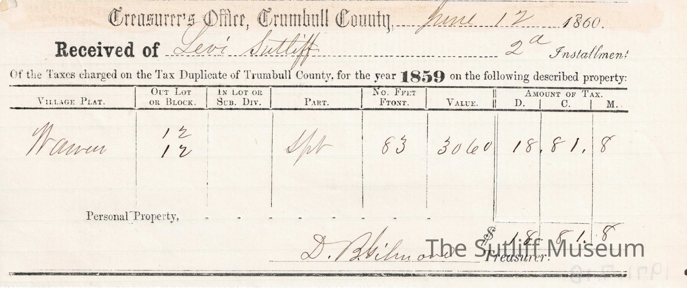 A small sheet listing Levi Sutliff's taxes for the 1859 year.Relationships