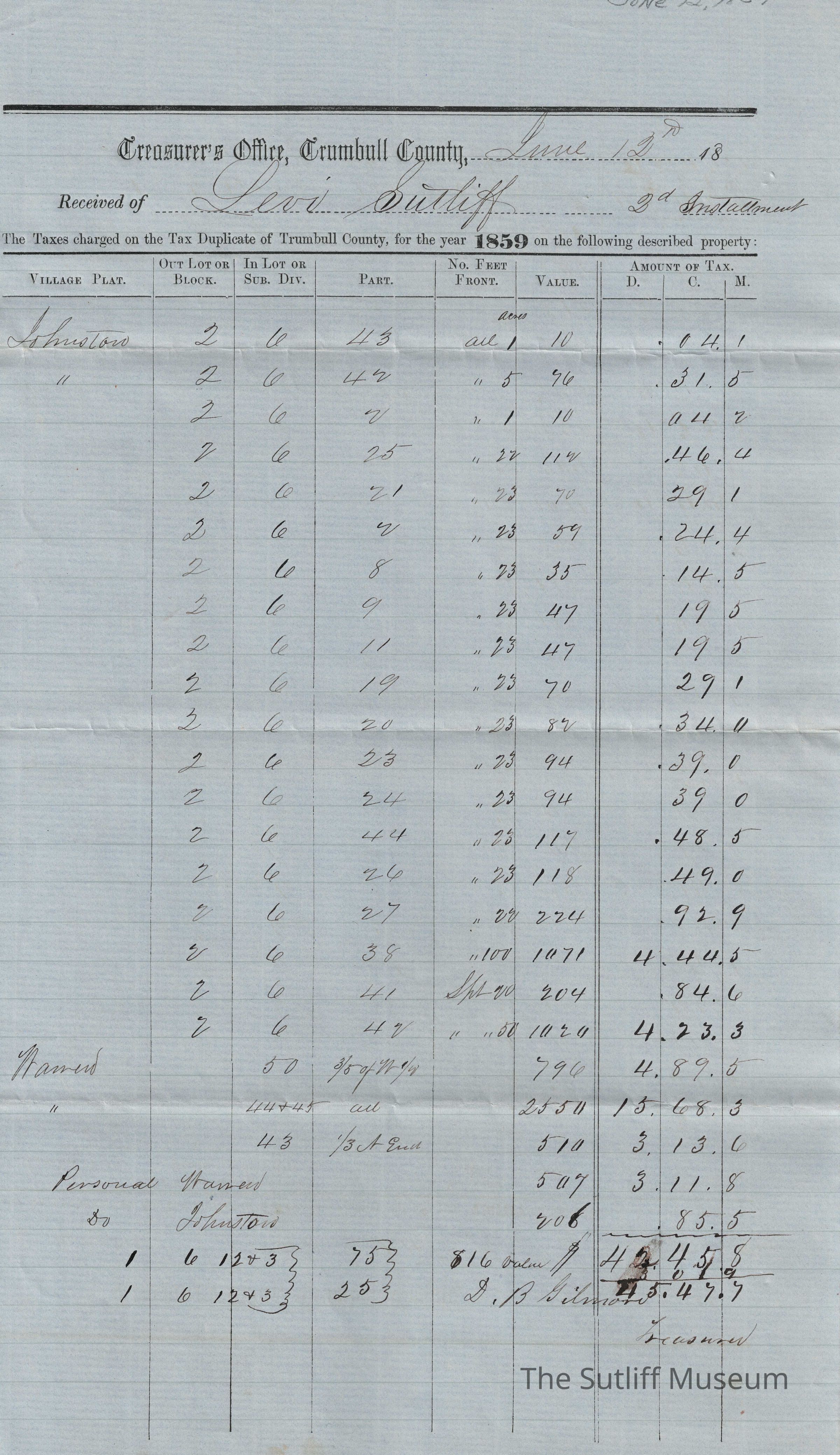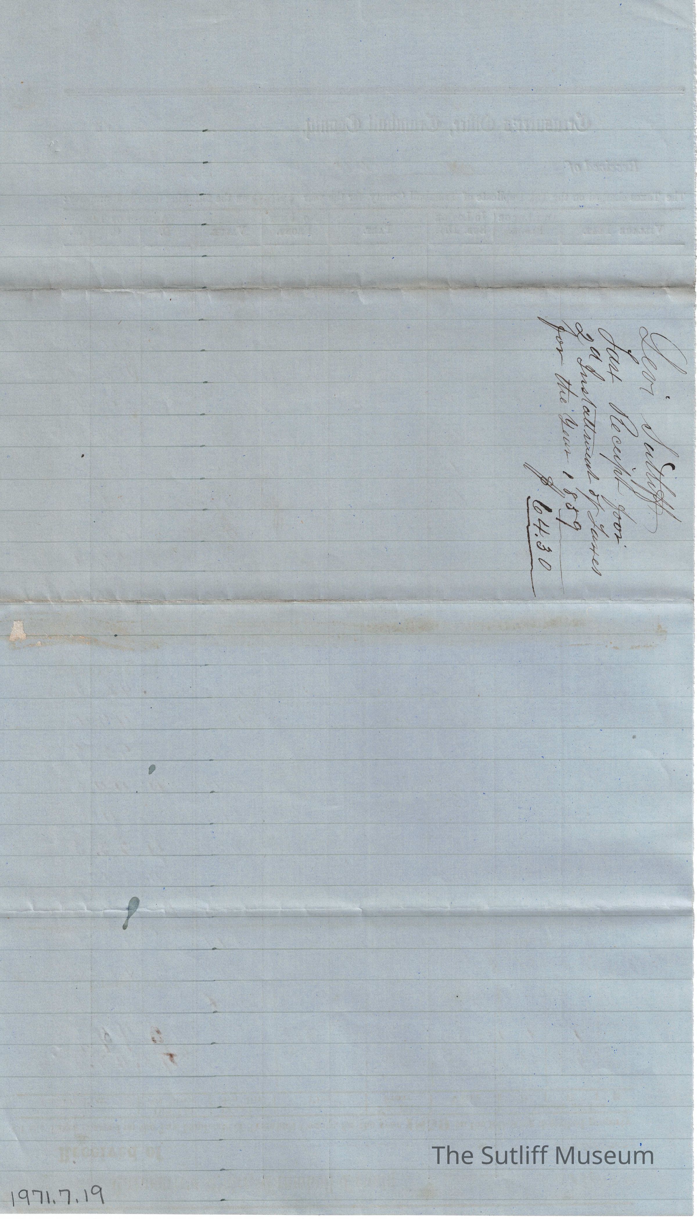 A small sheet listing Levi Sutliff's taxes for the 1859 year, most likely a business account.Relationships