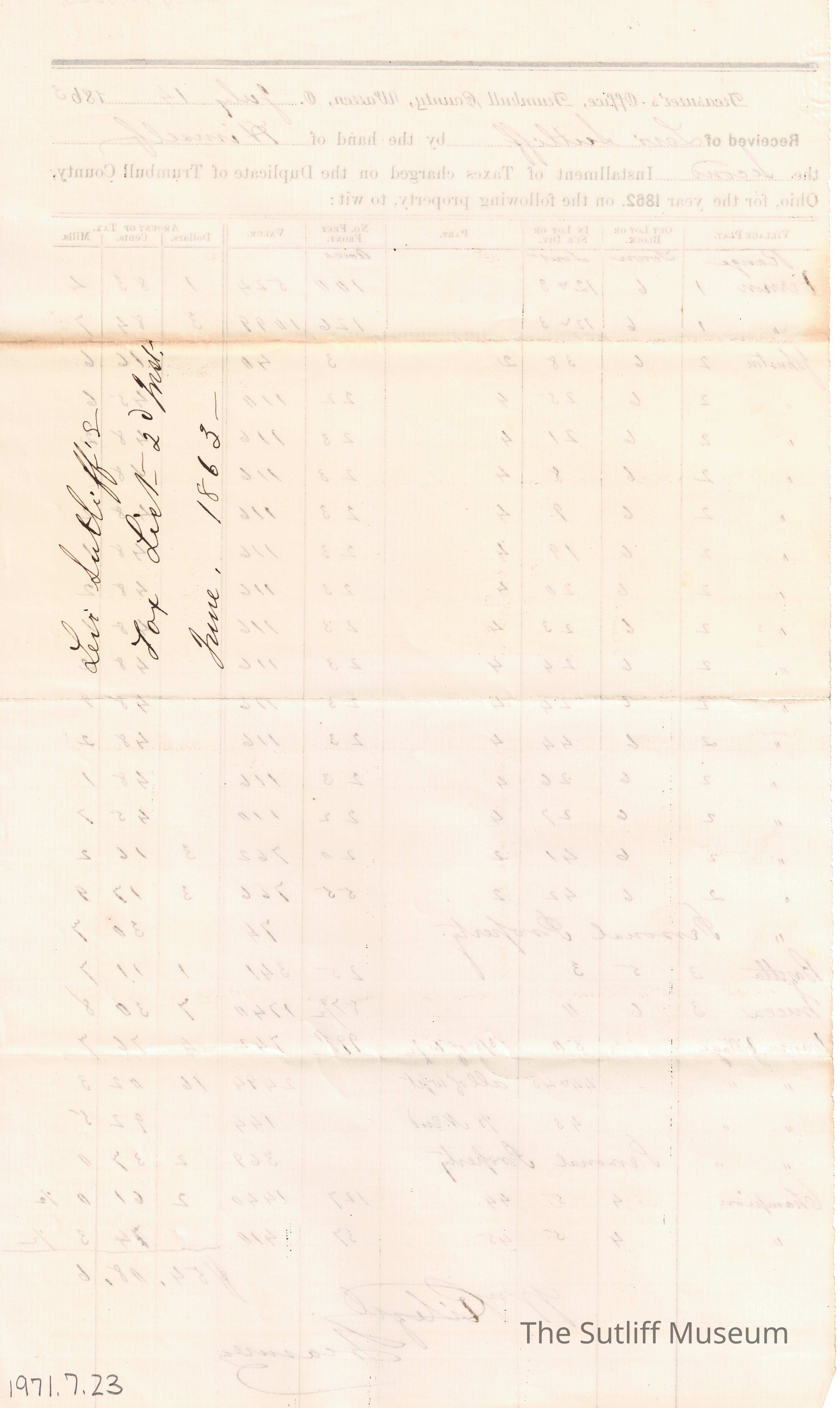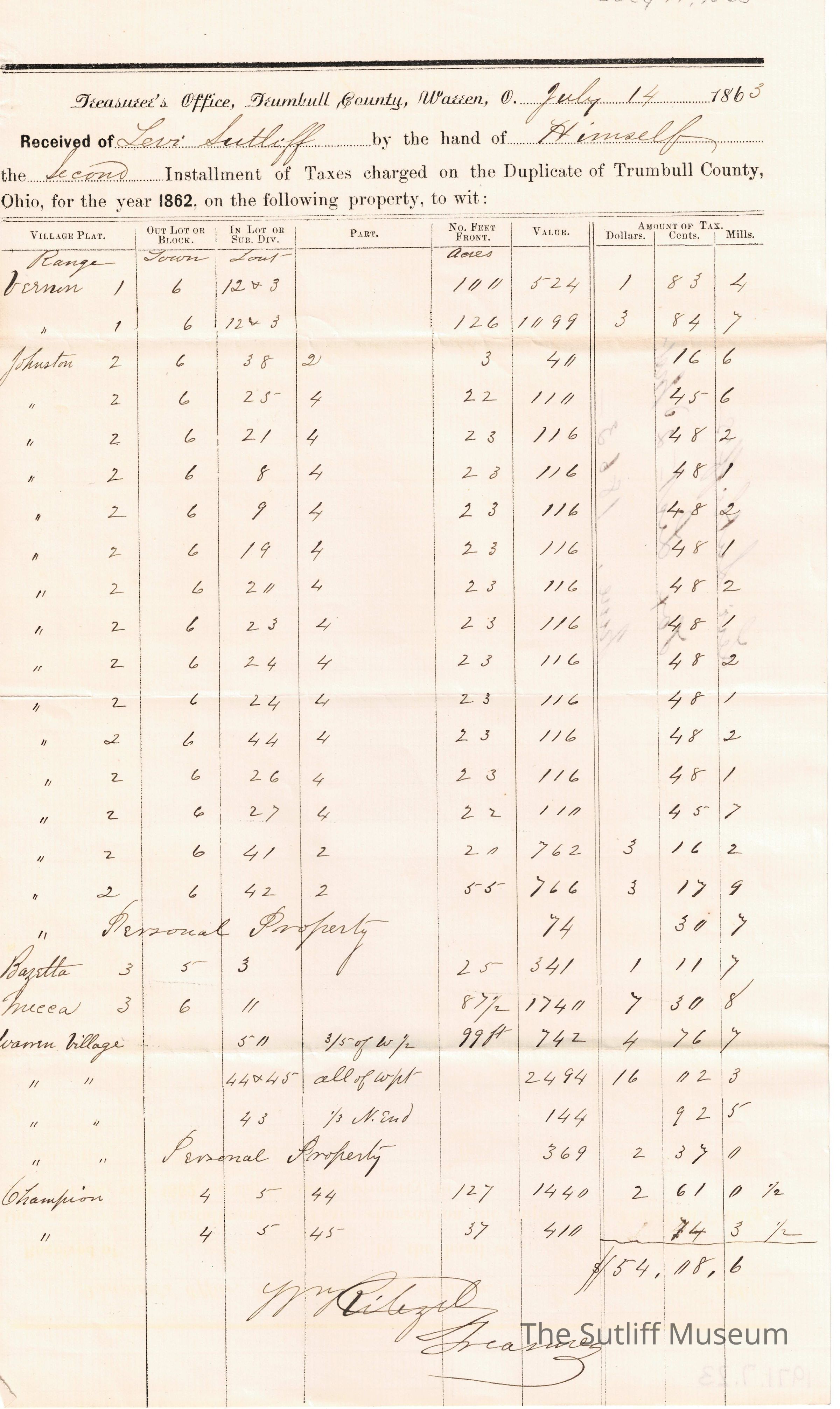 A small sheet listing Levi Sutliff's taxes for the 1862 year, most likely a business account.Relationships