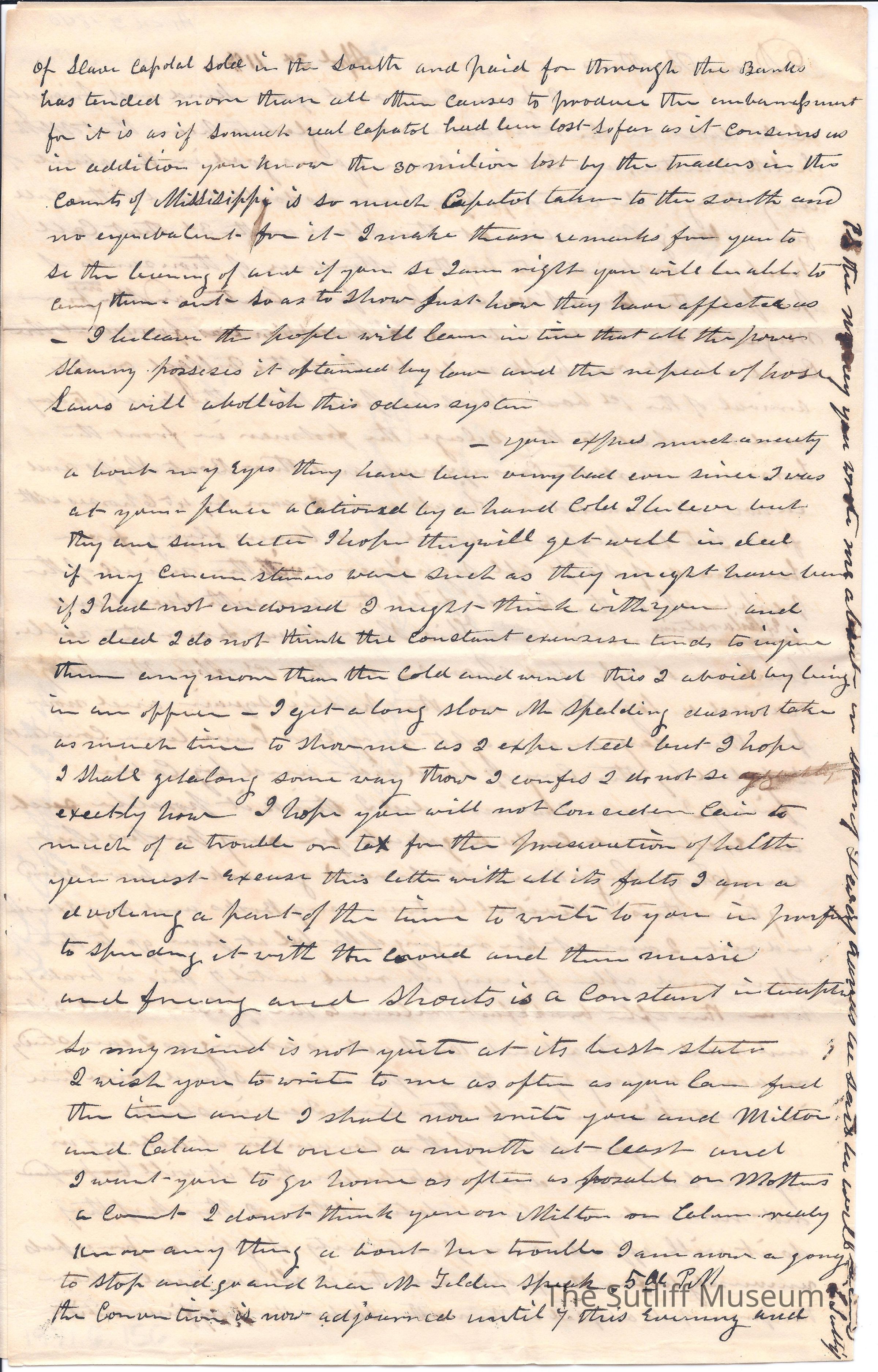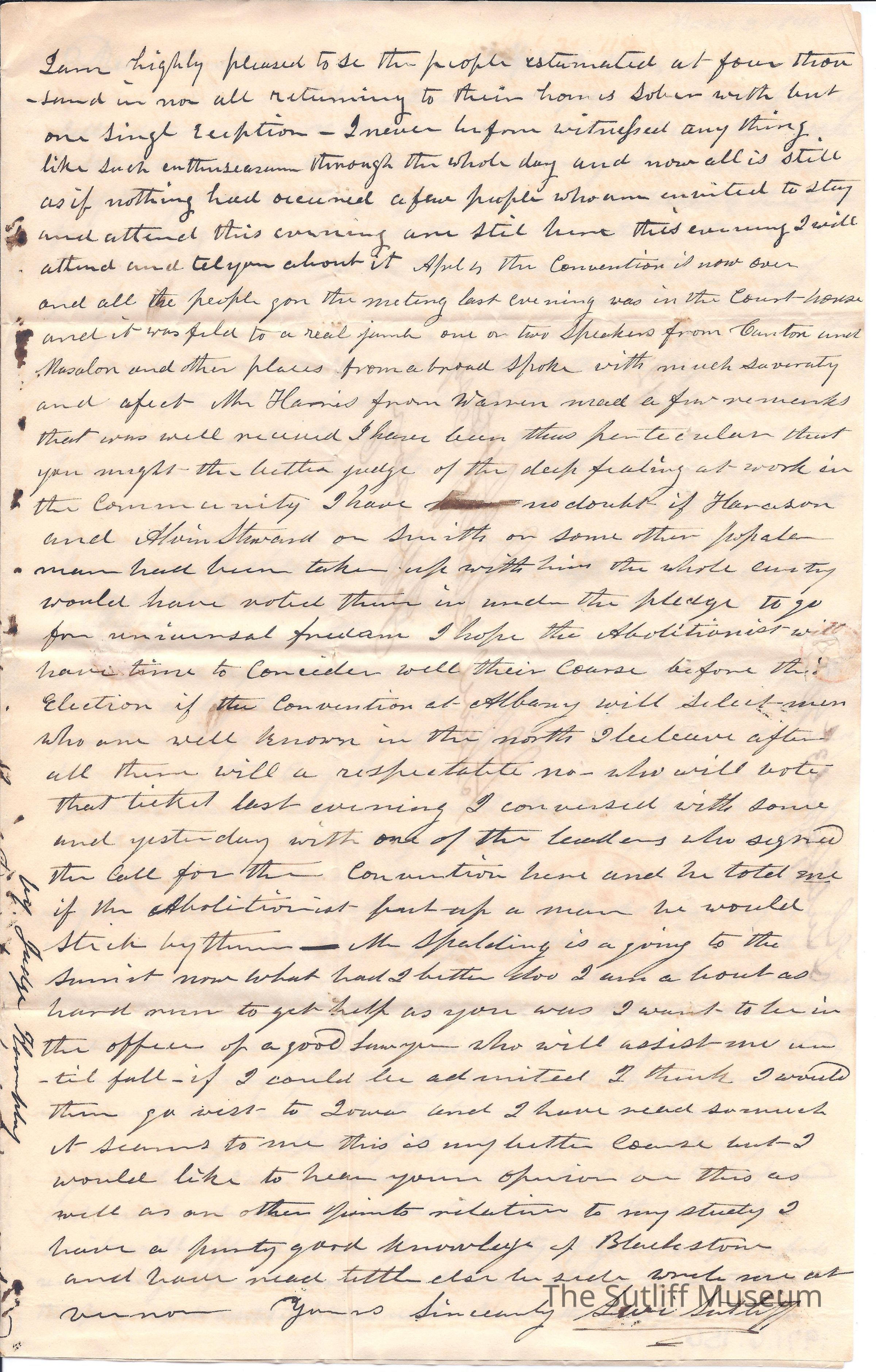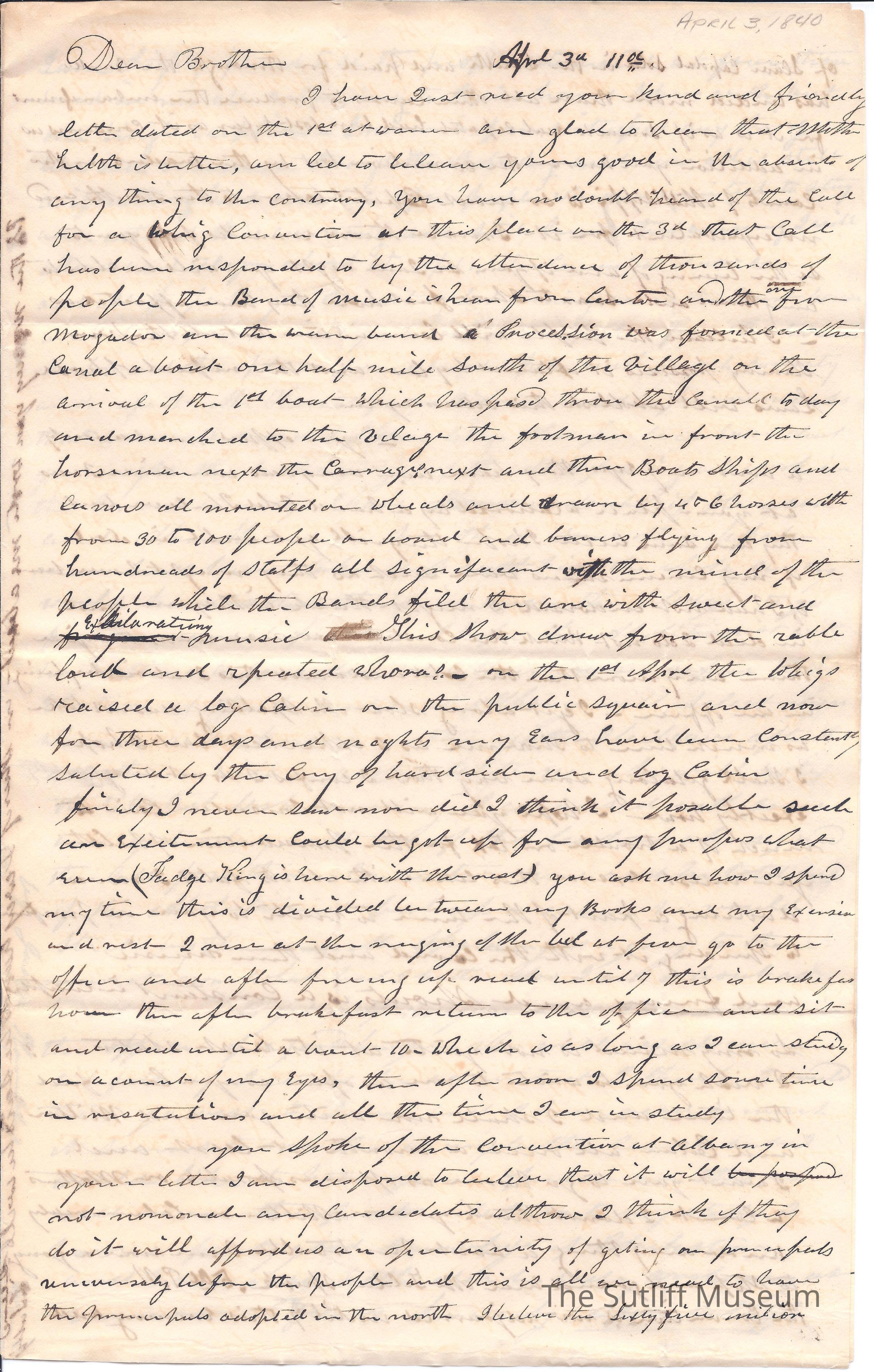 Letter from Levi Sutliff to Flavel Sutliff. Levi informs Flavel of Ruth's improving health, the excitement of a Whig Convention in Northeast Ohio and the state of his eyes.Collection