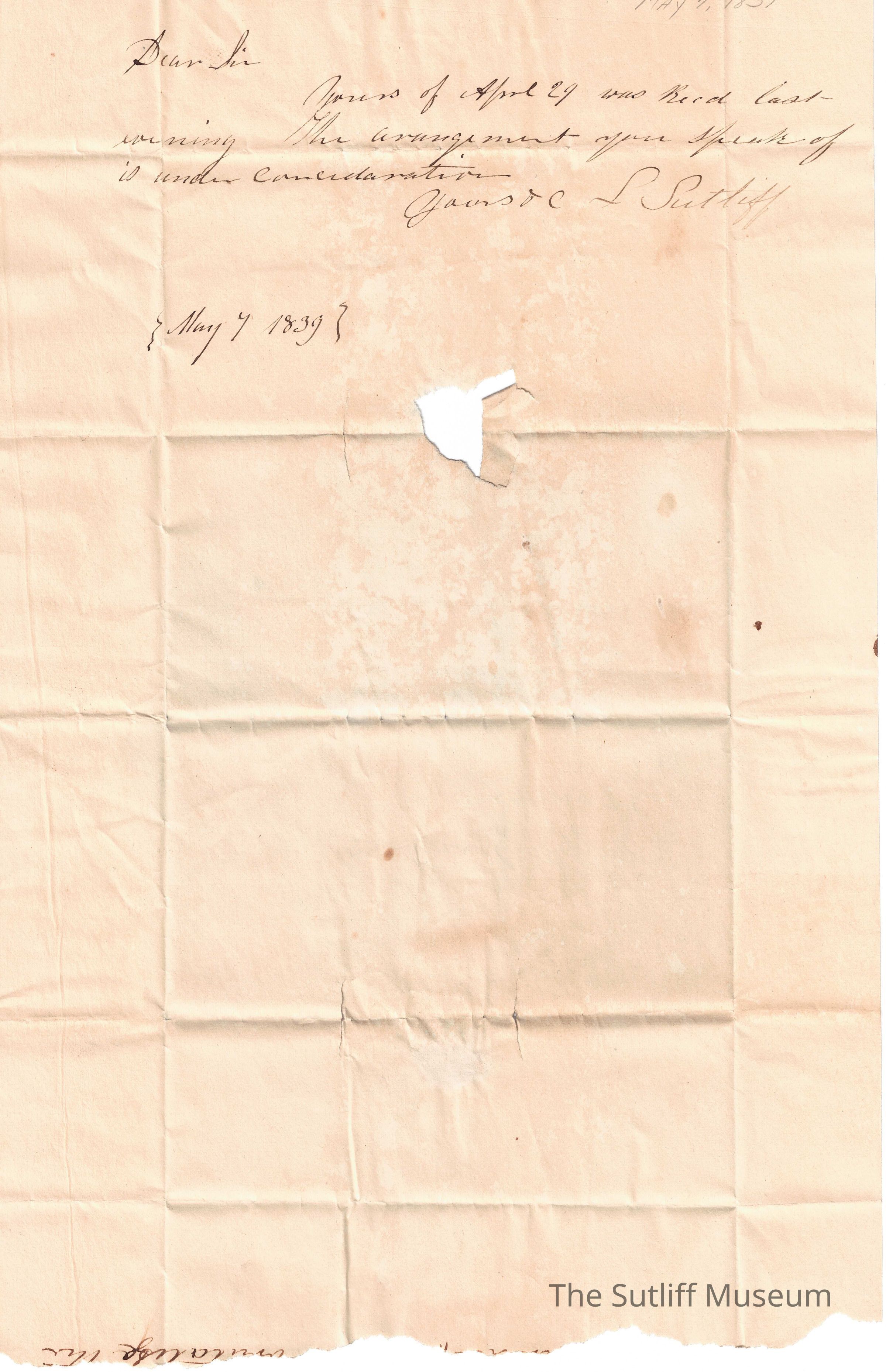 Letter from Levi Sutliff to Samuel Moffitt. Levi replies to Moffitt's letter regarding Blodgett's request. Levi replies that the arrangement is under consideration.Collection