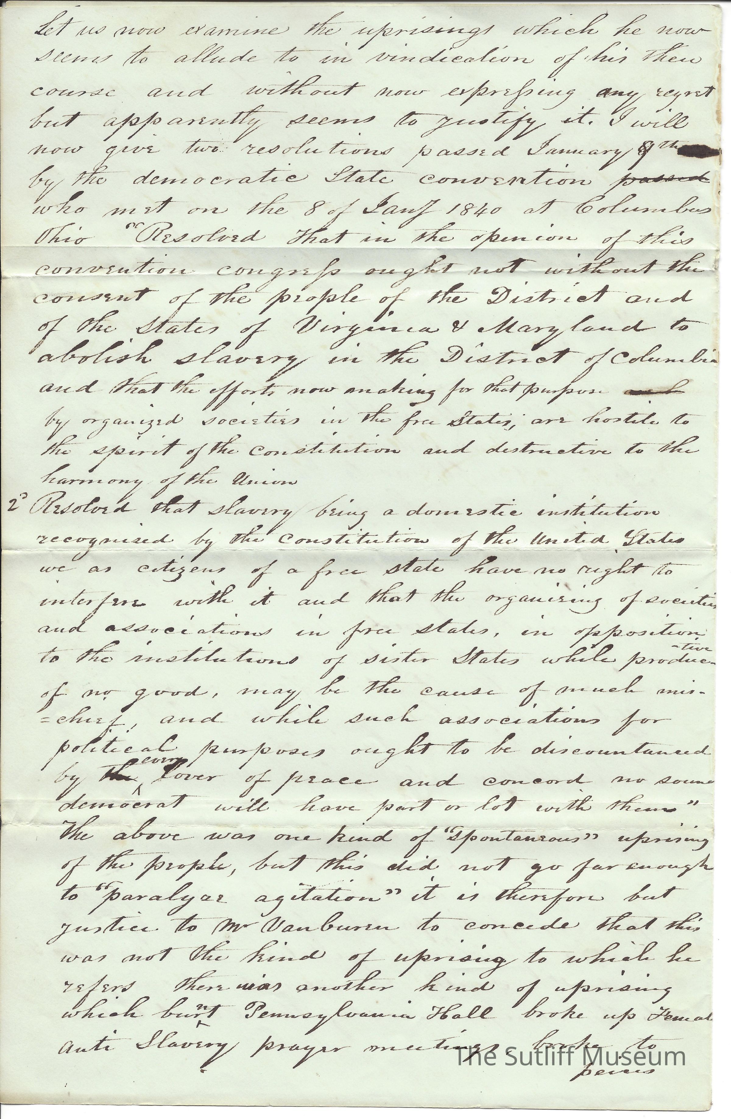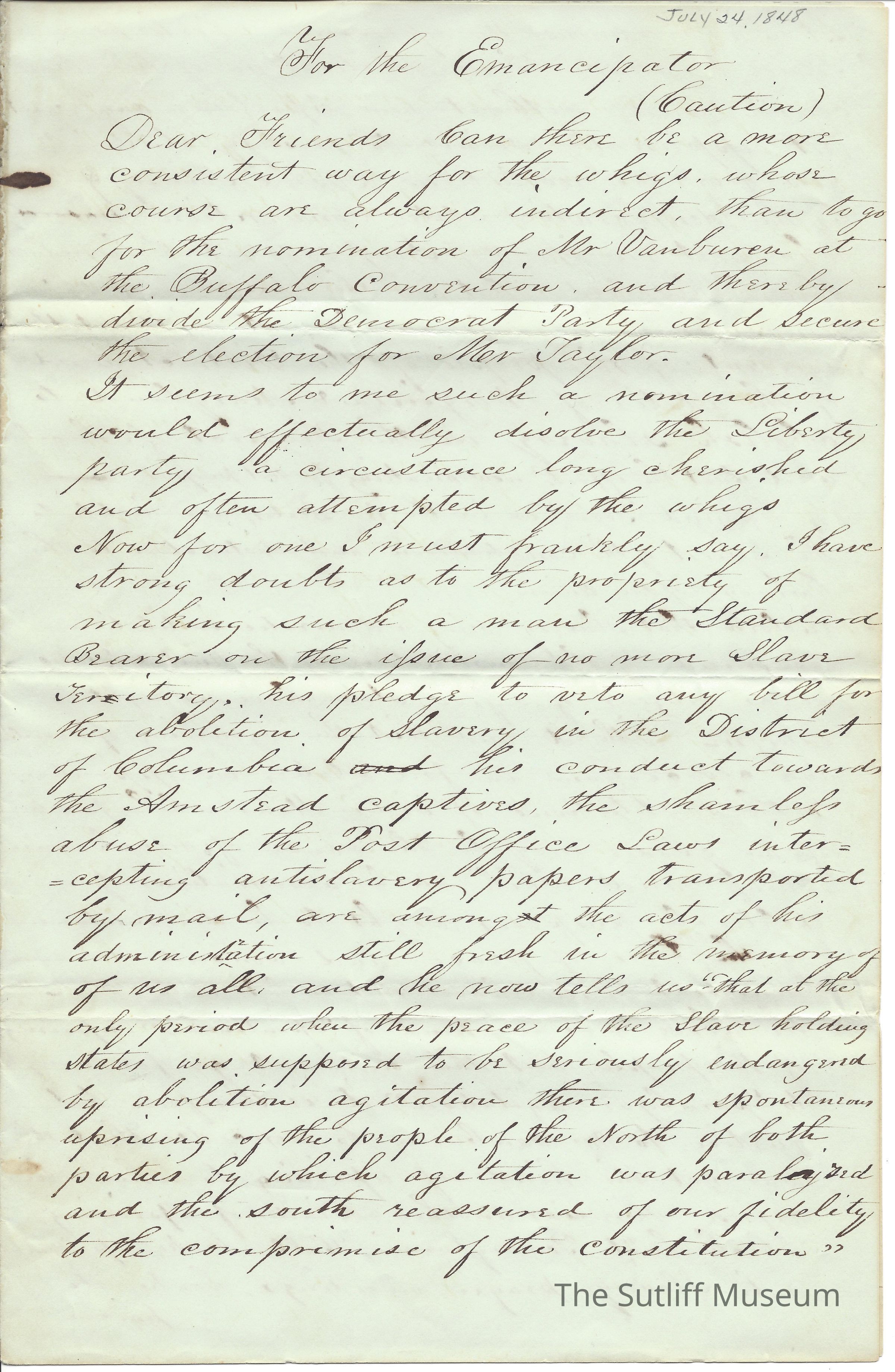 A letter from Levi Sutliff for the Emancipator regarding the Whig party, nominations, and slavery.Collection