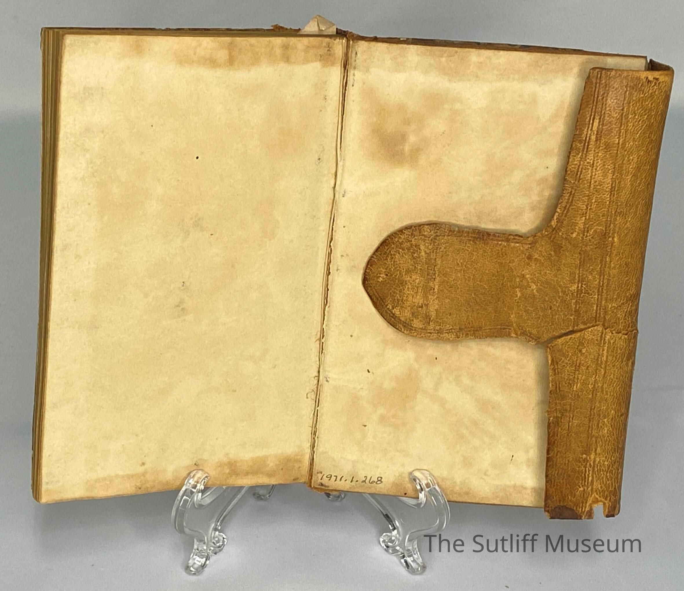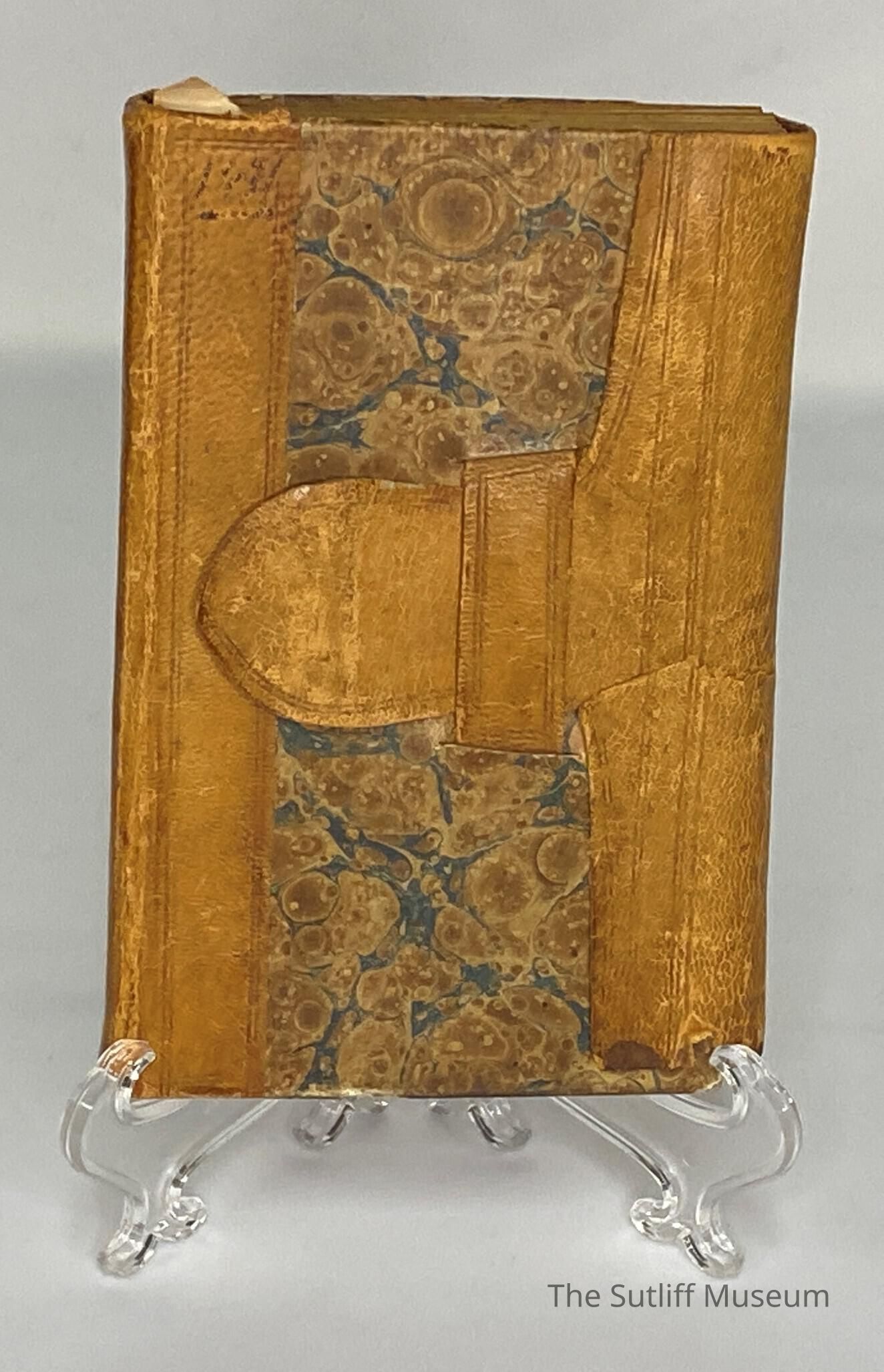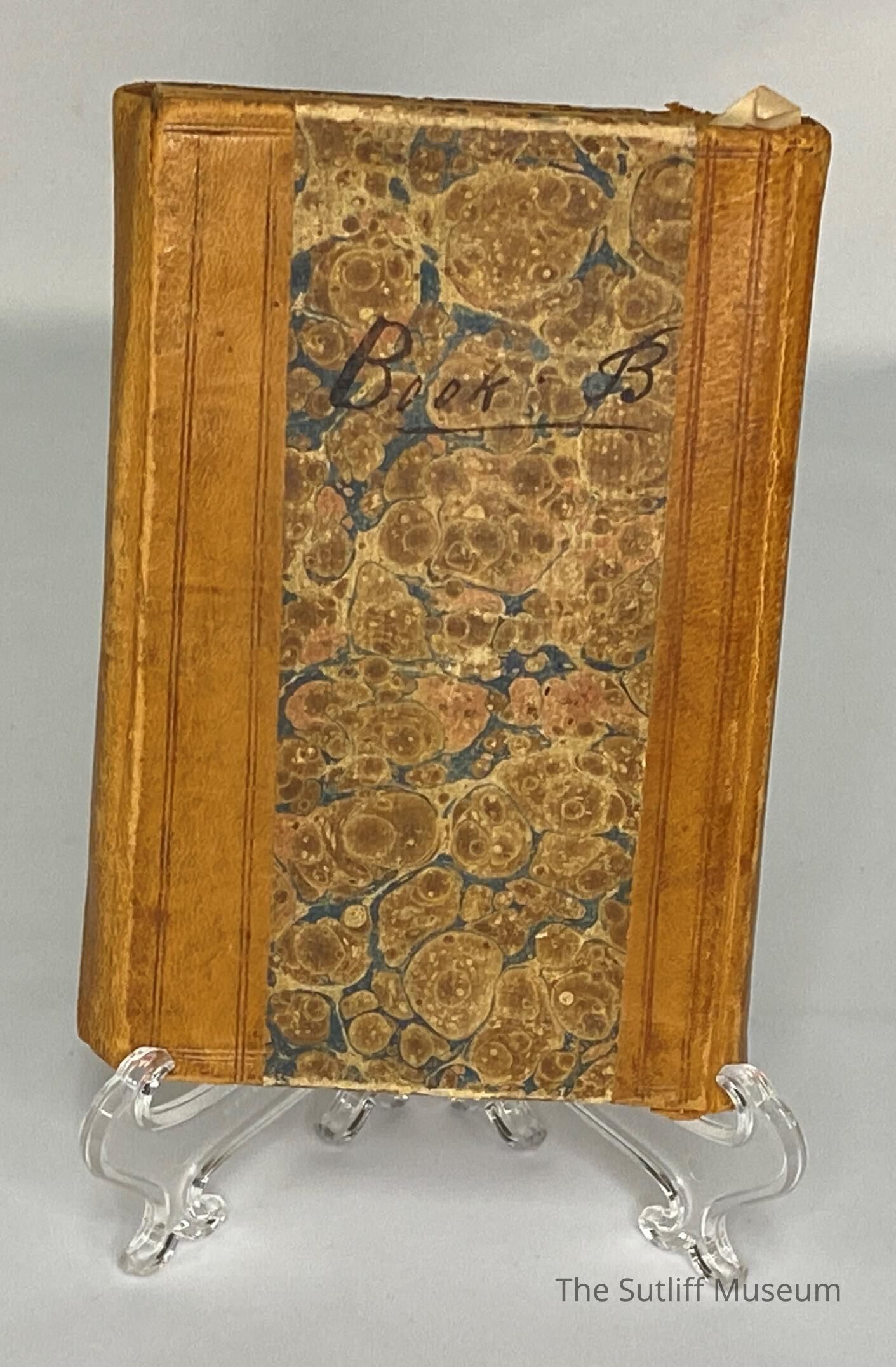 Leather bound account book belonging to Levi Sutliff.Leather spine and tongue and loop closure. Front and back panel have decorative spotting design. On back panel is handwritten "Book B" and on front cover faintly "1831" The inside pages contain names of individuals with whom Sutliff had exchanges of goods and money. Dates, monetary amounts and merchandise is listed.Collection