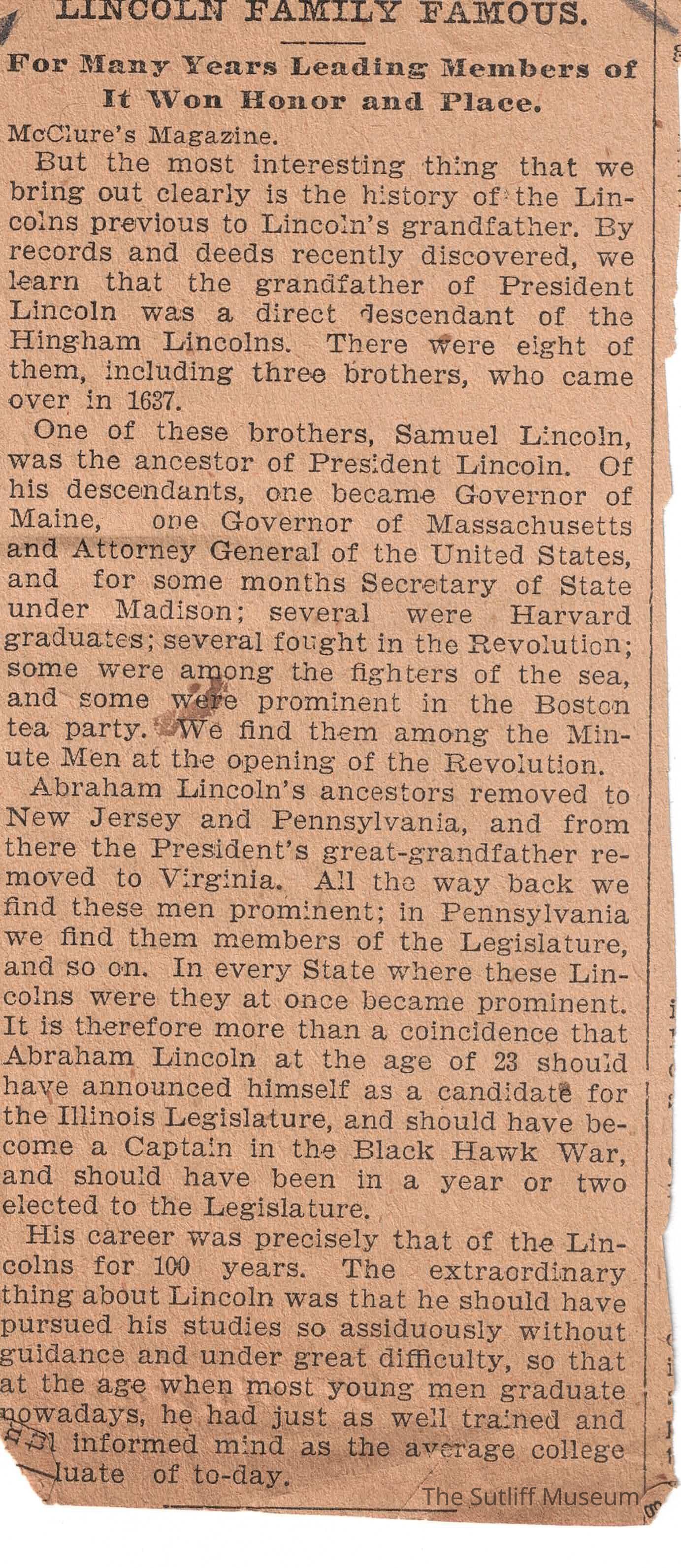 Newspaper clipping with an article titled "Lincoln Family Famous"Collection