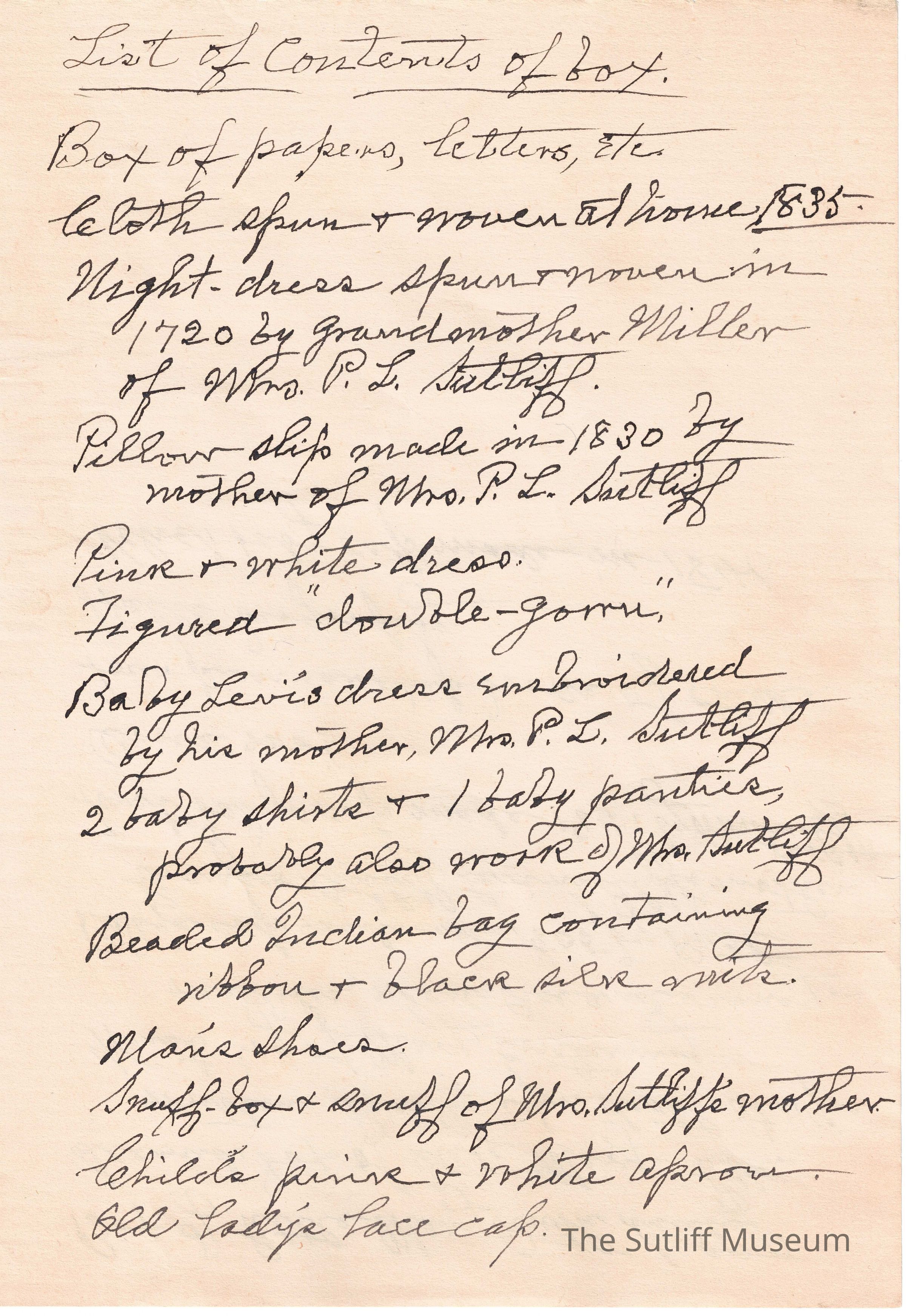 List made by Phebe T. Sutliff regarding the contents of a box.Relationships
