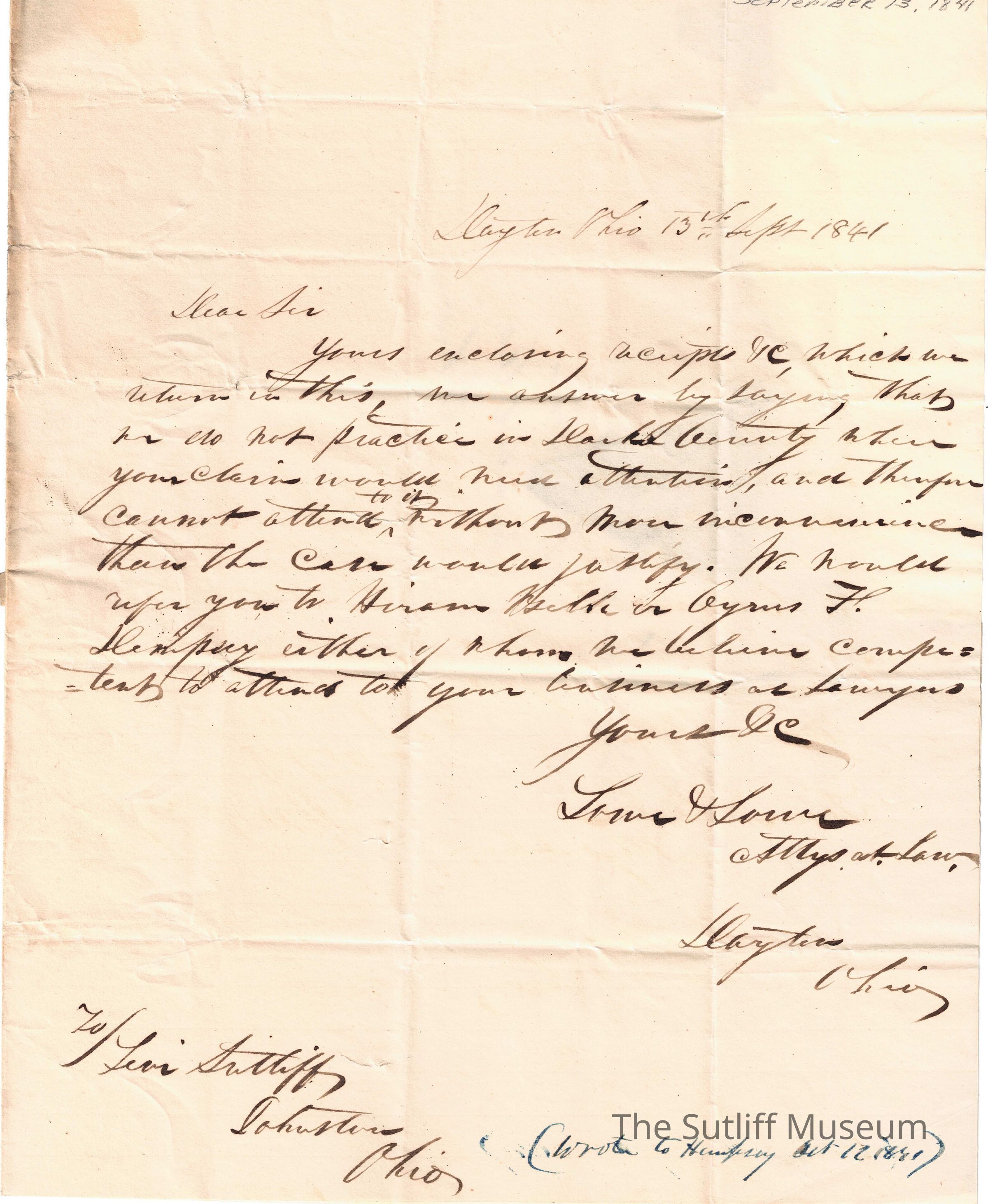 A letter from Lowe & Lowe to Levi Sutliff regarding legal issues.Collection