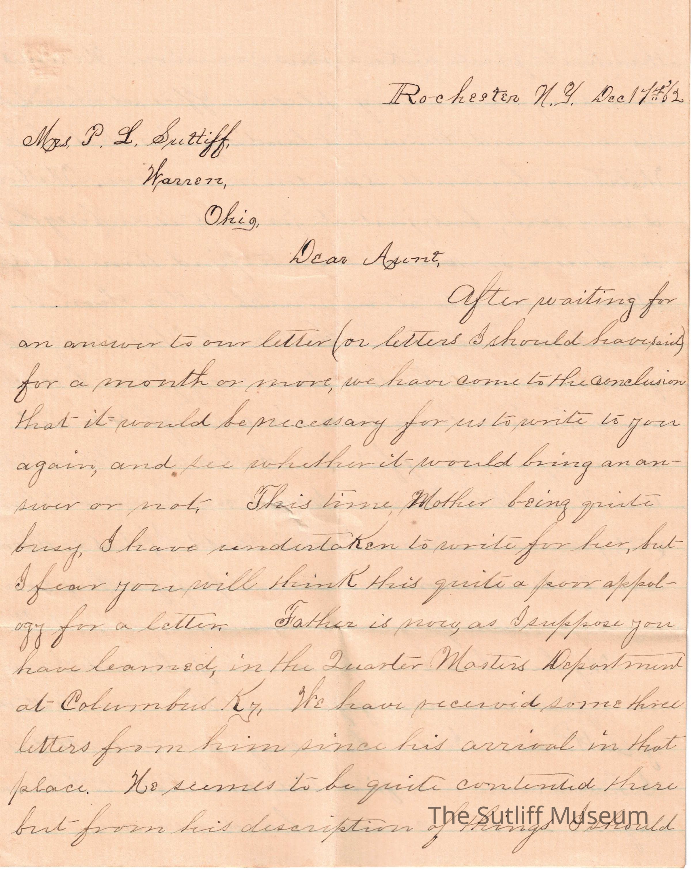 A letter from Lucien Jones to his aunt Phebe Lord Marvin Sutliff regarding not receiving an answer to his previous letters, and updates on his side of the family and his business.Collection