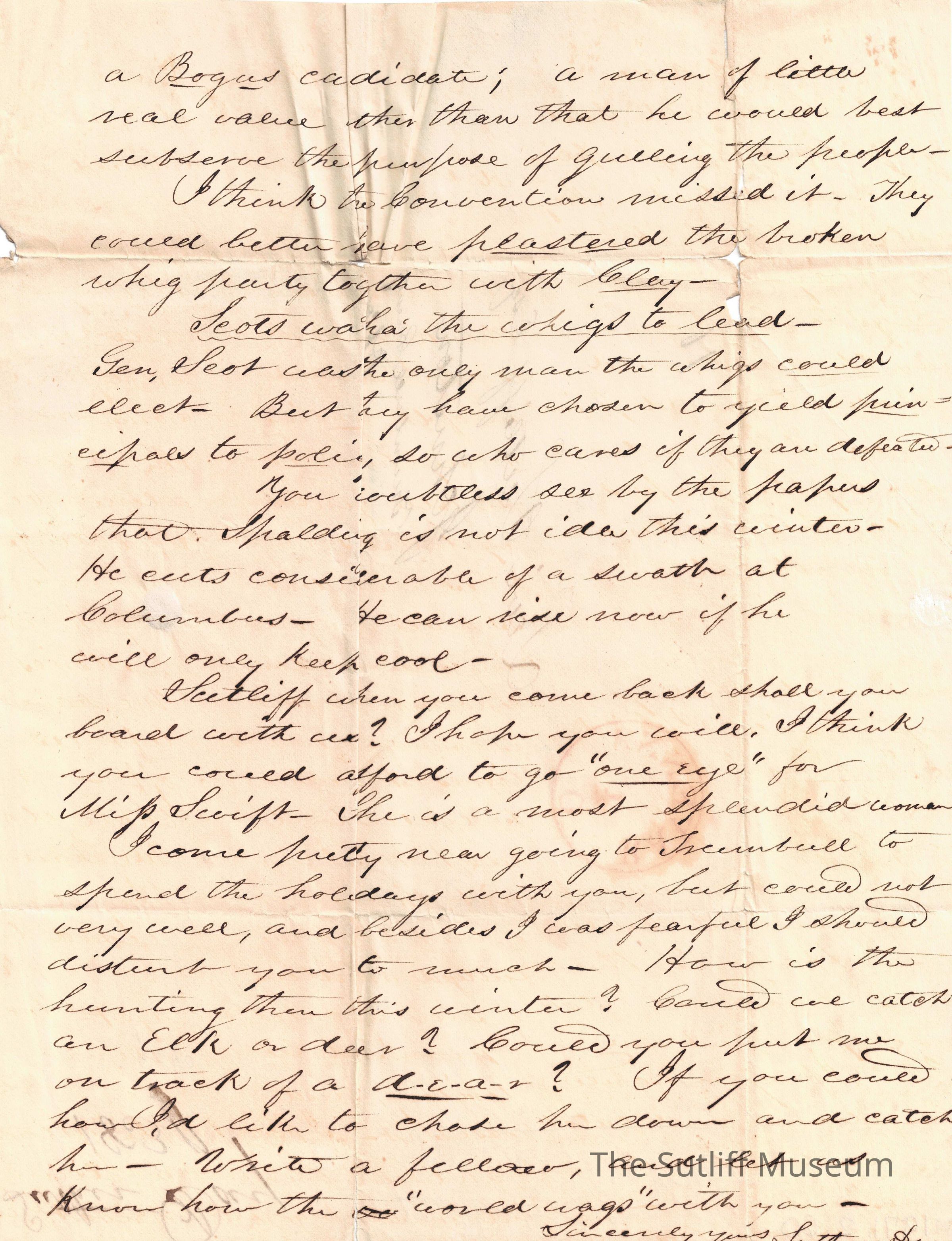 Letter from Luther Day to Levi Sutliff. Day writes to Sutliff regarding the "dark eyed girl" and his fantisies of her. He also writes of his studies and of becoming a lawyer. Day writes about his family, especially Selby, who is sticking with his studies, working early and late. Day asks Sutliff to room in the "haunted garret" with him once Swift leaves. Day inquires of Sutliff's thoughts on the nomination of the "great Convention".Collection