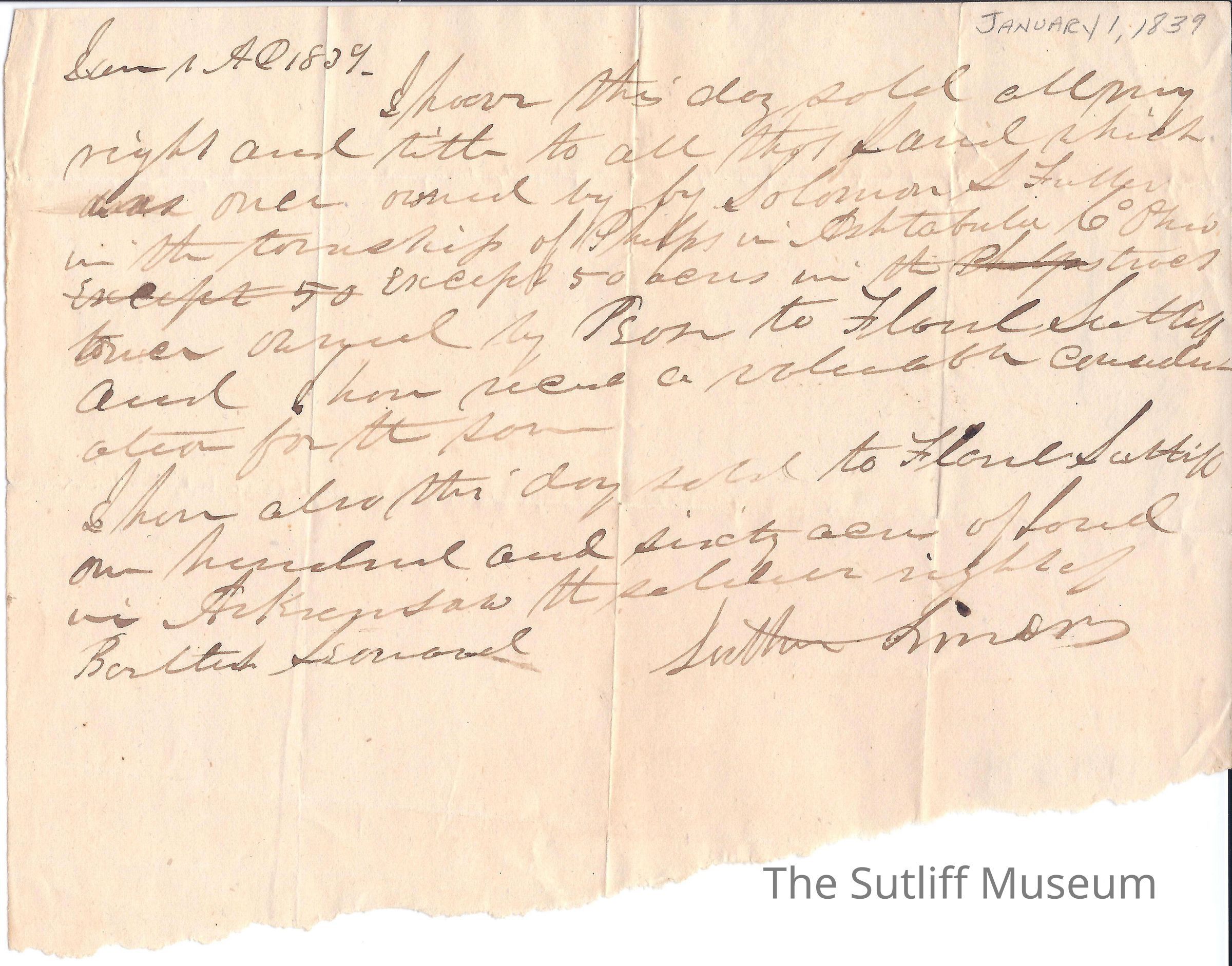 Letter from Luther Limon to Flavel Sutliff. Limon's testimony that he sold land in Ashtabula to Solomon Fuller and land in Arkansas to Flavel Sutliff.