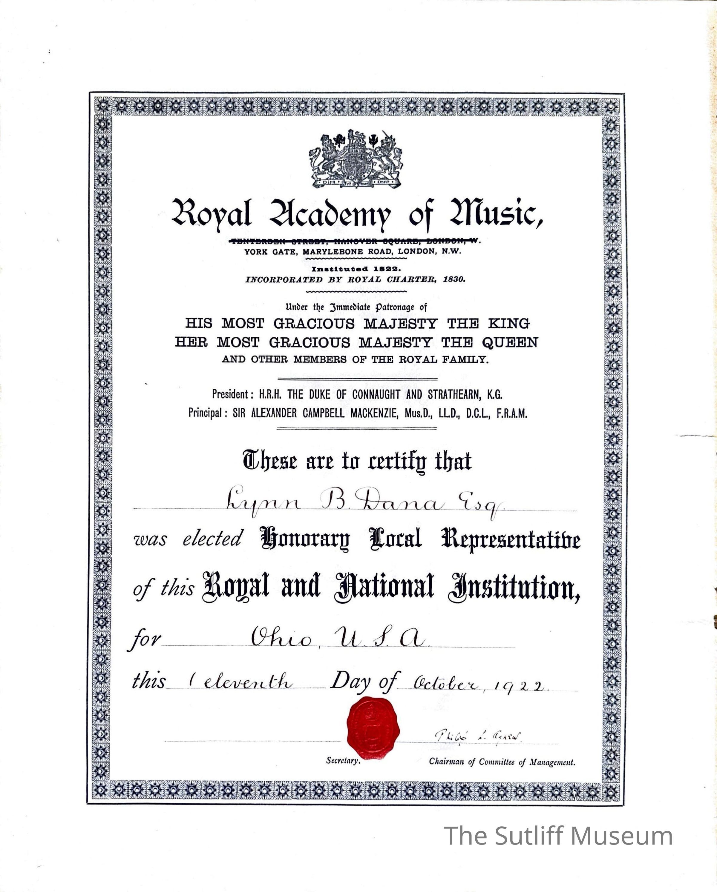 Lynn B. Dana certification from Royal Academy of Music certifying him as an elected honorary local representative. Dated October 11, 1922.Collection