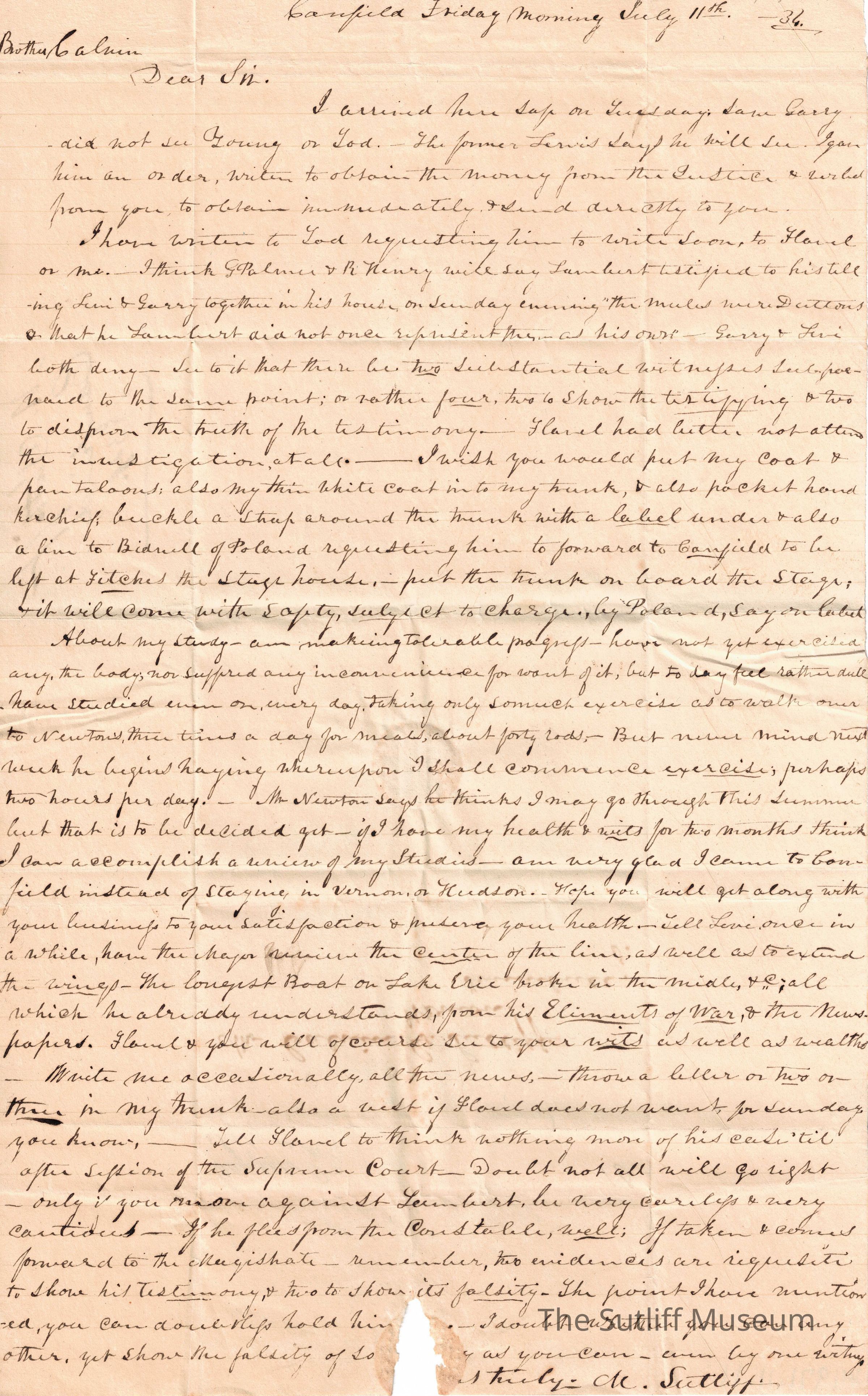 A letter from Milton Sutliff to Calvin Granger Sutliff regardingRelationships