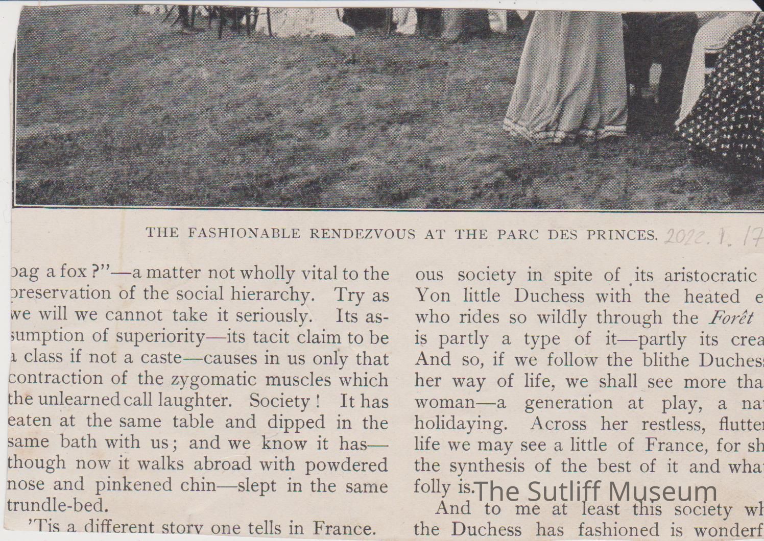 Clipped photograph from magazine. Photograph depicts foxhunt, including men and women in period dress, some men on horses, and dogs (potentially beagles)