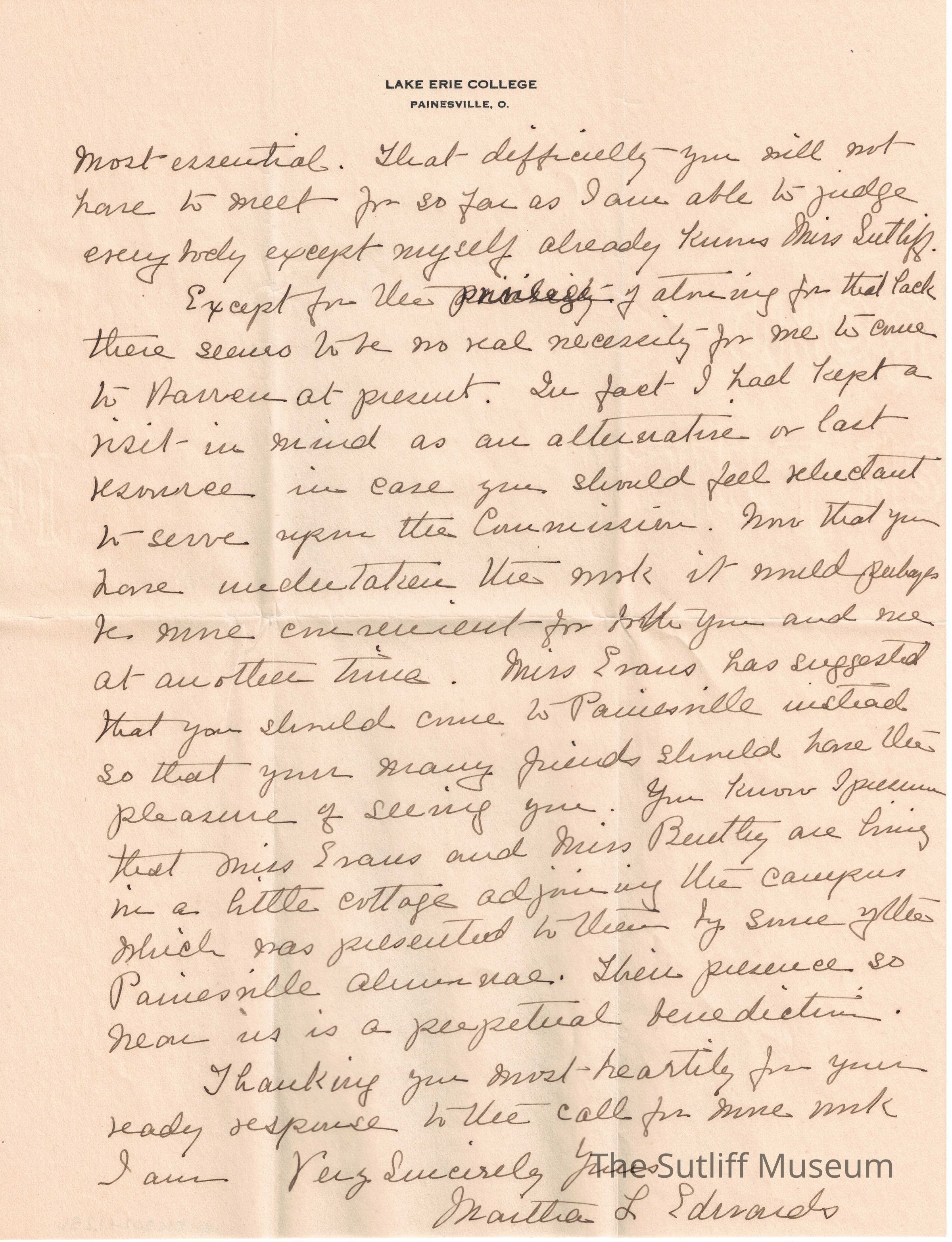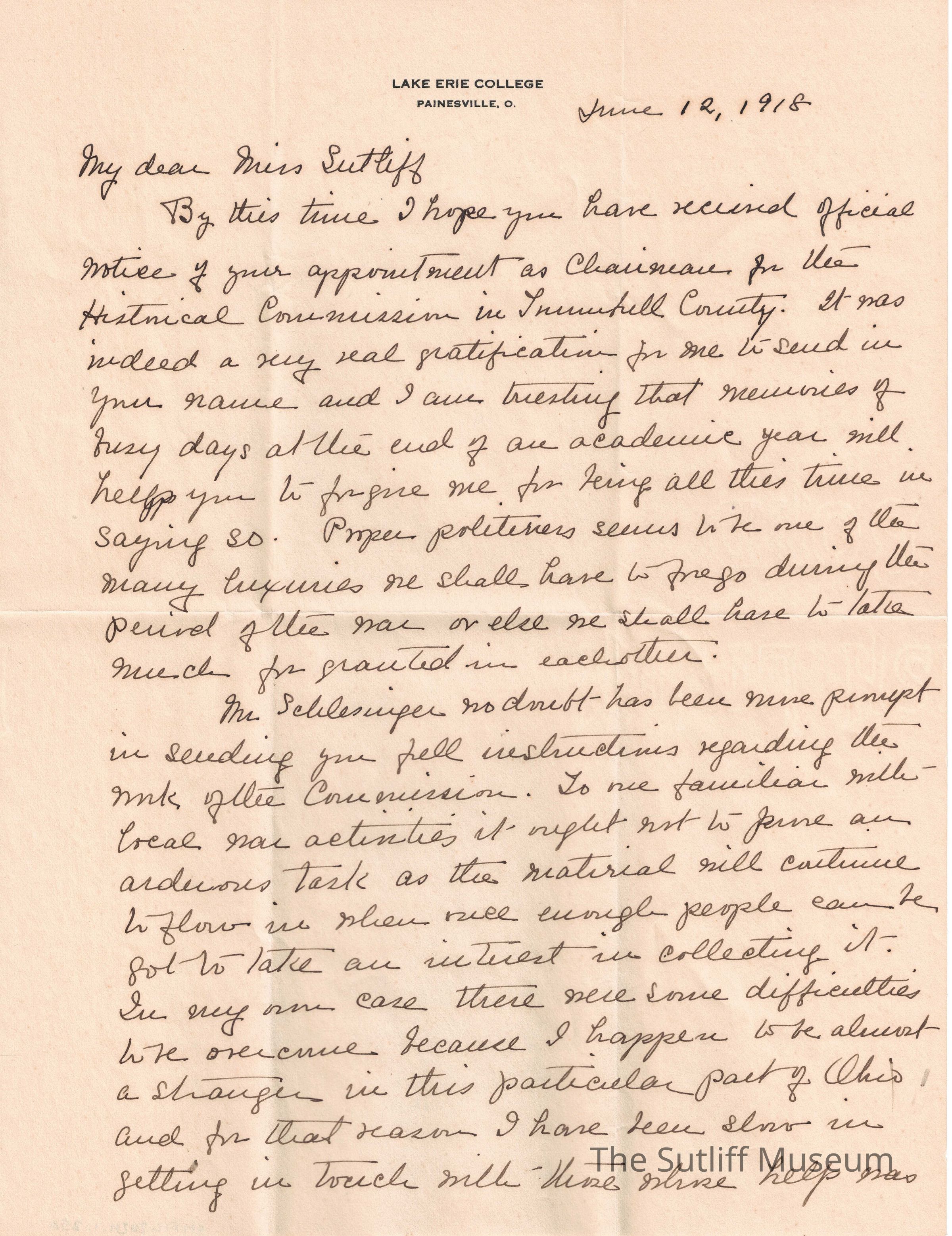 A letter from Martha L. Edwards to Phebe T Sutliff following the official appointment of Phebe as the Chairman of the Historical Commission in Trumbull County.Relationships