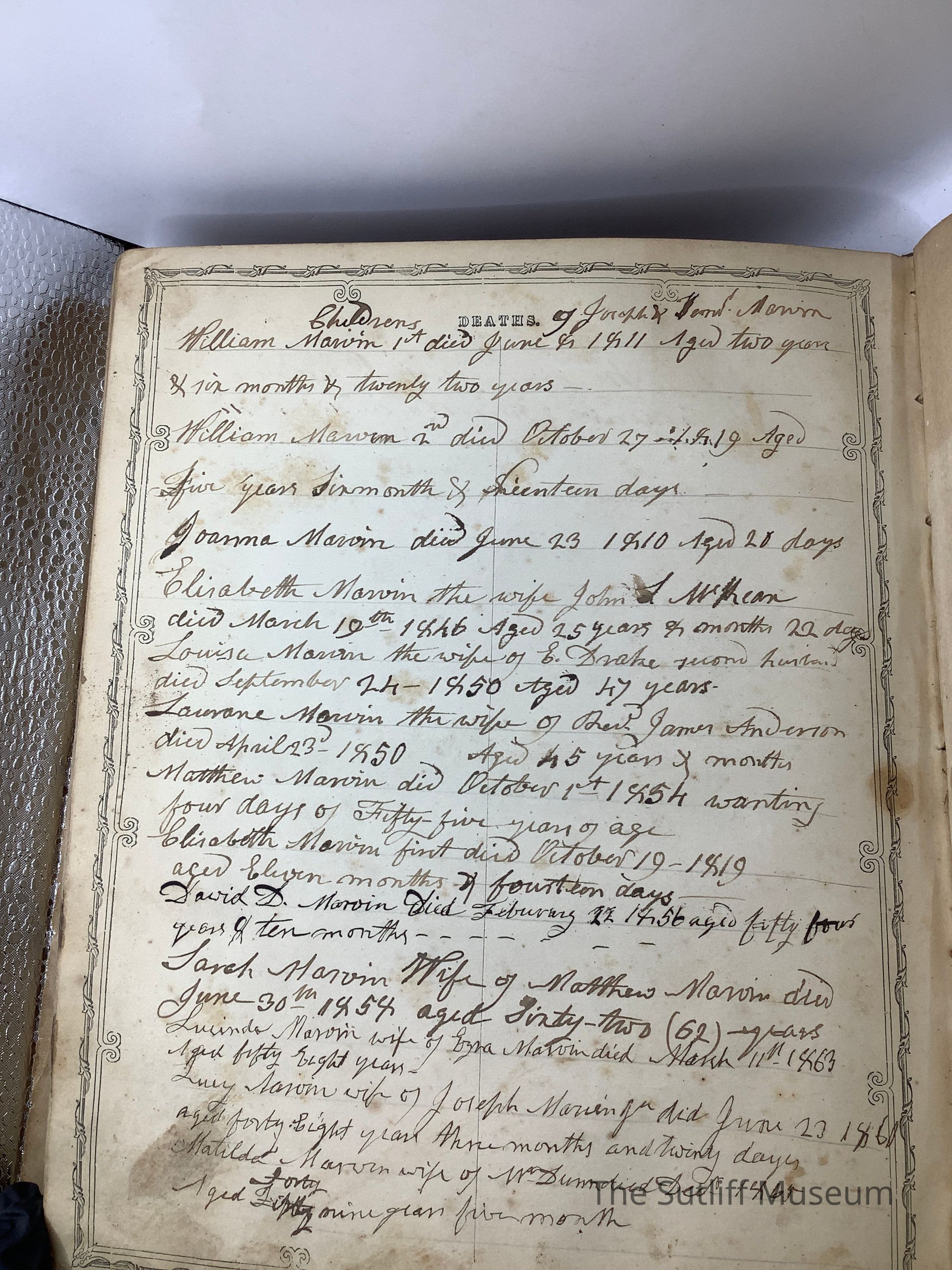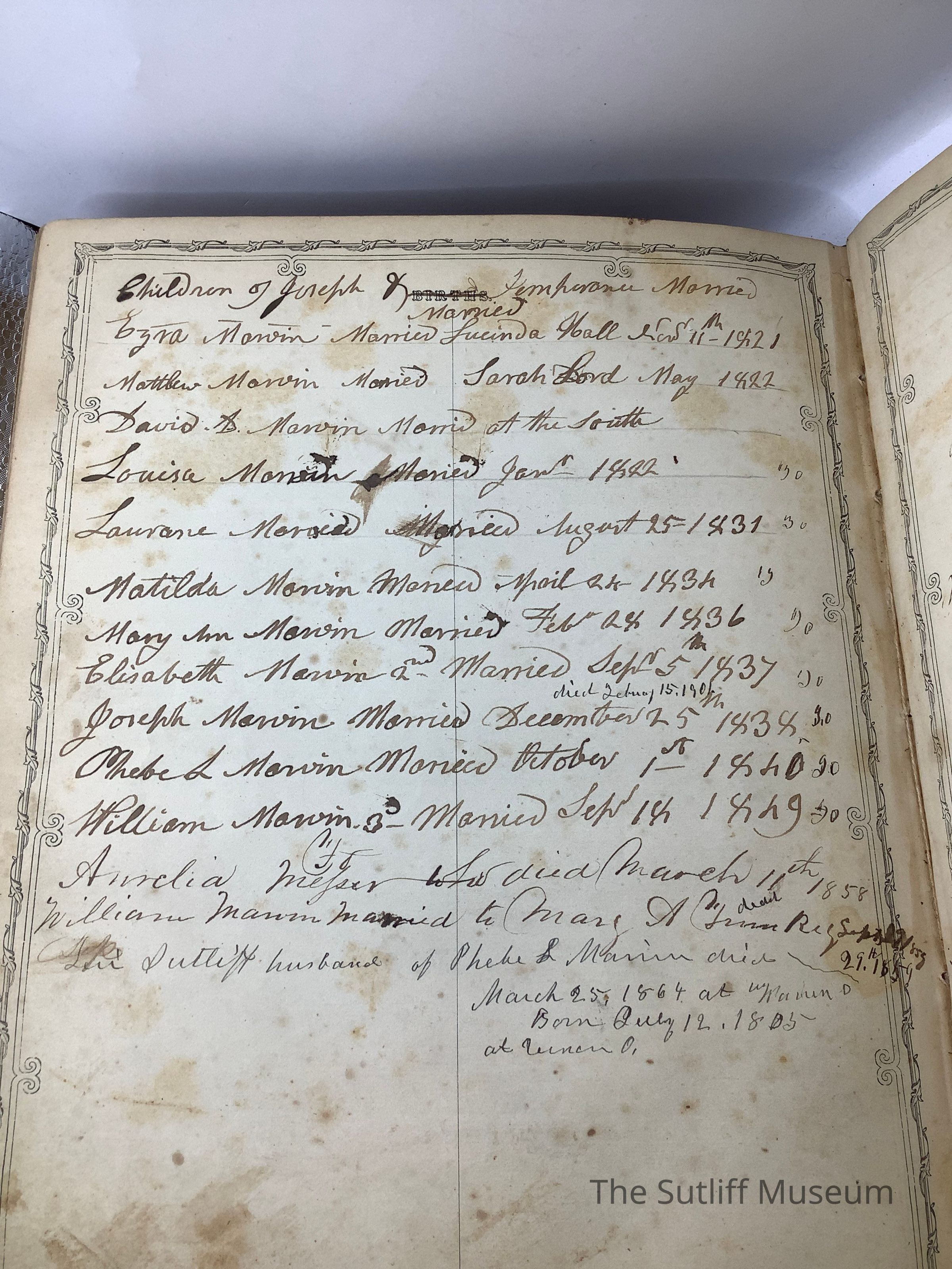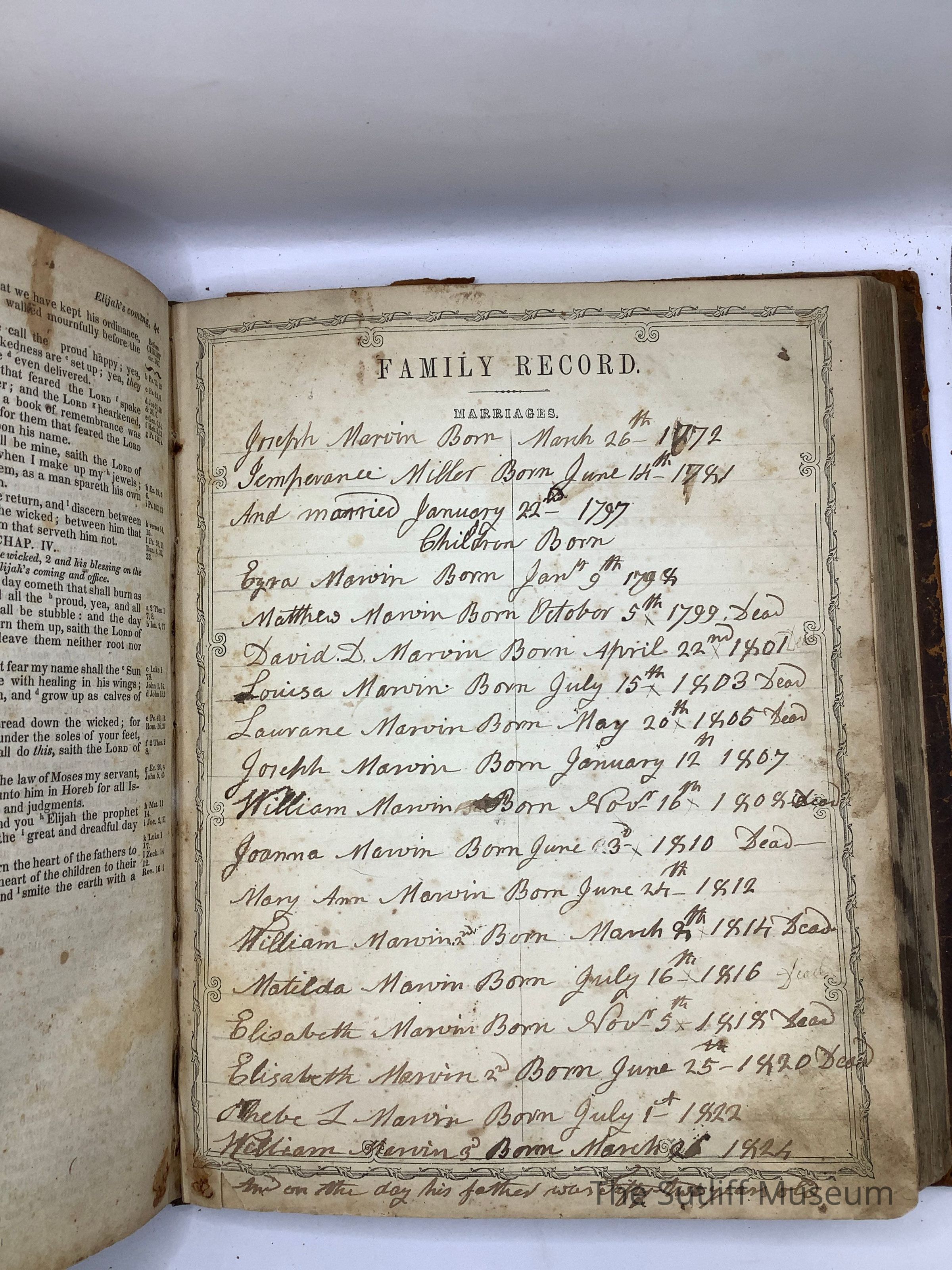Bible belonging to Temperance Marvin in June 1855. Inside contains note: