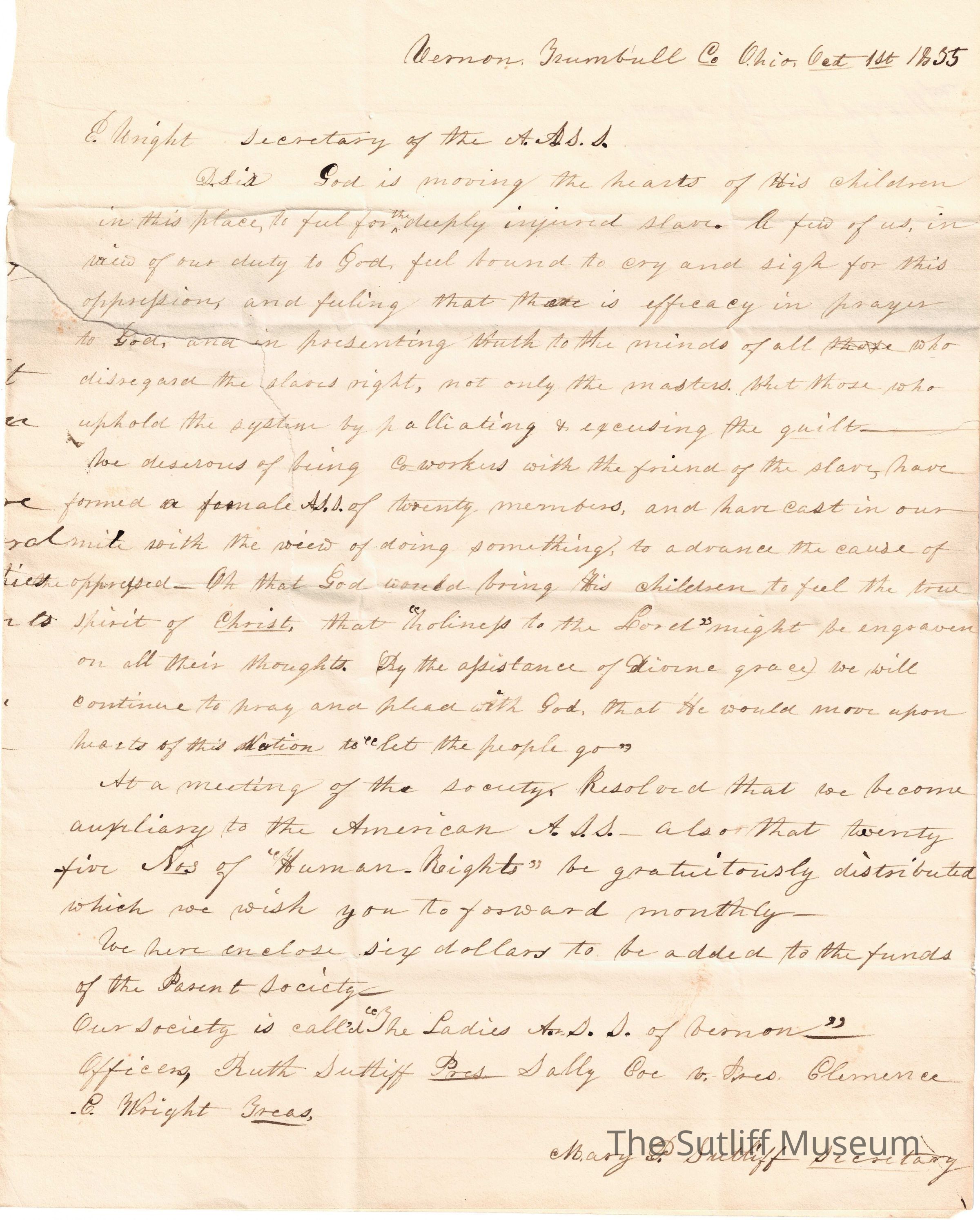 A letter from Mary Plumb Sutliff to E. Wright regarding her concerns about slavery.Collection