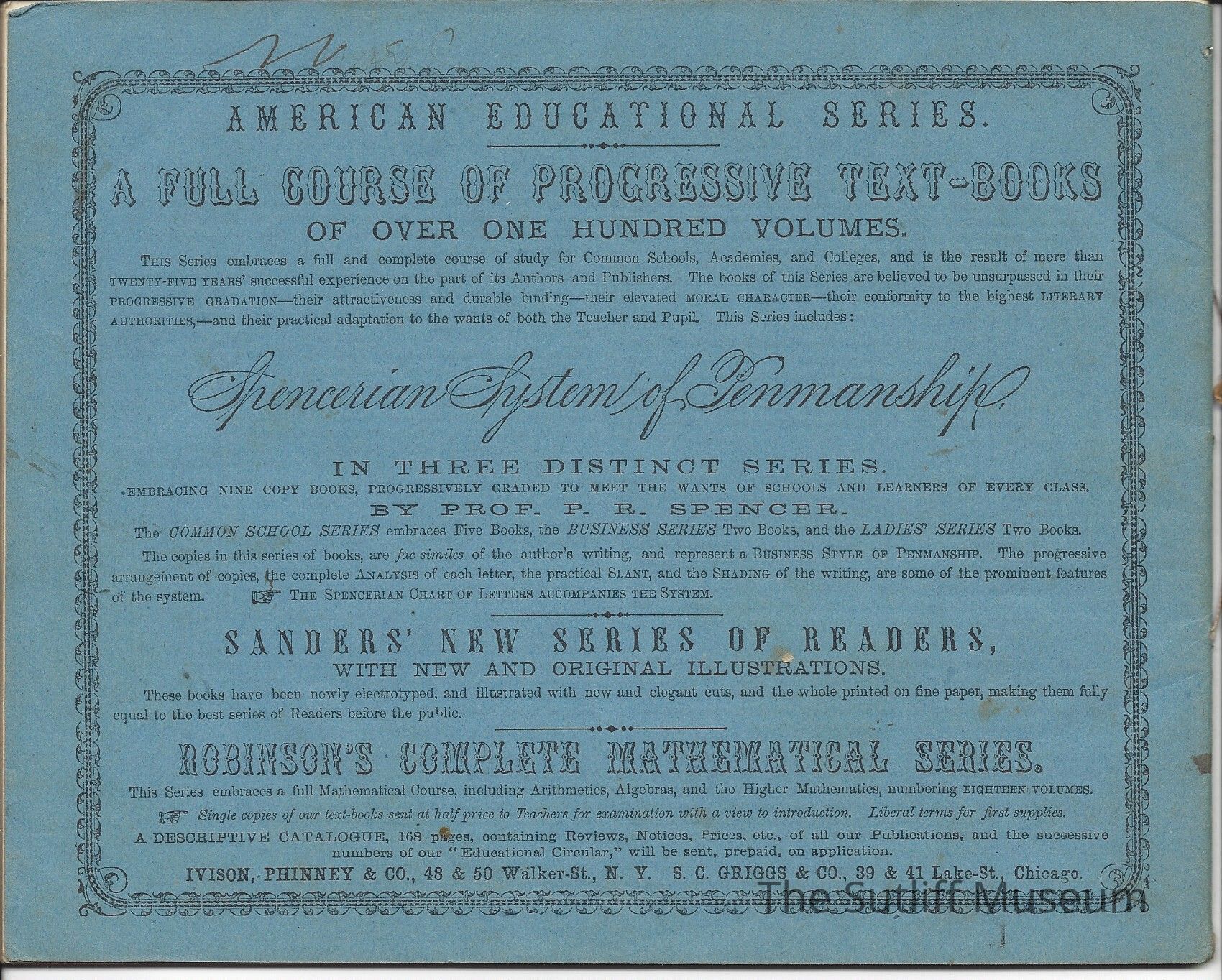 Spencerian System Practical Penmanship book. Blue soft cover with decorative black border and black text. On front cover is rectangular box with space for students to place name. "Mary R. Sutliff" has been handwriten in box and on side "Mary Ruth Sutliff Warren Ohio"