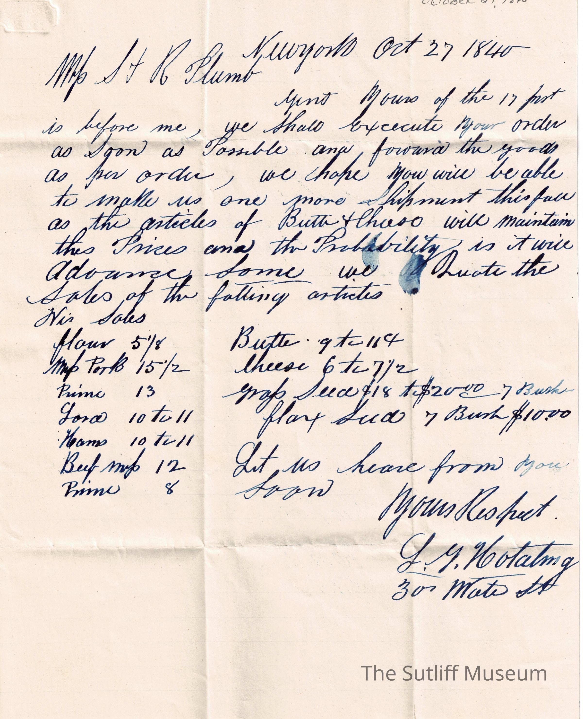 A letter from Leonard G Hotating to Samuel and Ralph Plumb regarding an update on sales and shipments.Collection