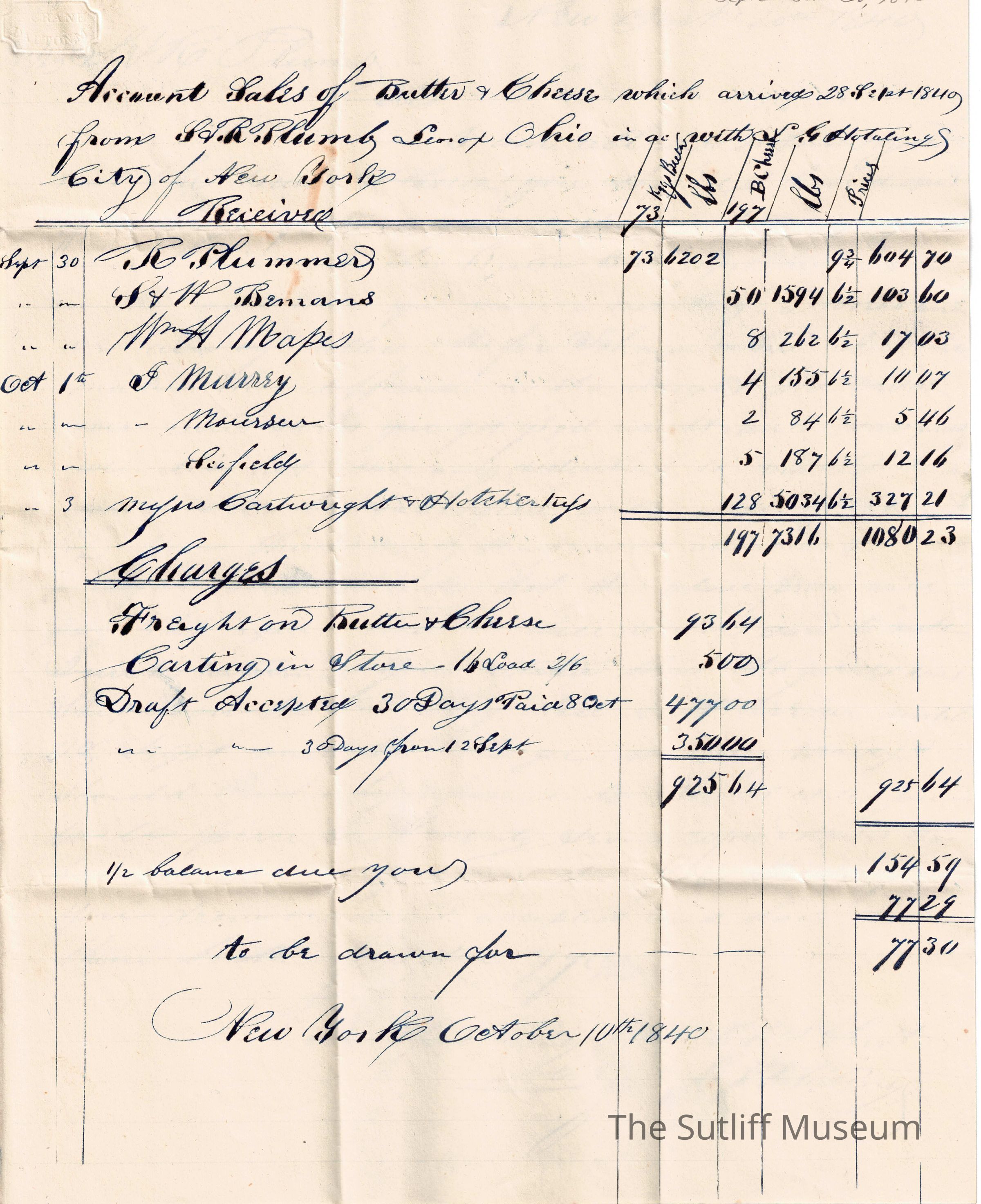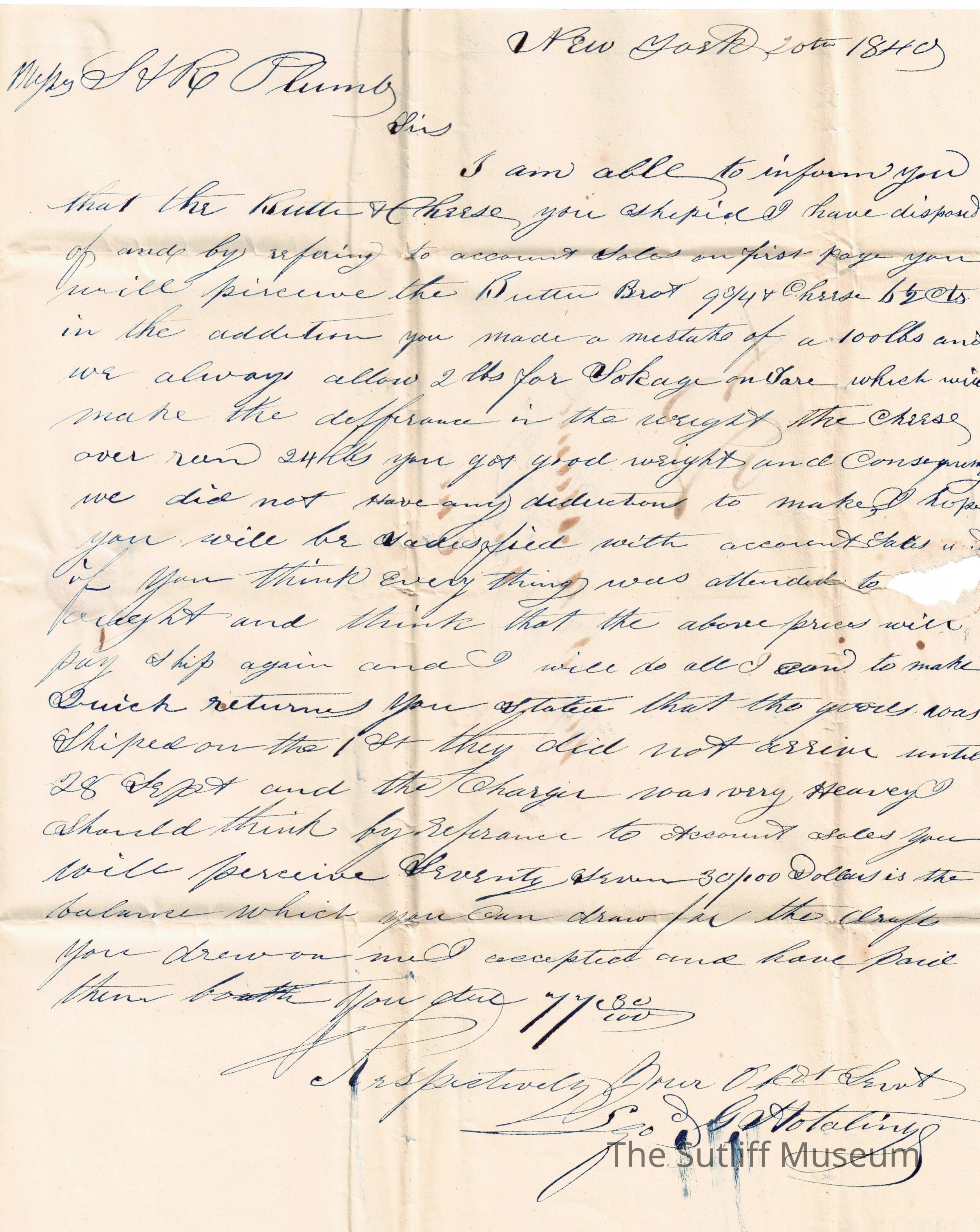A letter from Leonard G Hotating to Samuel and Ralph Sutliff regarding an updated price list and an account of what sold.Collection