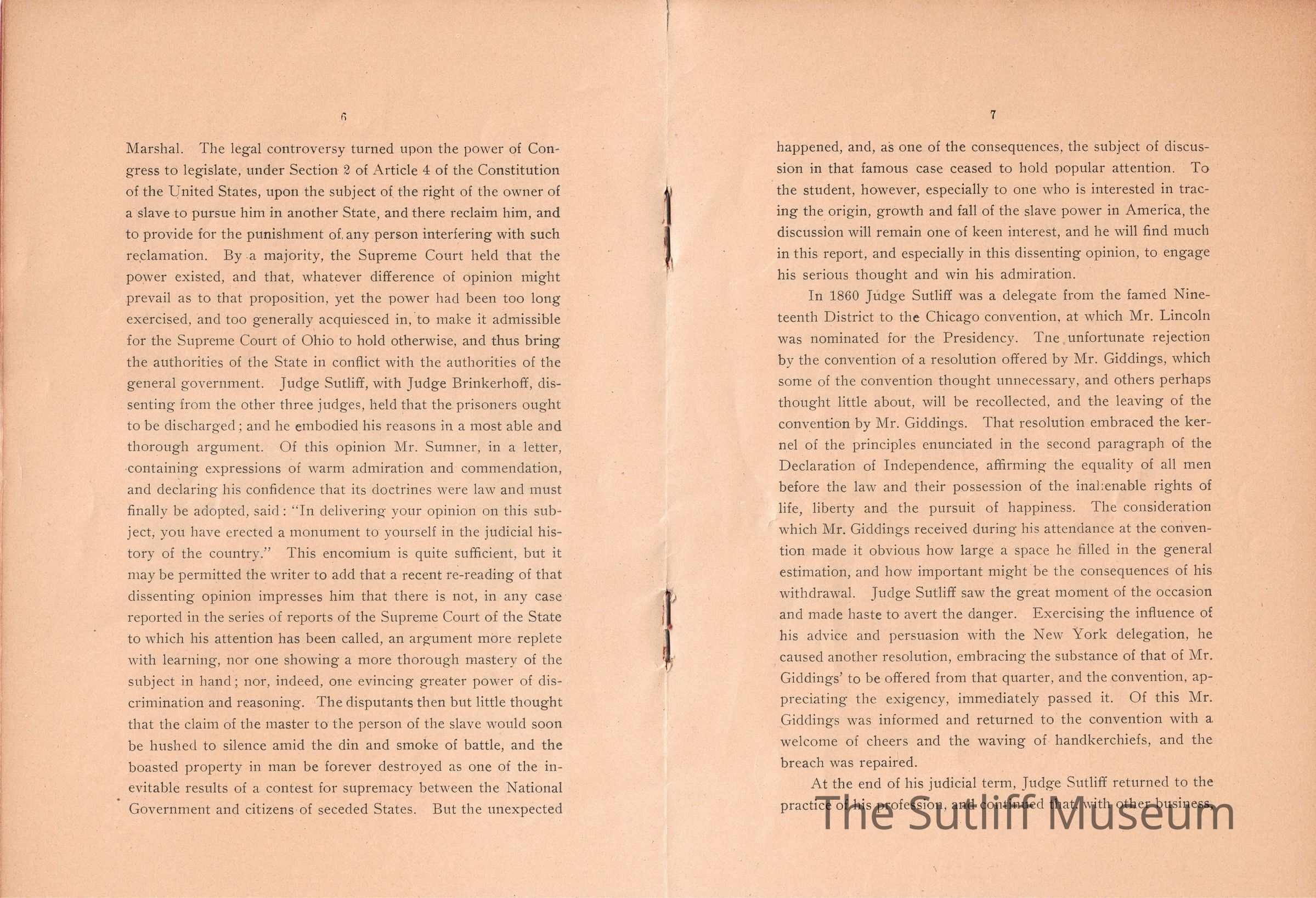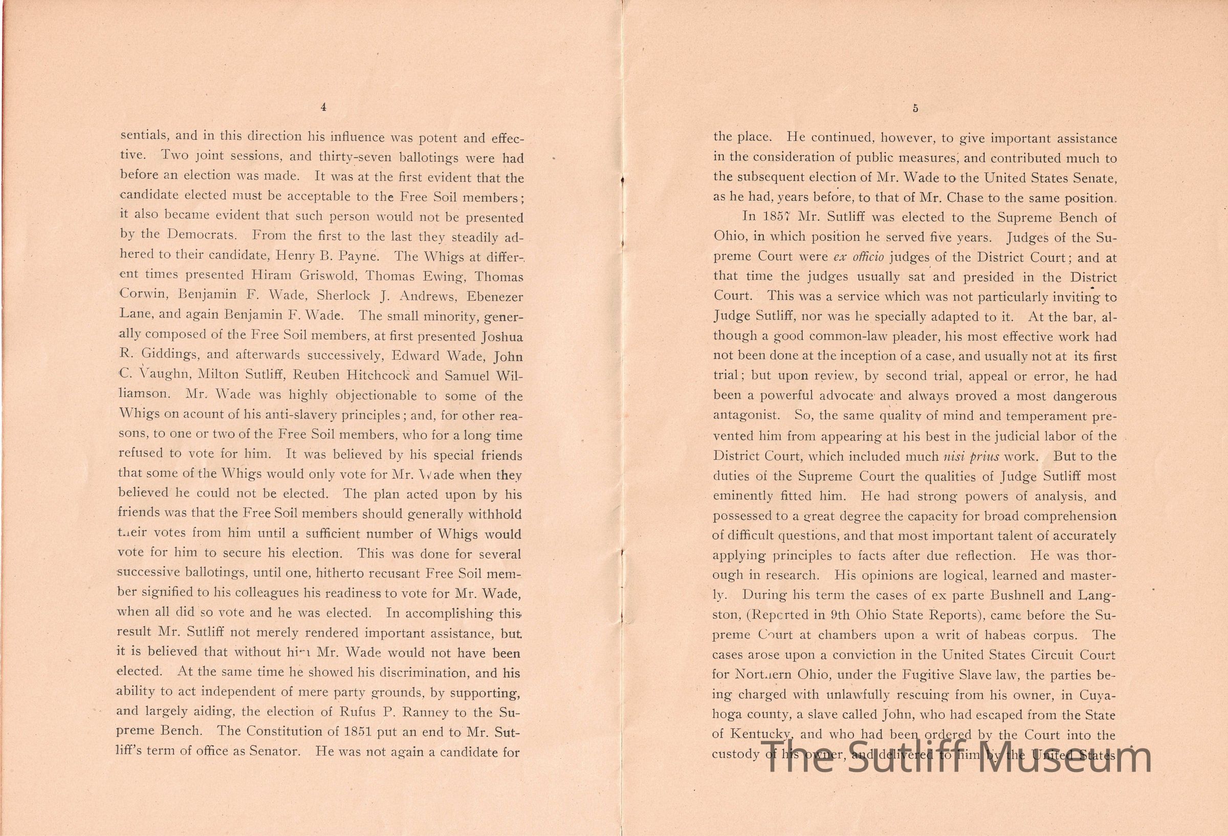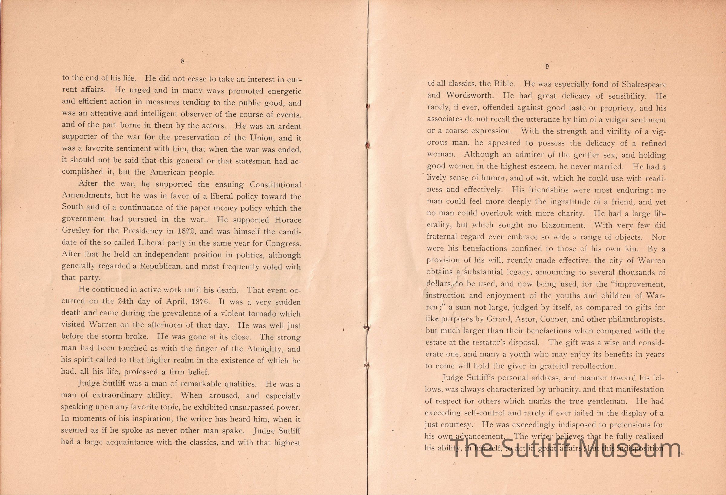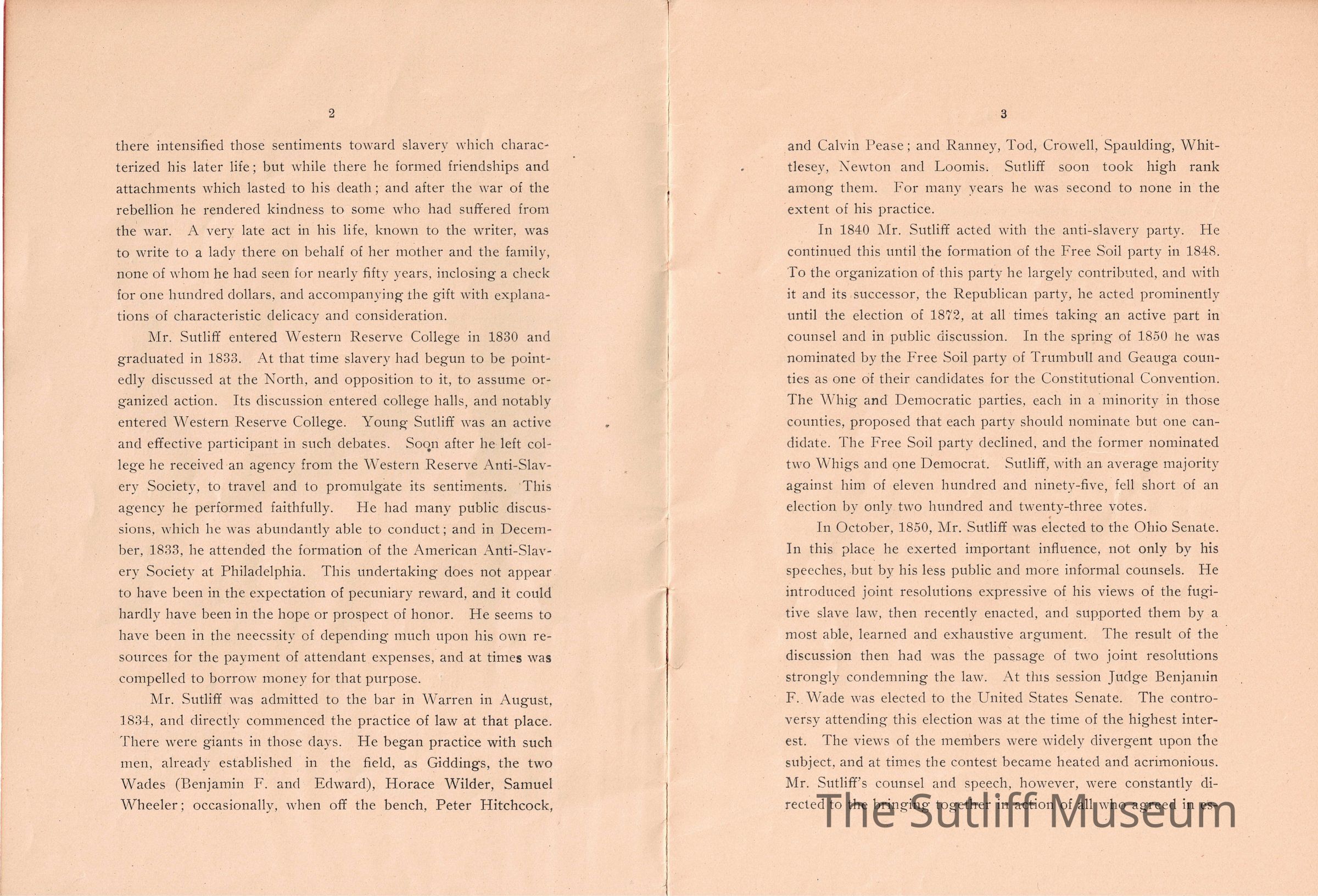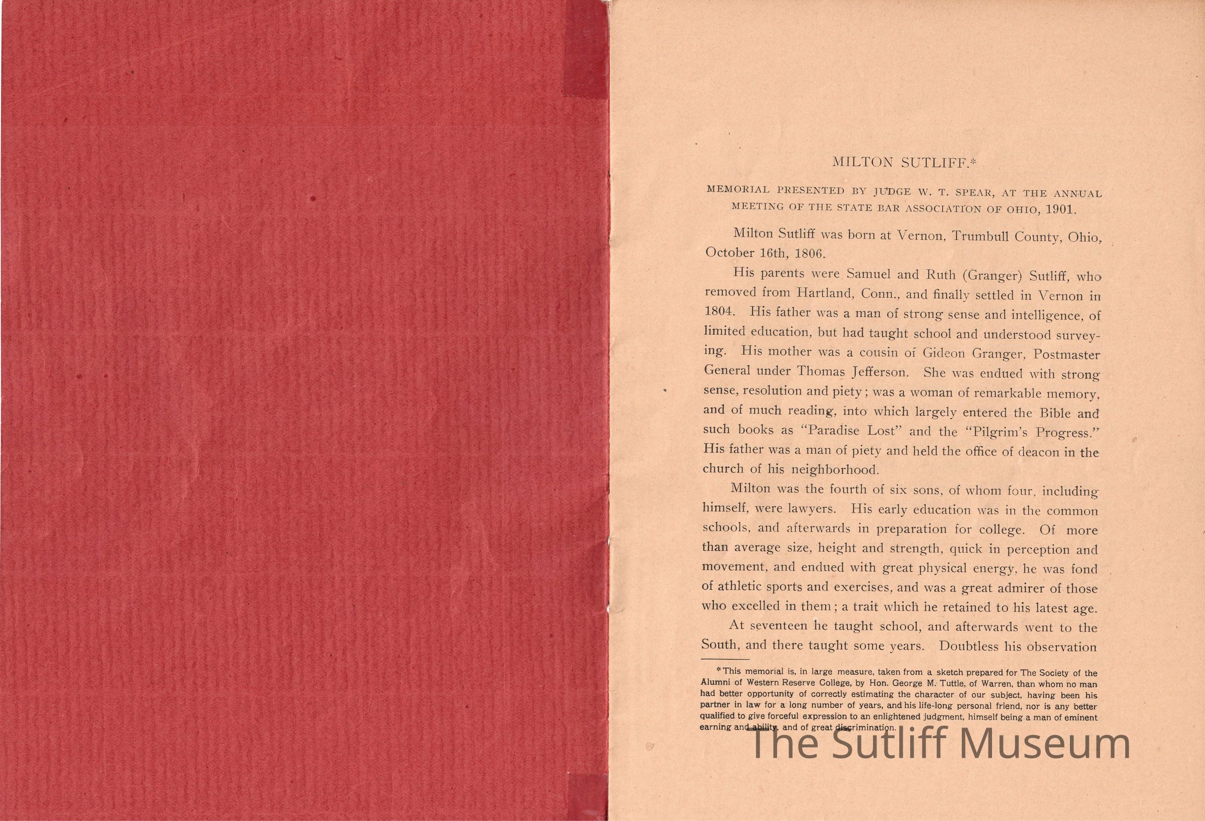 A memorial for Milton Sutliff read by Judge W.T. Spear at the 1901 Annual Meeting of the State Bar Association of Ohio describing his life and importance to the Bar Association.Collection