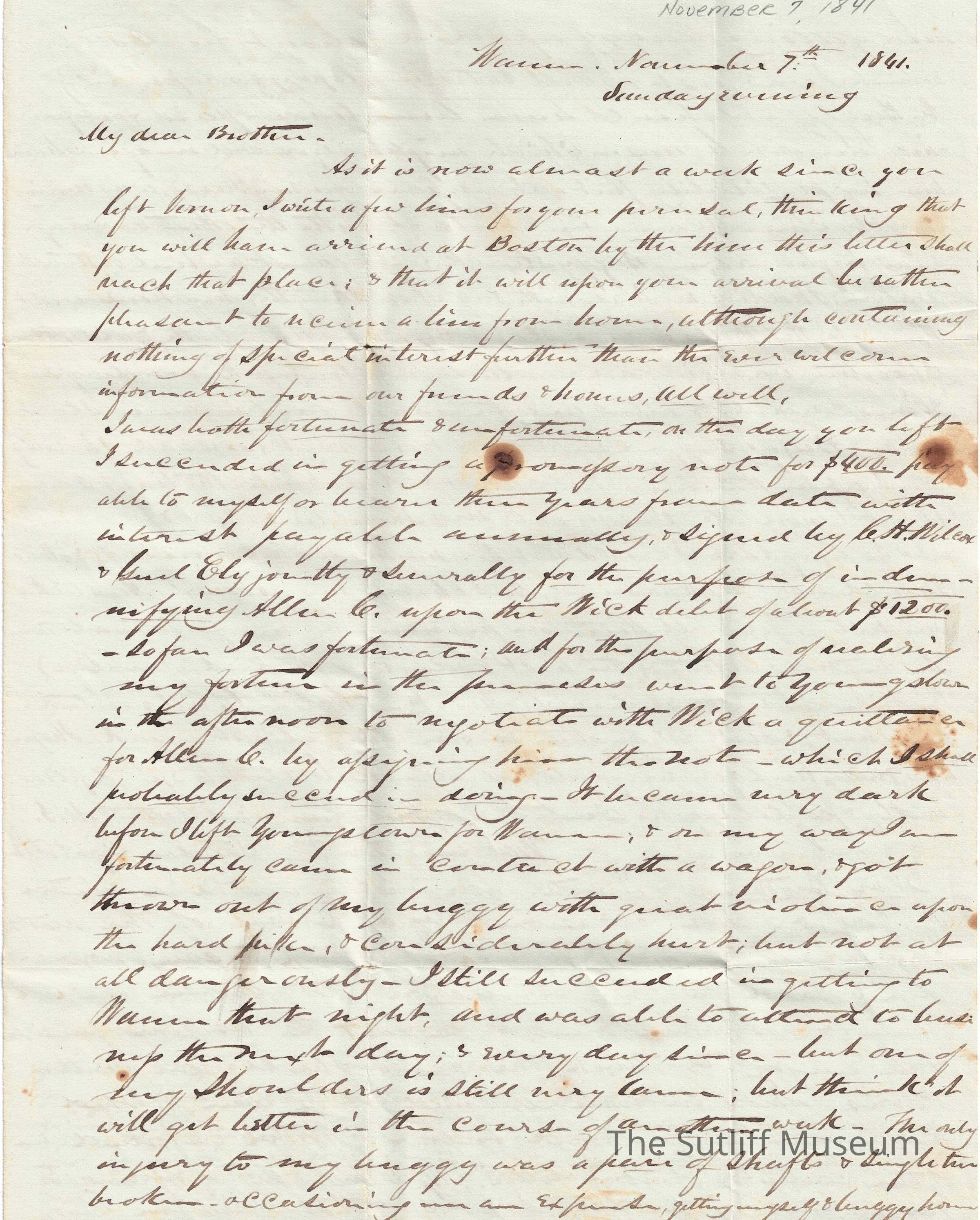 Letter #1 from Milton Sutliff to Flavel Sutliff regarding money and debt and updates since Flavel's visit.