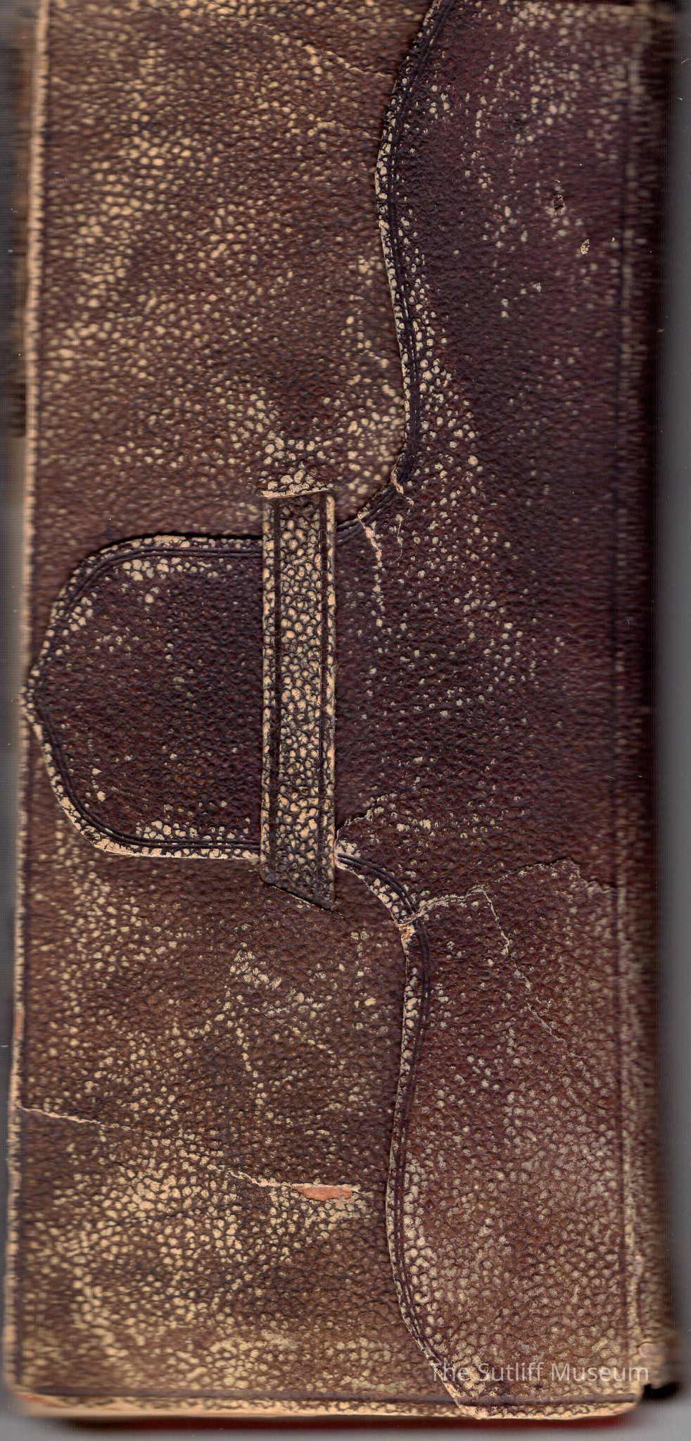 brown bound notebook with sheets of blue lied paper, pencil writing on front page and inside cover, a pocket in pack, a pen holder, contains newpapers glued to pages 7" x 3.25"Collection