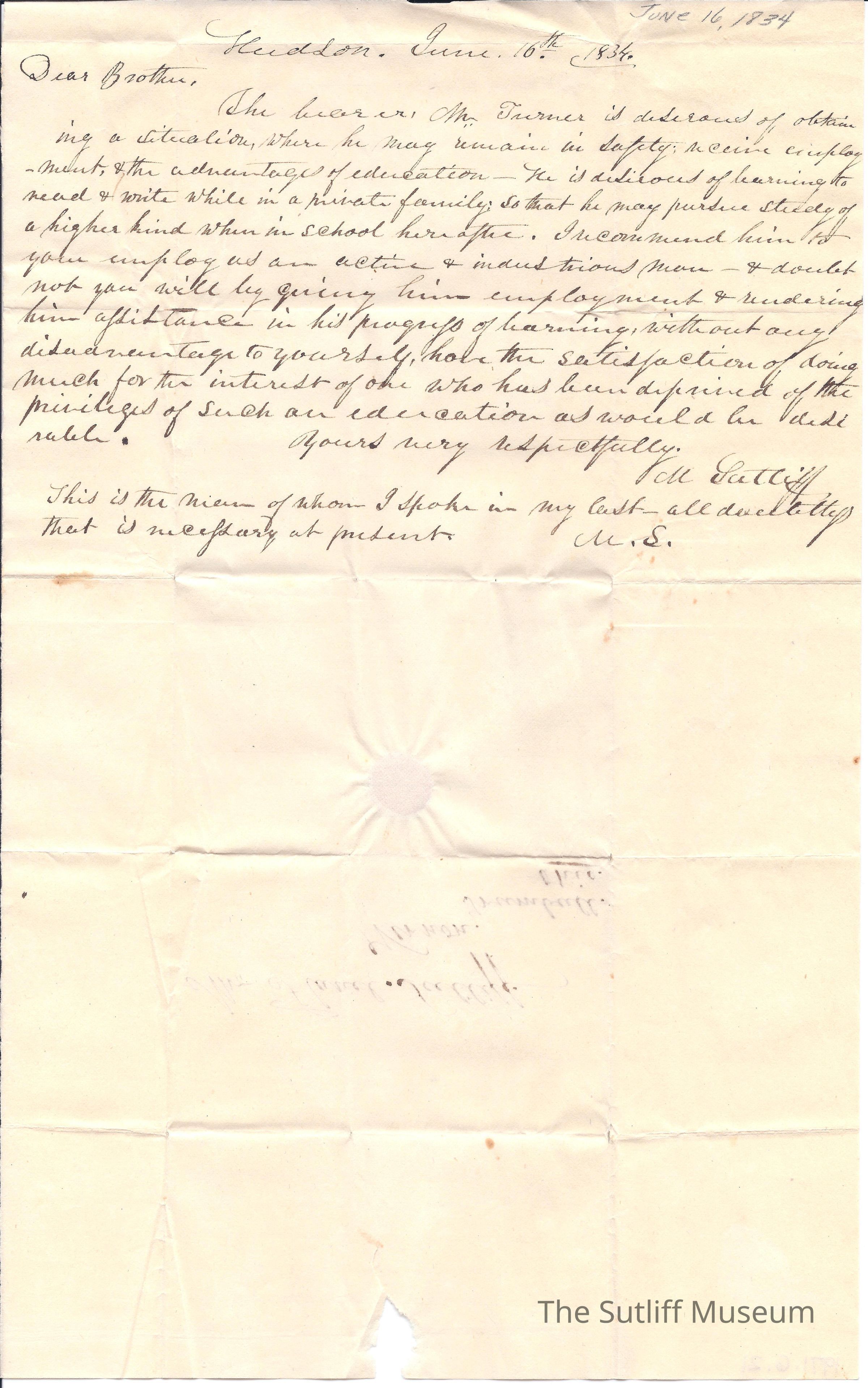 Letter from Milton Sutliff to Flavel Sutliff as a Letter of introduction and recommendation for a coloured man by the name of Mr. Turner.Collection