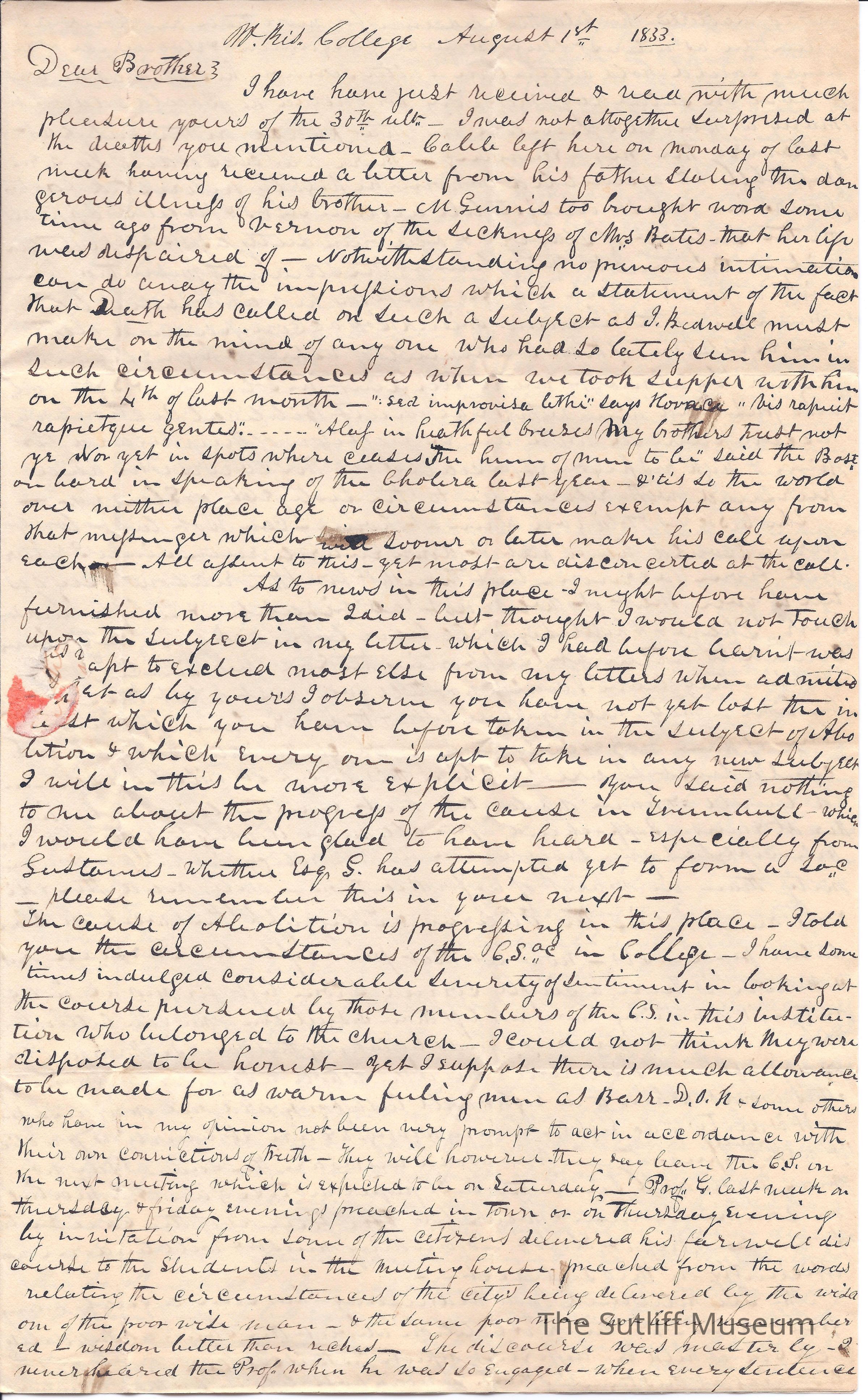 Letter from Milton Sutliff to Flavel Sutliff where Milton discusses formation of an Abolition Society at Western Reserve College.Collection