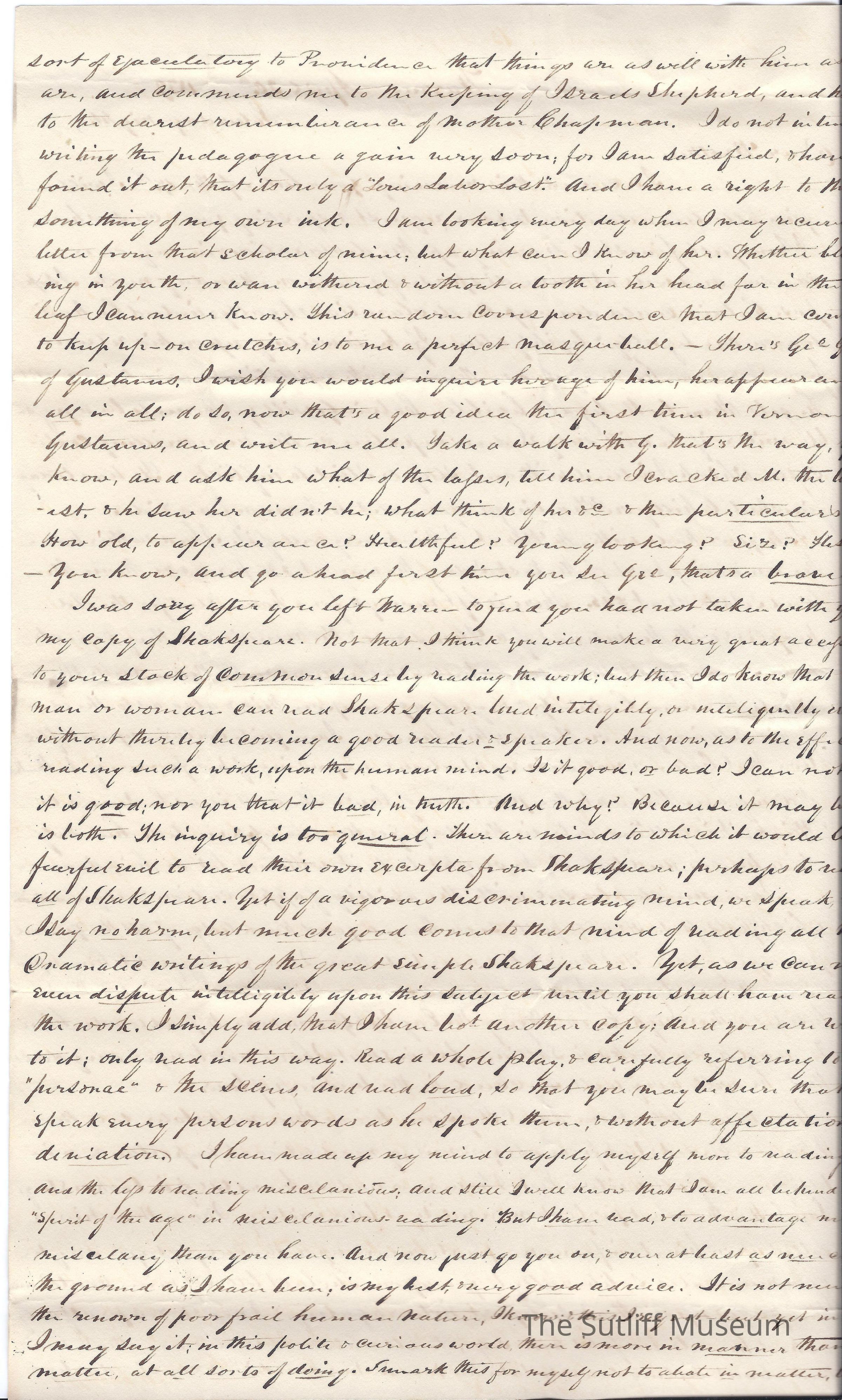 Letter from Milton Sutliff to Flavel Sutliff regarding Calvin's progression as a lawyer and Samuel Harvey's inability to write a thoughtful letter. Also advises Flavel to broaden his reading horizons.Collection