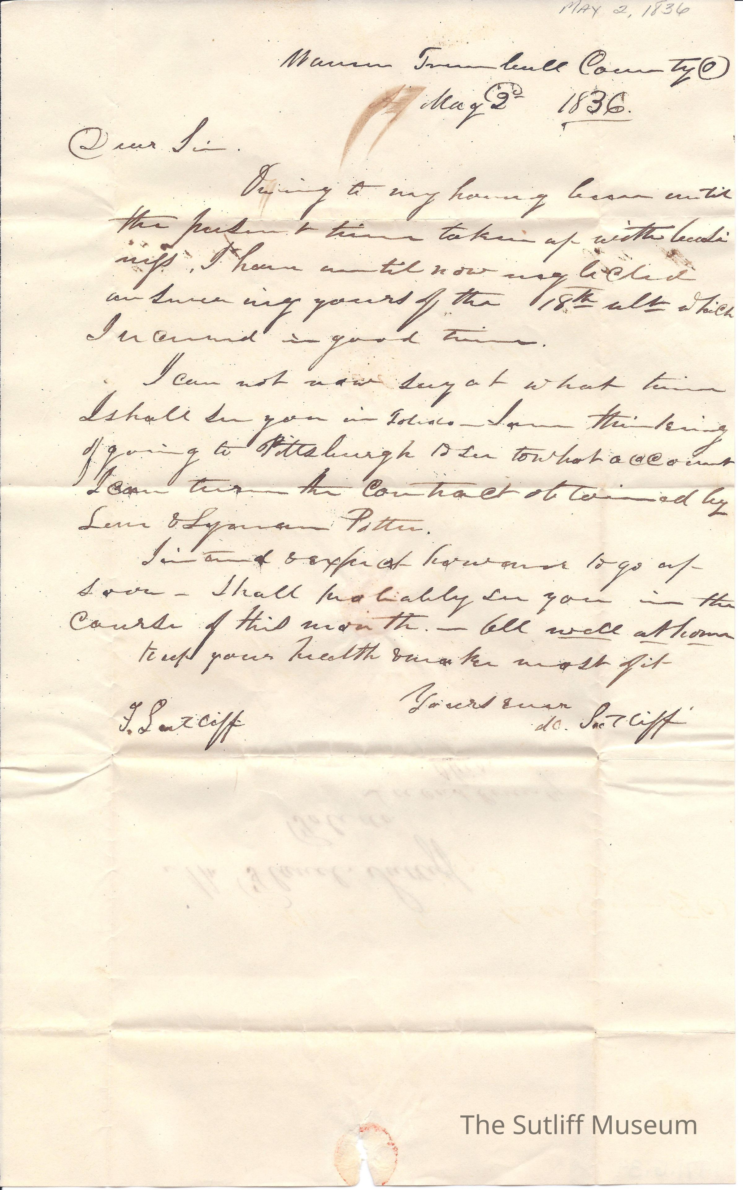 Letter from Milton Sutliff to Flavel Sutliff where Milton informs Flavel that he may head to Pittsburgh instead of Toledo.Collection