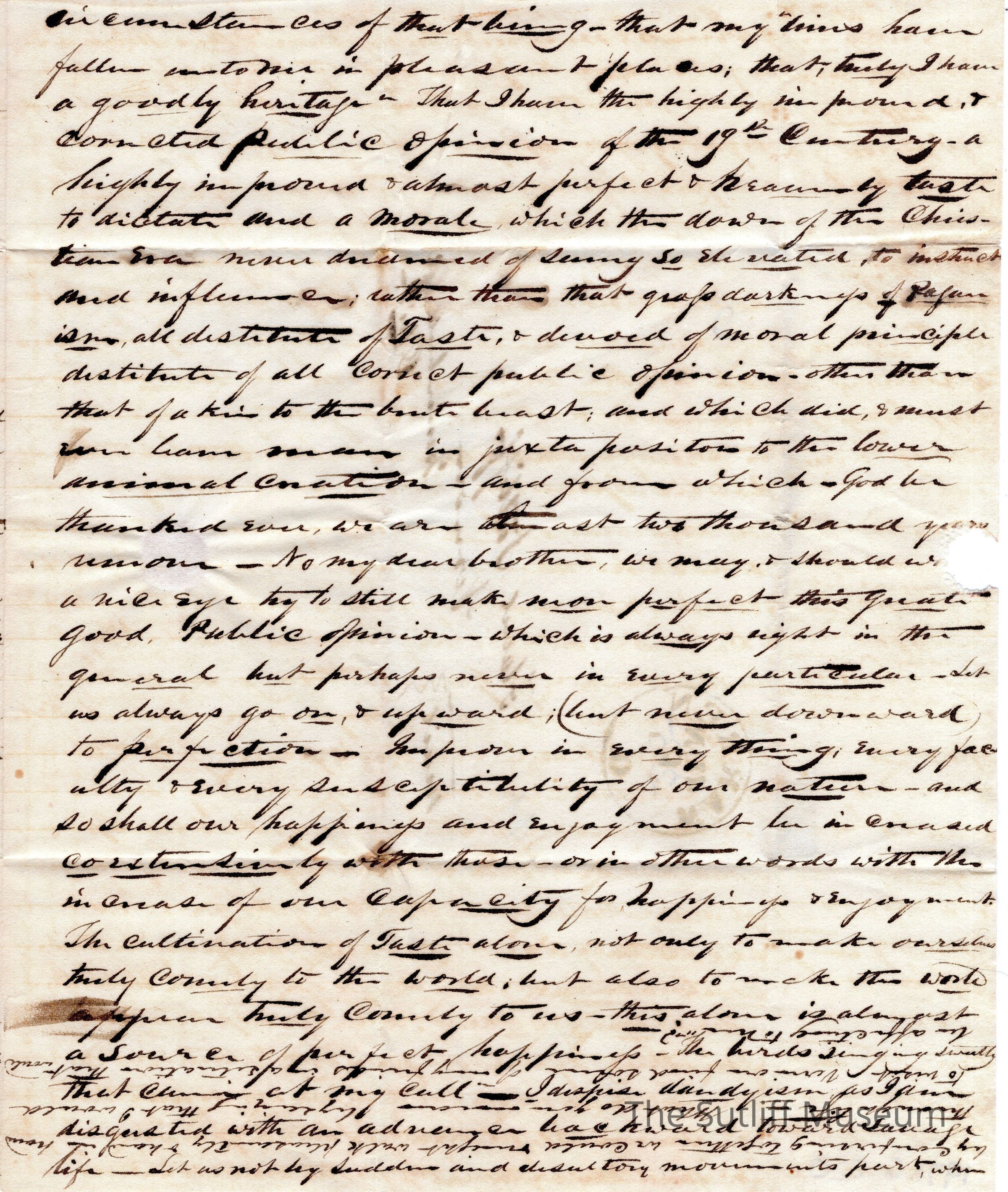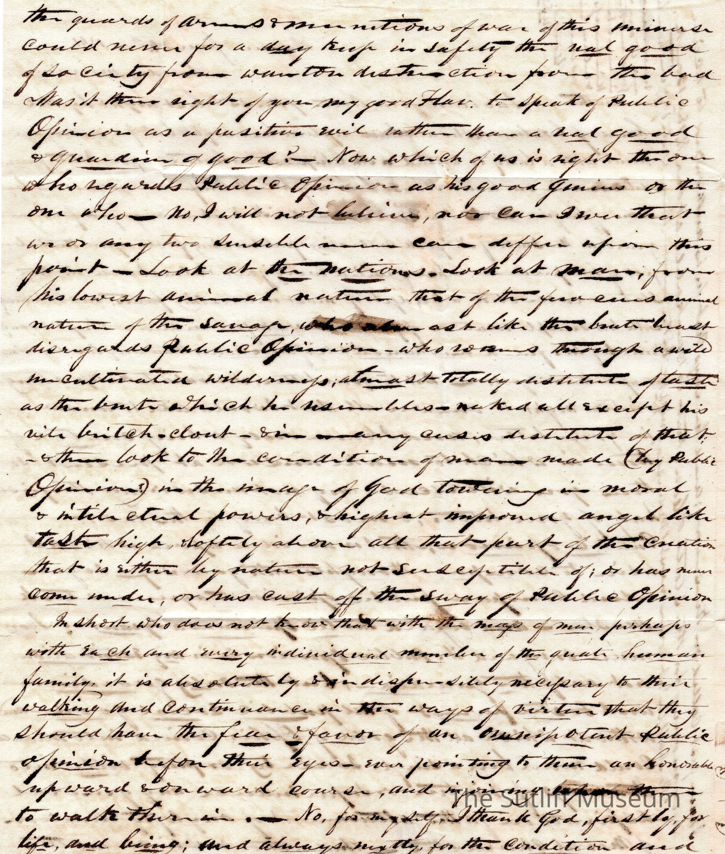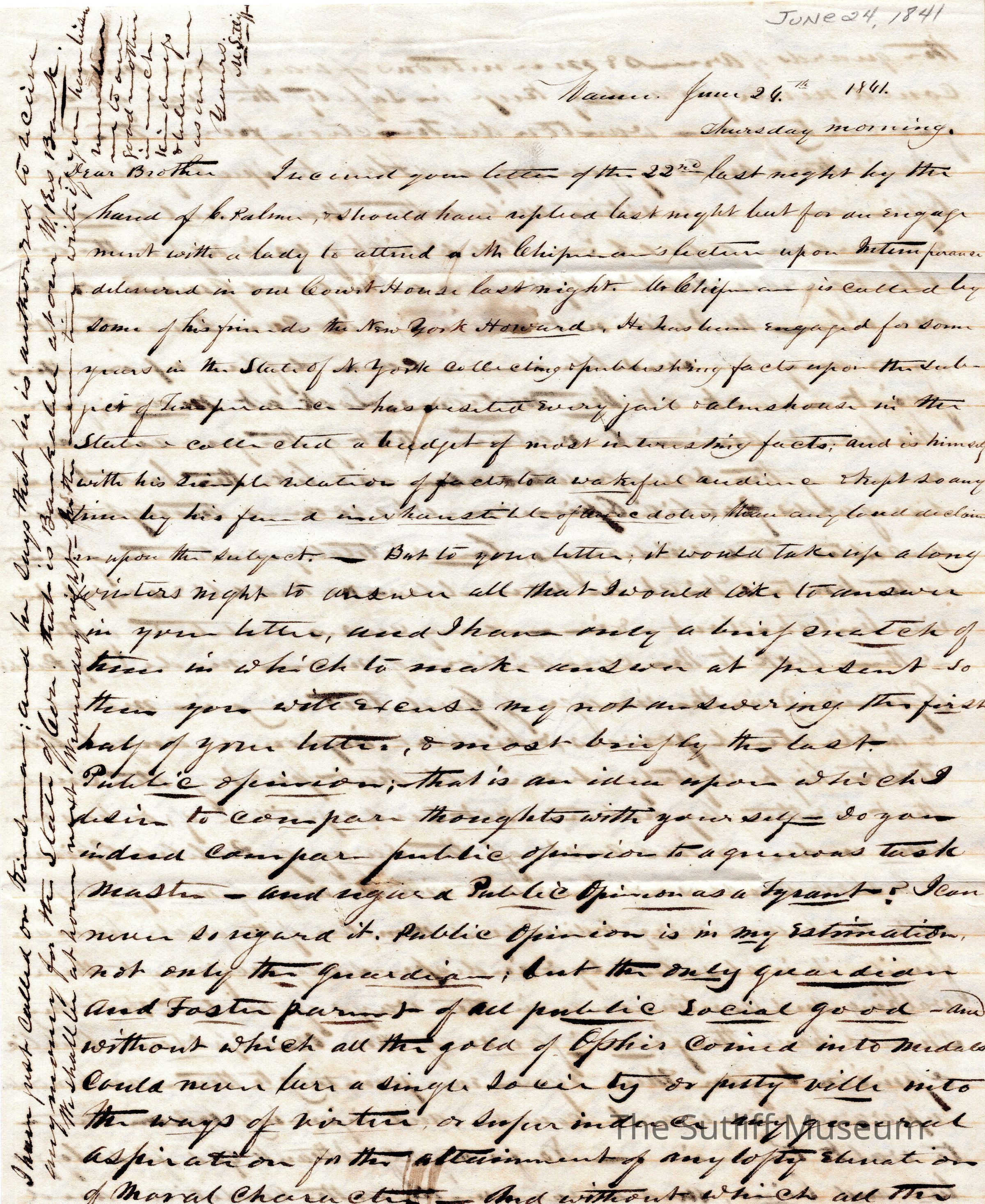 Letter from Milton Sutliff to Flavel Sutliff responding to a letter from the 22nd, and his opinions on politics and public opinion.Collection