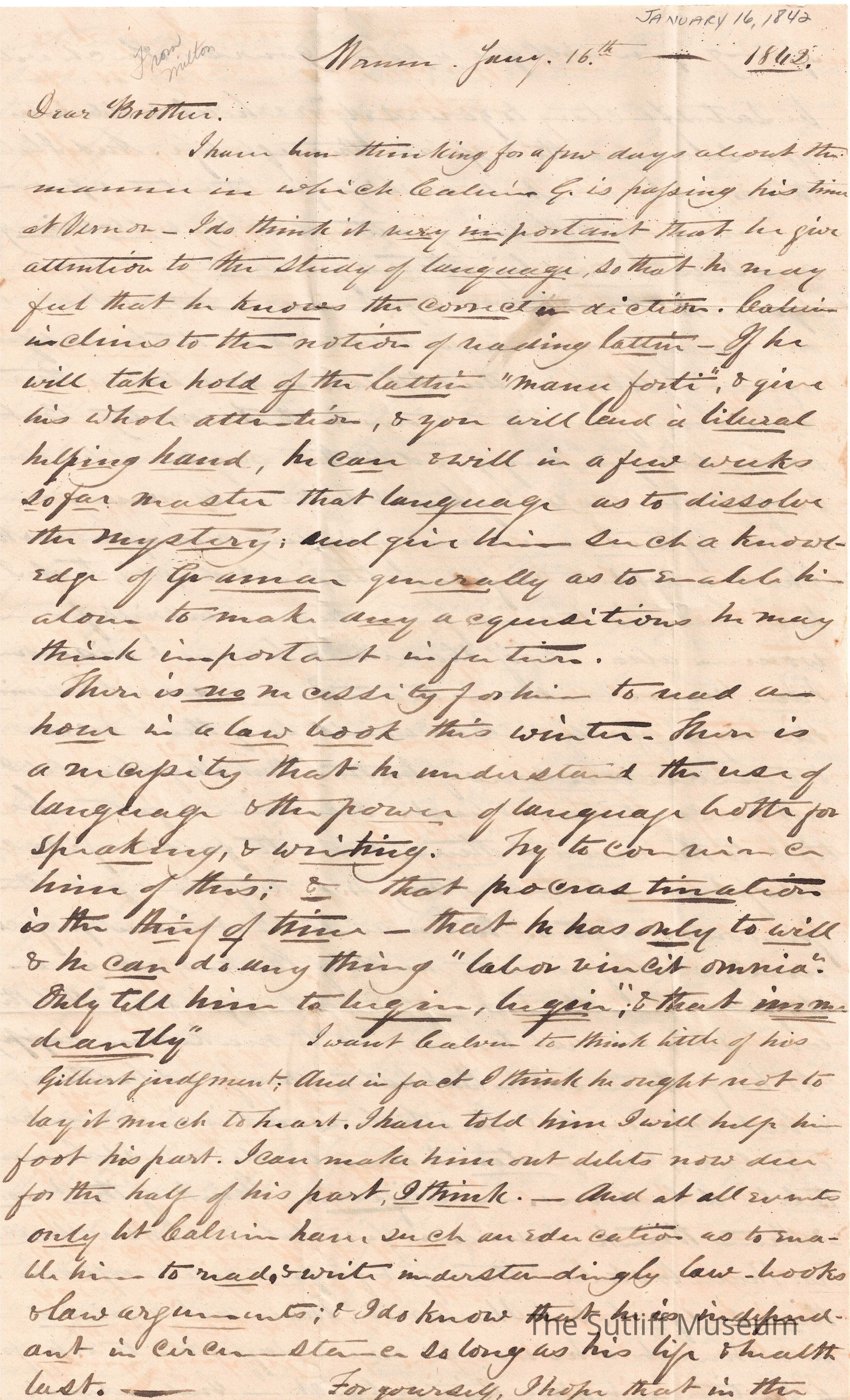 Letter from Milton Sutliff to Flavel Sutliff regarding Calvin G's studies, the importance of language, and religion.Collection