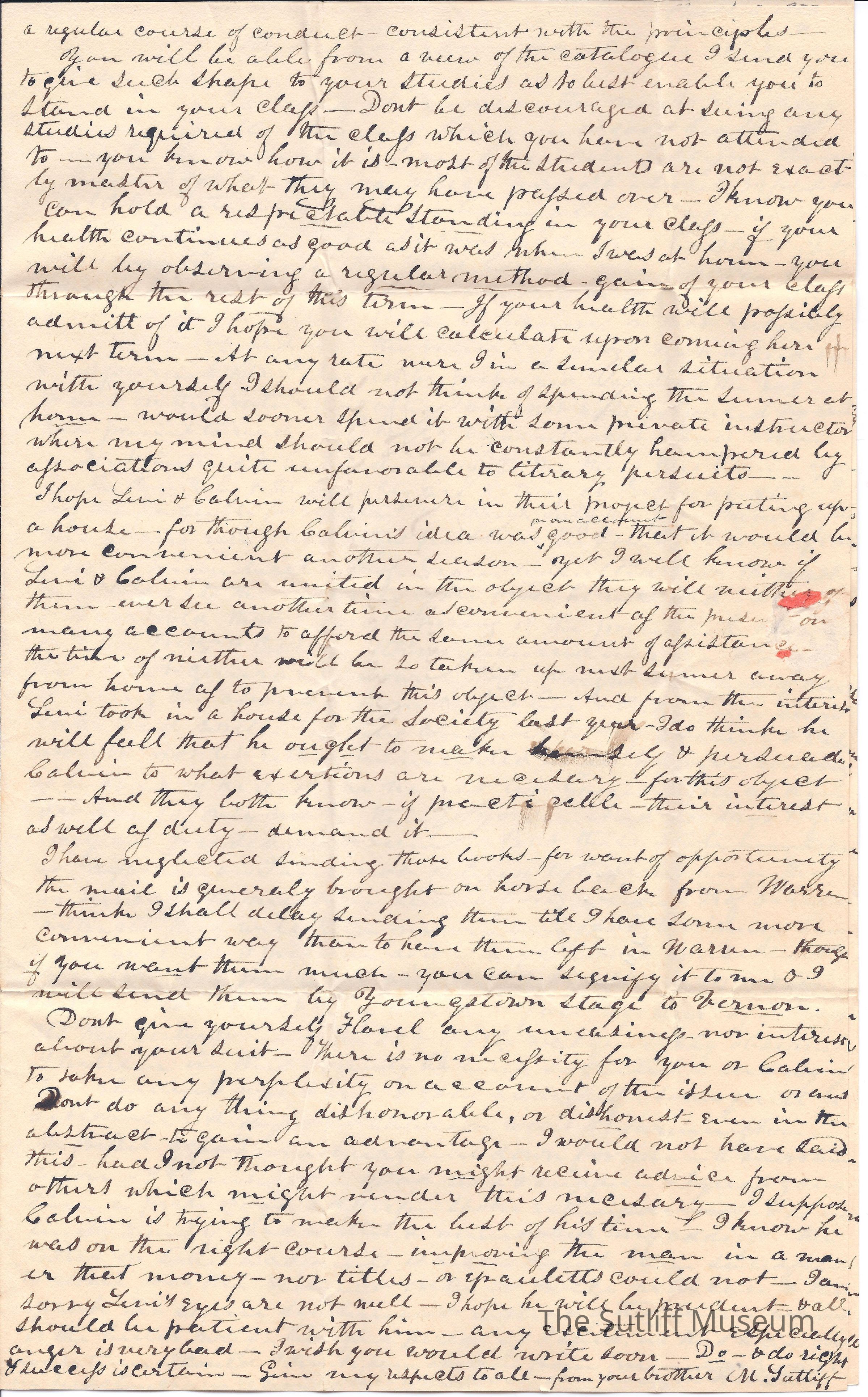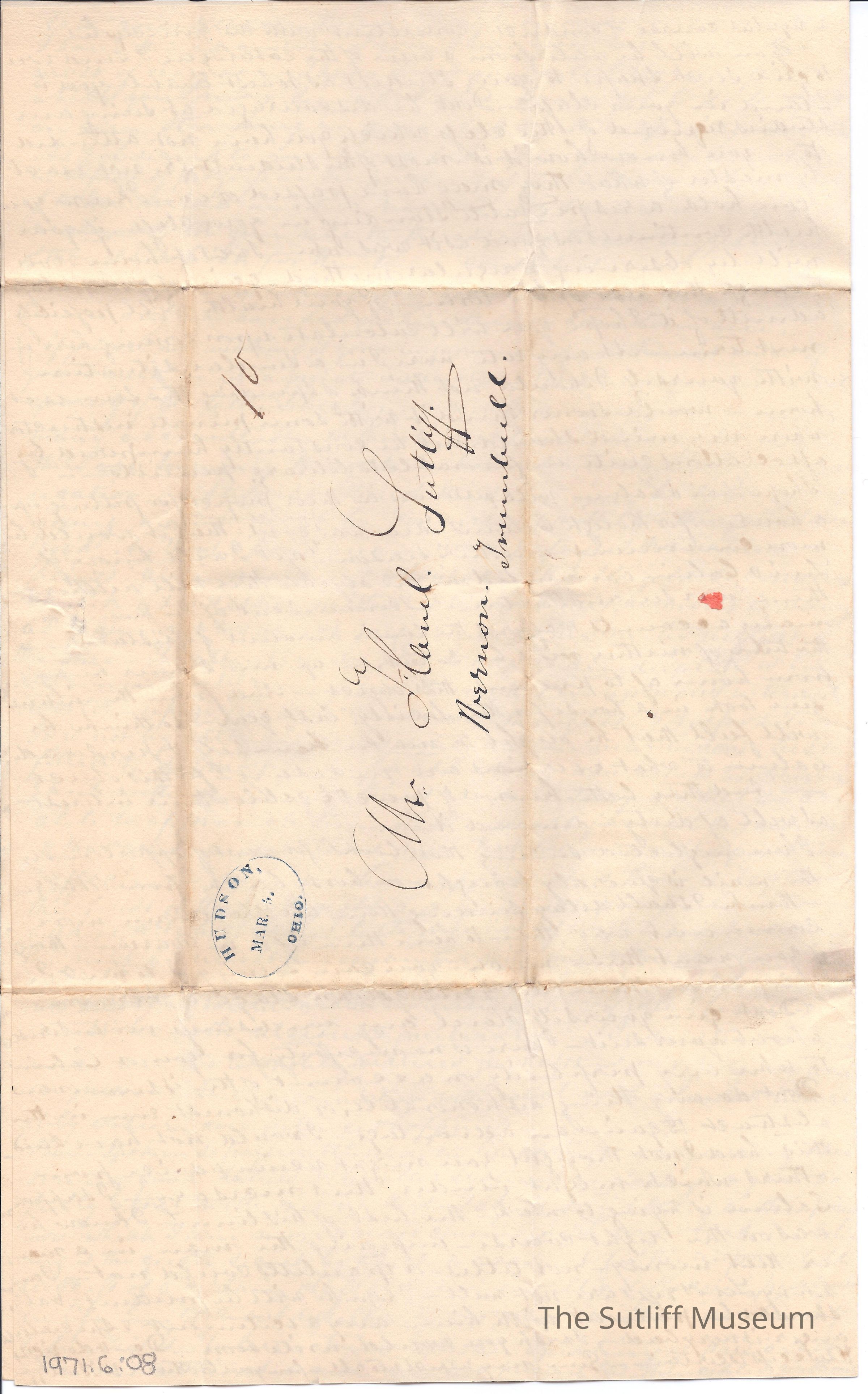 Milton Sutliff to Flavel Sutliff regarding Milton's Trip from Hudson to Aurora, Milton's Address to a Temperance Society, Milton's Advice to Flavel on How to Act and Study, and Milton's Opinion on Calvin and Levi Putting up a House.Collection