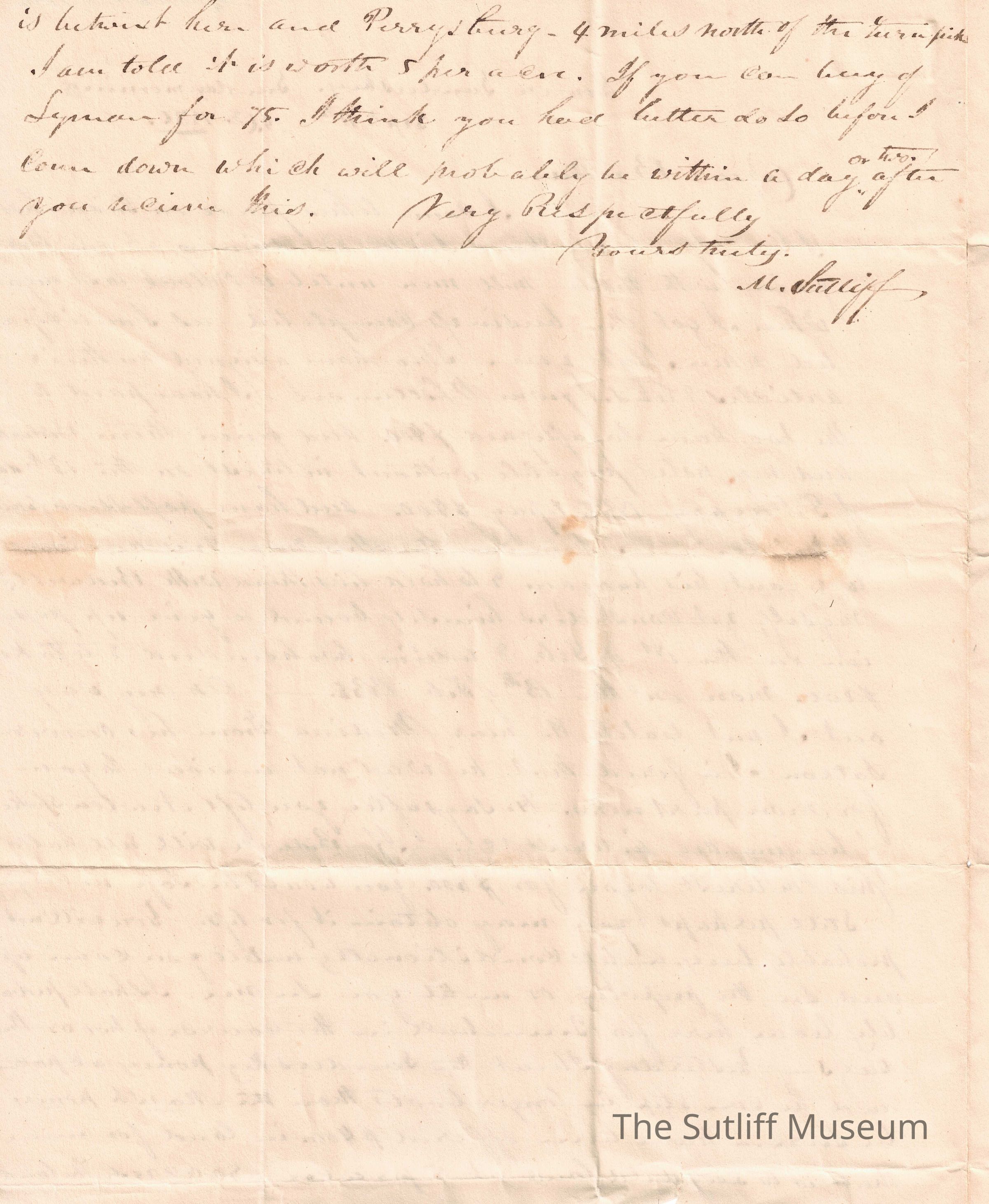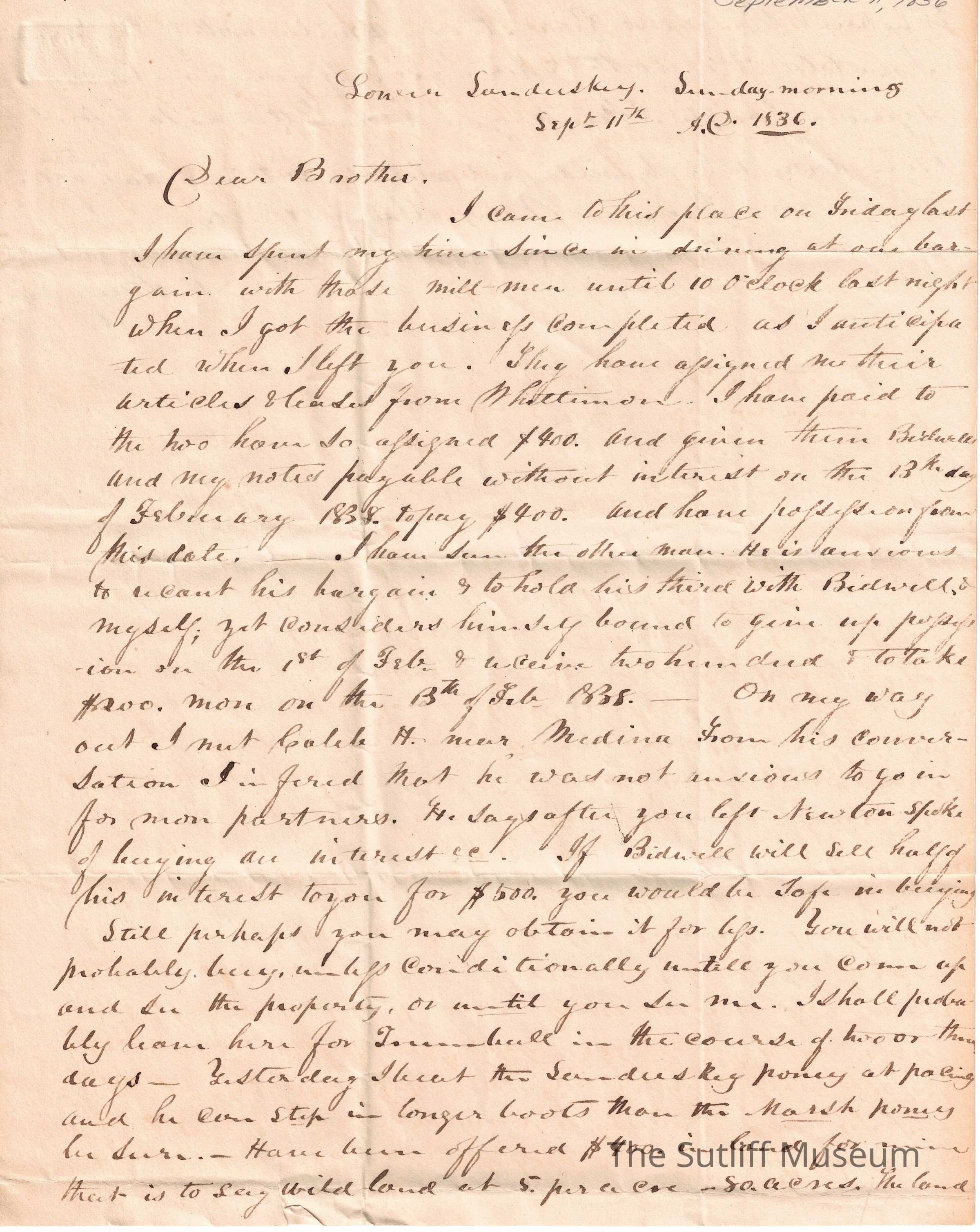 A letter from Milton Sutliff to Levi Sutliff regarding business deals and clients.Collection
