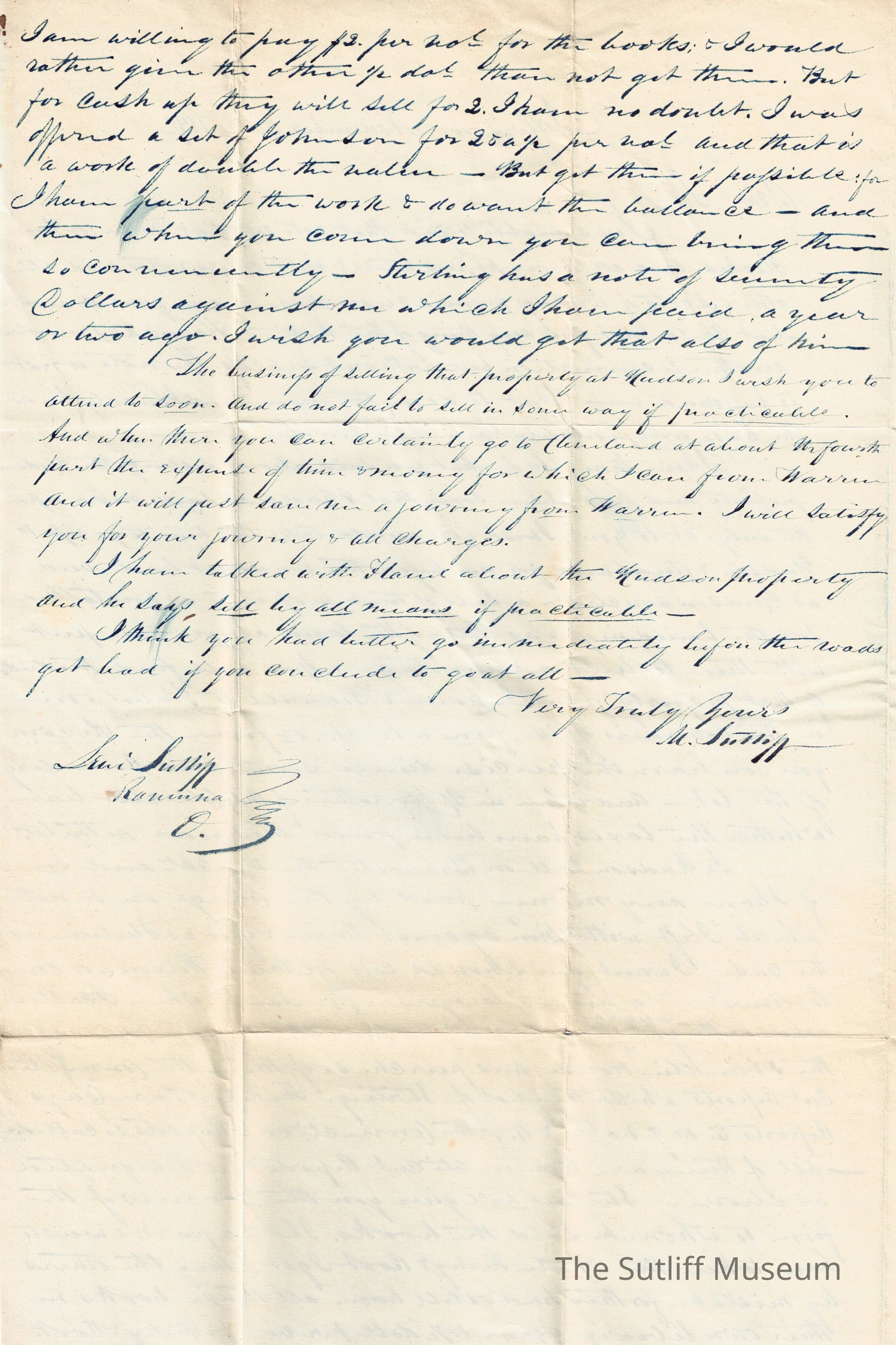 Letter from Milton Sutliff to Levi Sutliff. Milton writes to Levi regarding Levi's request to him to find a note among his piles of letters and other writings. Flavel looked as well, without success. He suggests that the case will have to continue without the note. Milton advises Levi on the sale of property in Hudson. While in Hudson, Levi is to call on Brewster, the merchant, to see if Milton has any money paid by the college on a note which he left with the merchant. Milton also asks Levi to call on the lawyers, Pain & Wilson (or Collins & Wilson) in Cleveland and purchase the Connecticut Reports.Collection