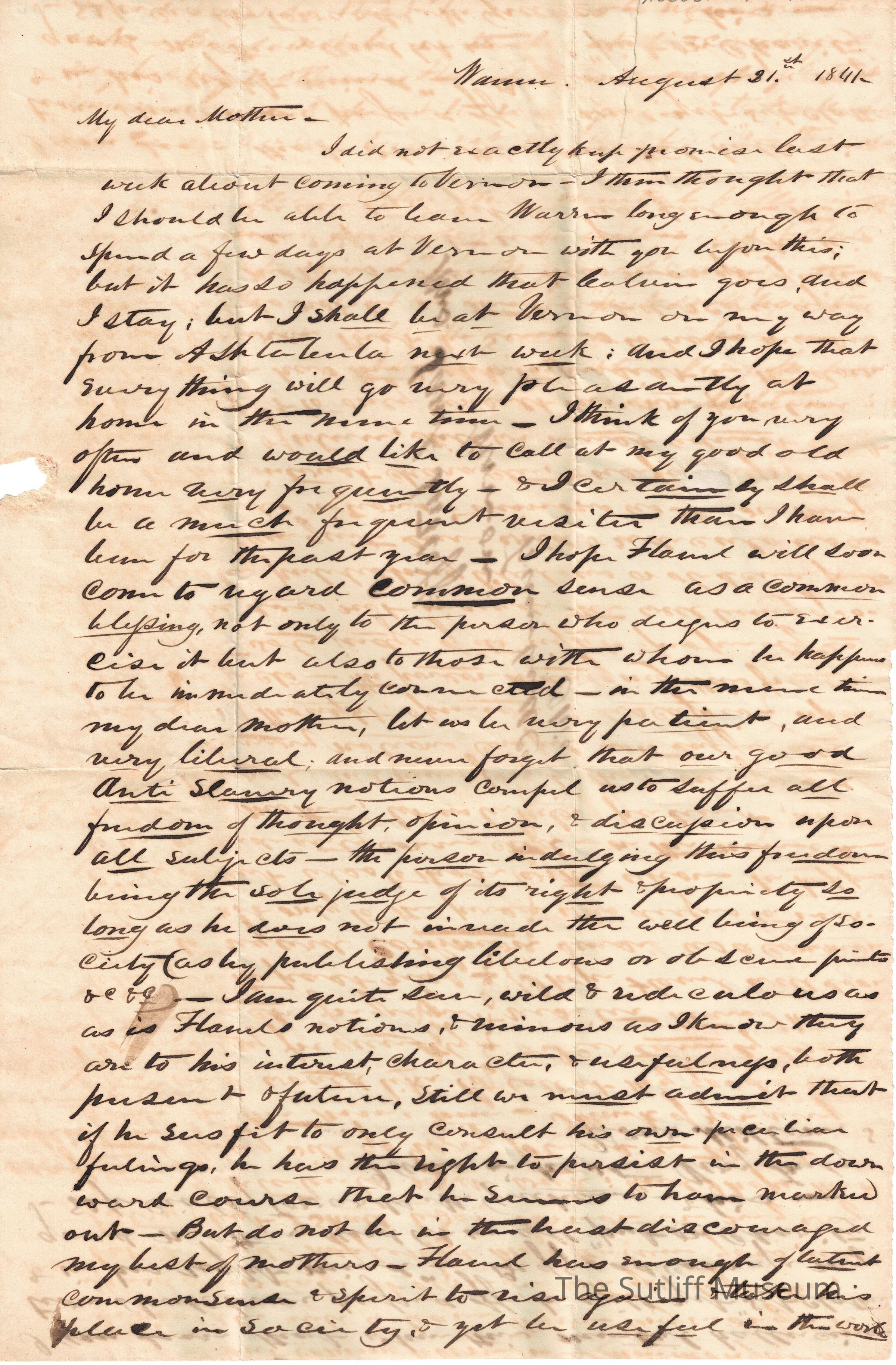 A letter from Milton Sutliff to his mother Ruth Sutliff regarding his plans to visit, his anti-slavery notions, and his distaste for Flavel's notions.Collection