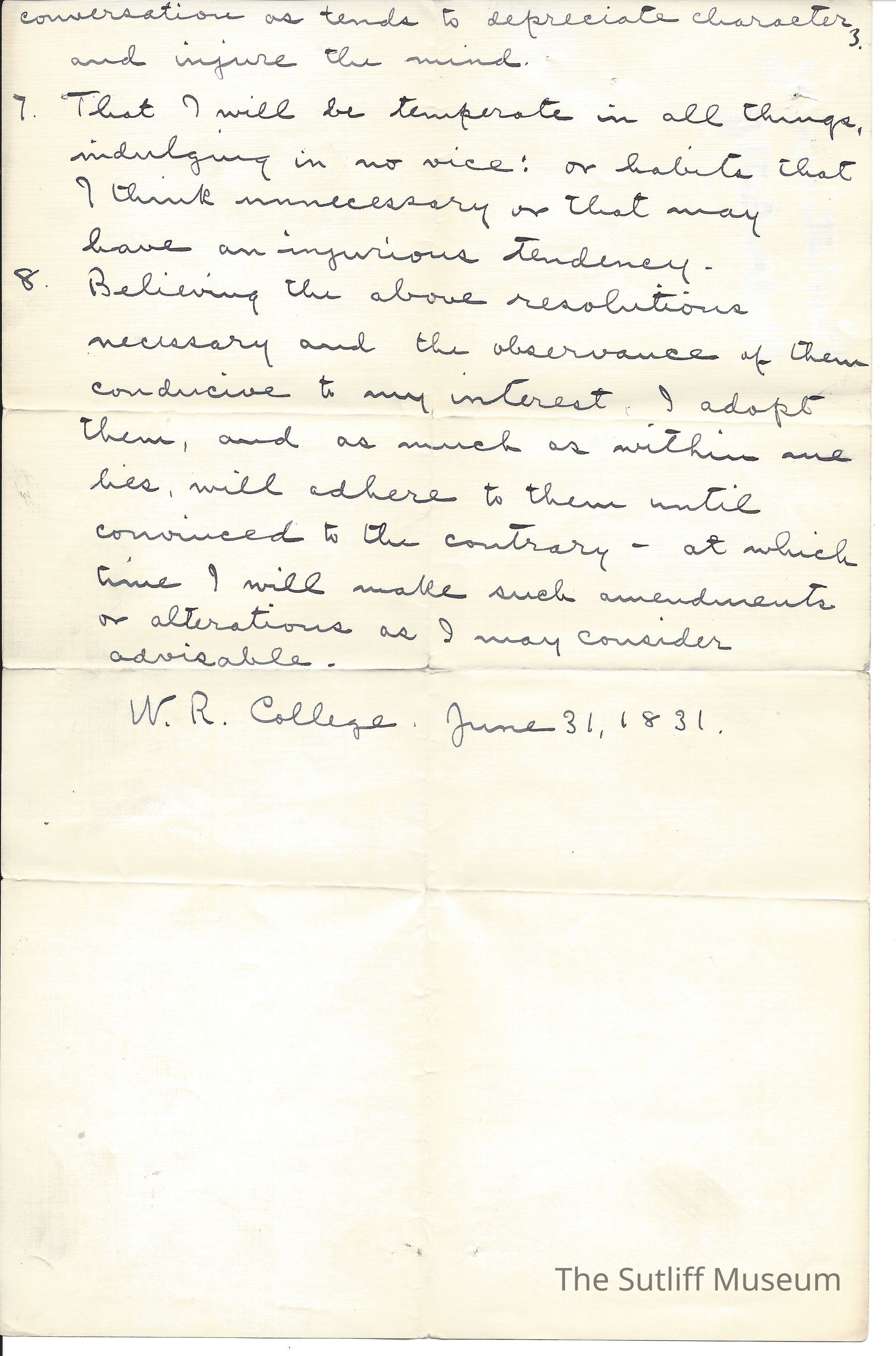 Milton Sutliff's Resolutions while at WR College June 31, 1831