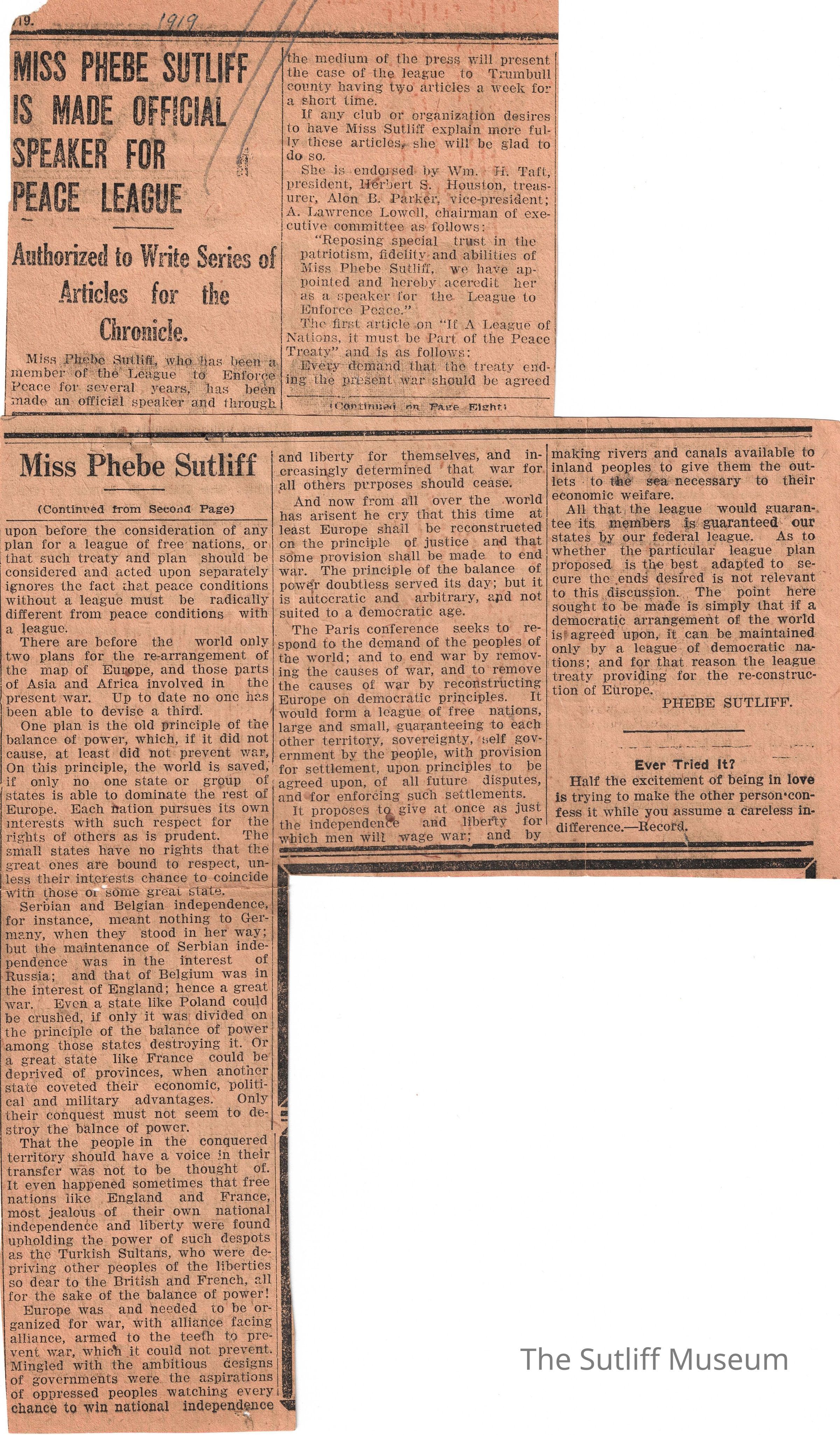 Newspaper article, "Miss Phebe Sutliff Is Made Official Speaker For Peace League"Relationships