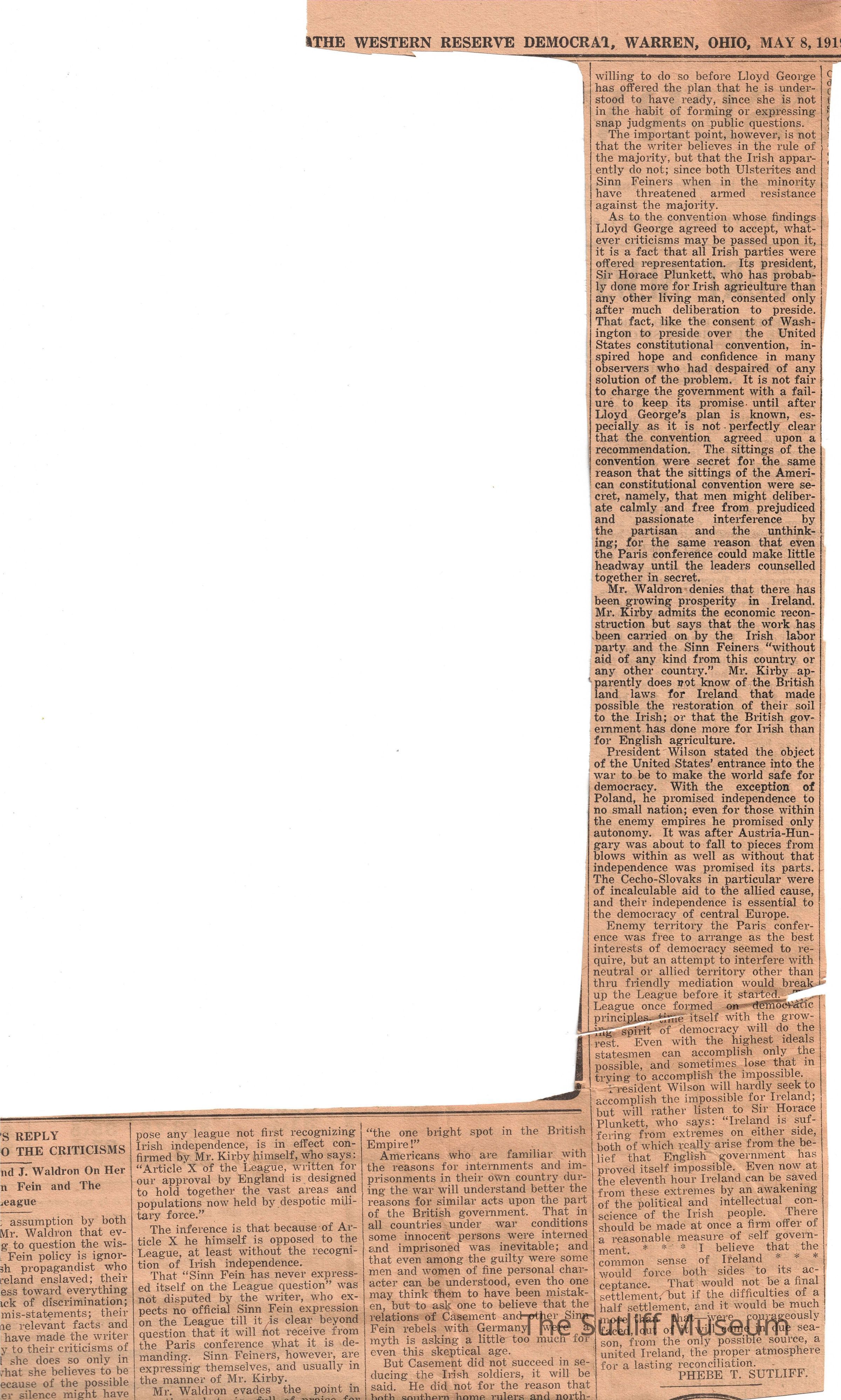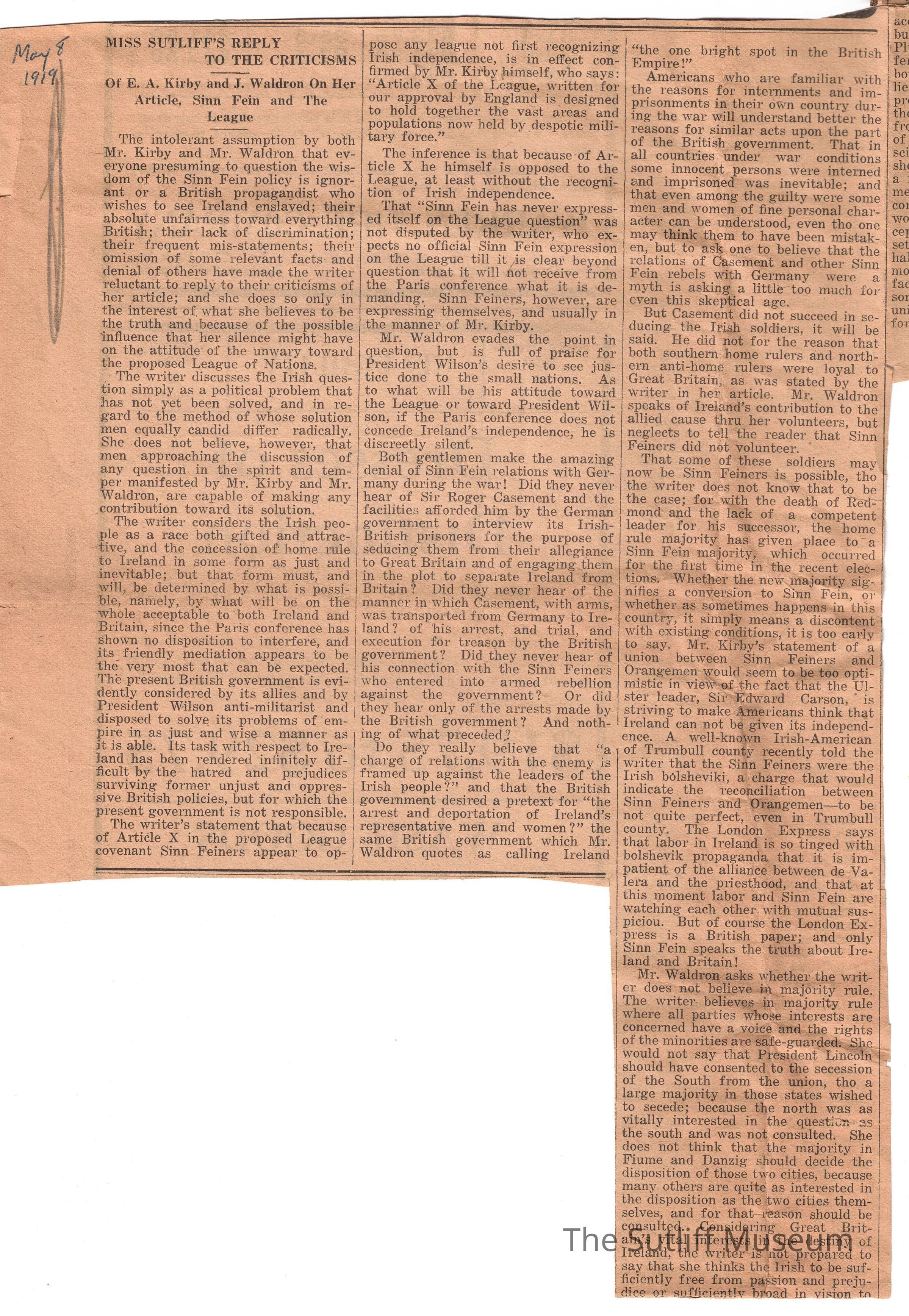 An article titled "Miss Sutliff's Reply to the Criticisms of E.A. Kirby and J. Waldron on Her Article, Sinn Fein and The League" Dated 5/8/1919.Collection