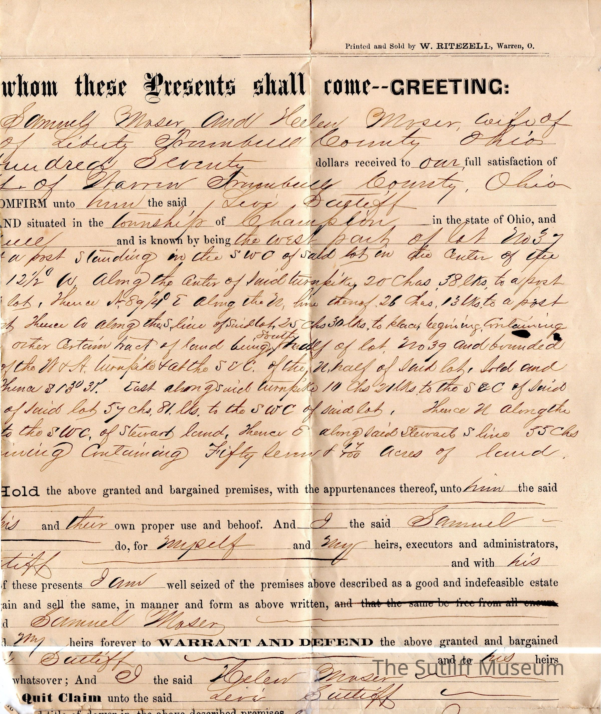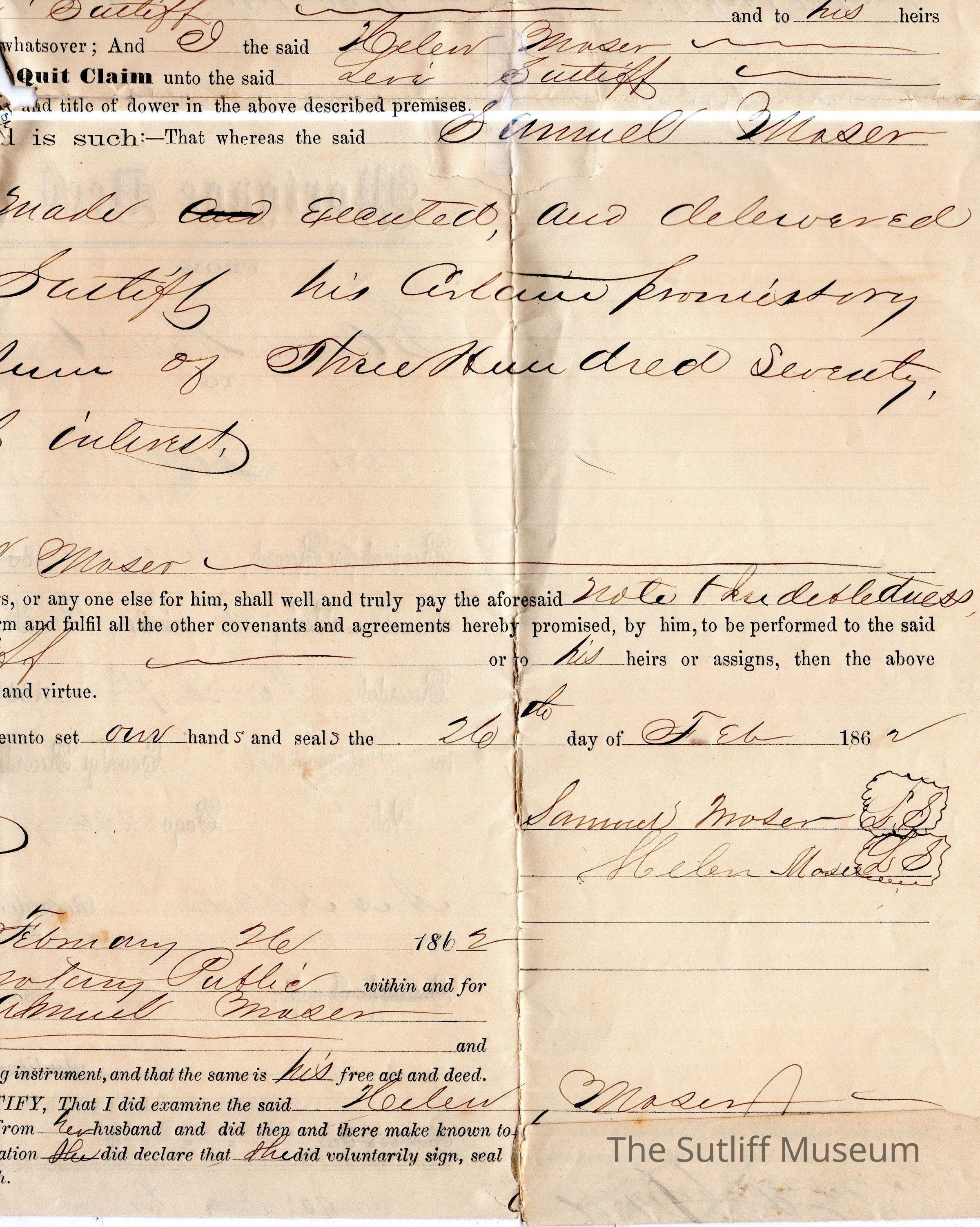Half of the Mortgage Deed from Samuel Moser and his wife, to Levi SutliffArchive Details