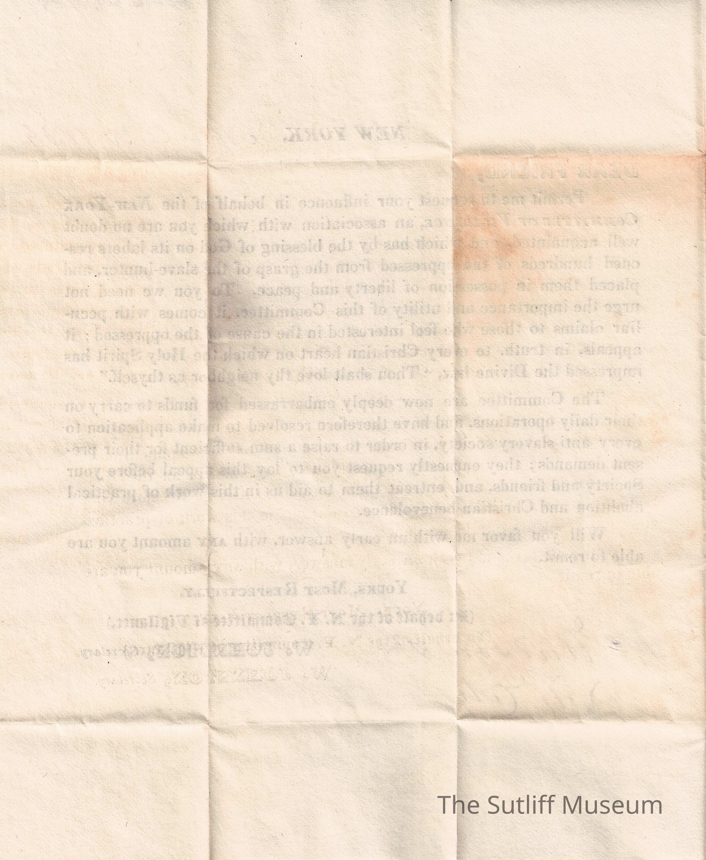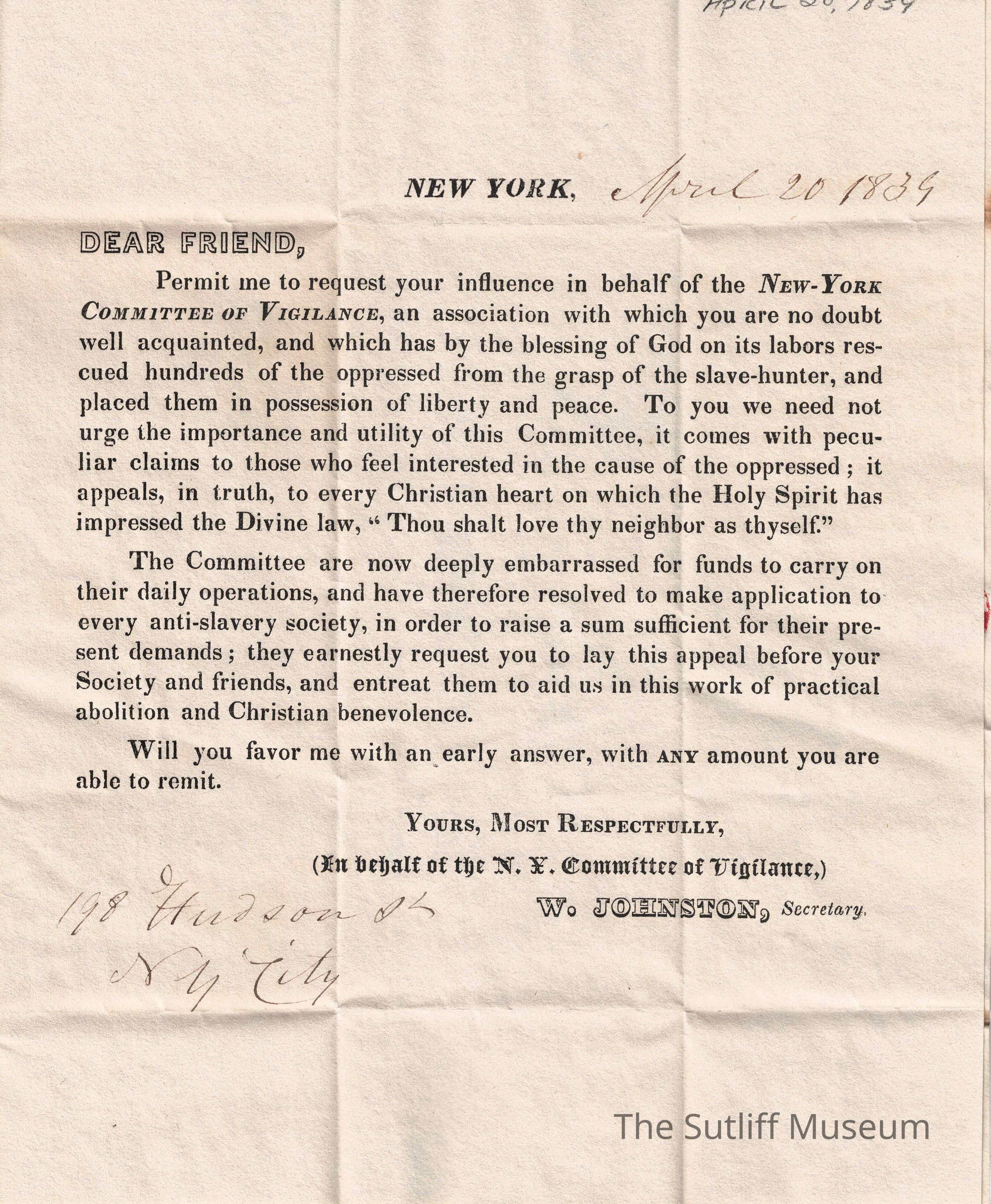 A letter from the New York Committee of Vigilance to Samuel Plumb regarding the mission of the Committee and it needs funds to continue that mission.Collection