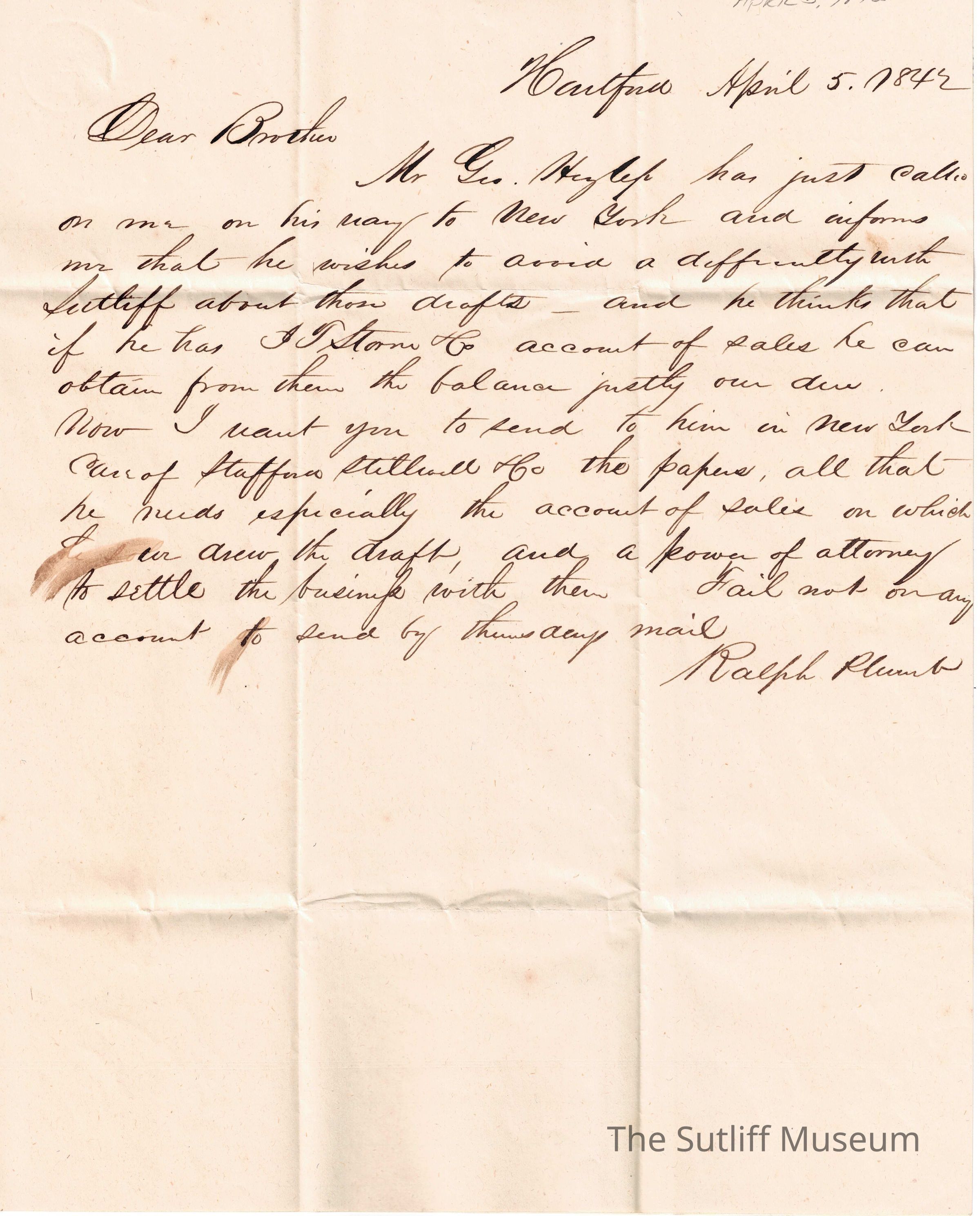 A letter from Ralph Plumb to Samuel Plumb regarding Geo Hezlek and Levi Sutliff, and their business.