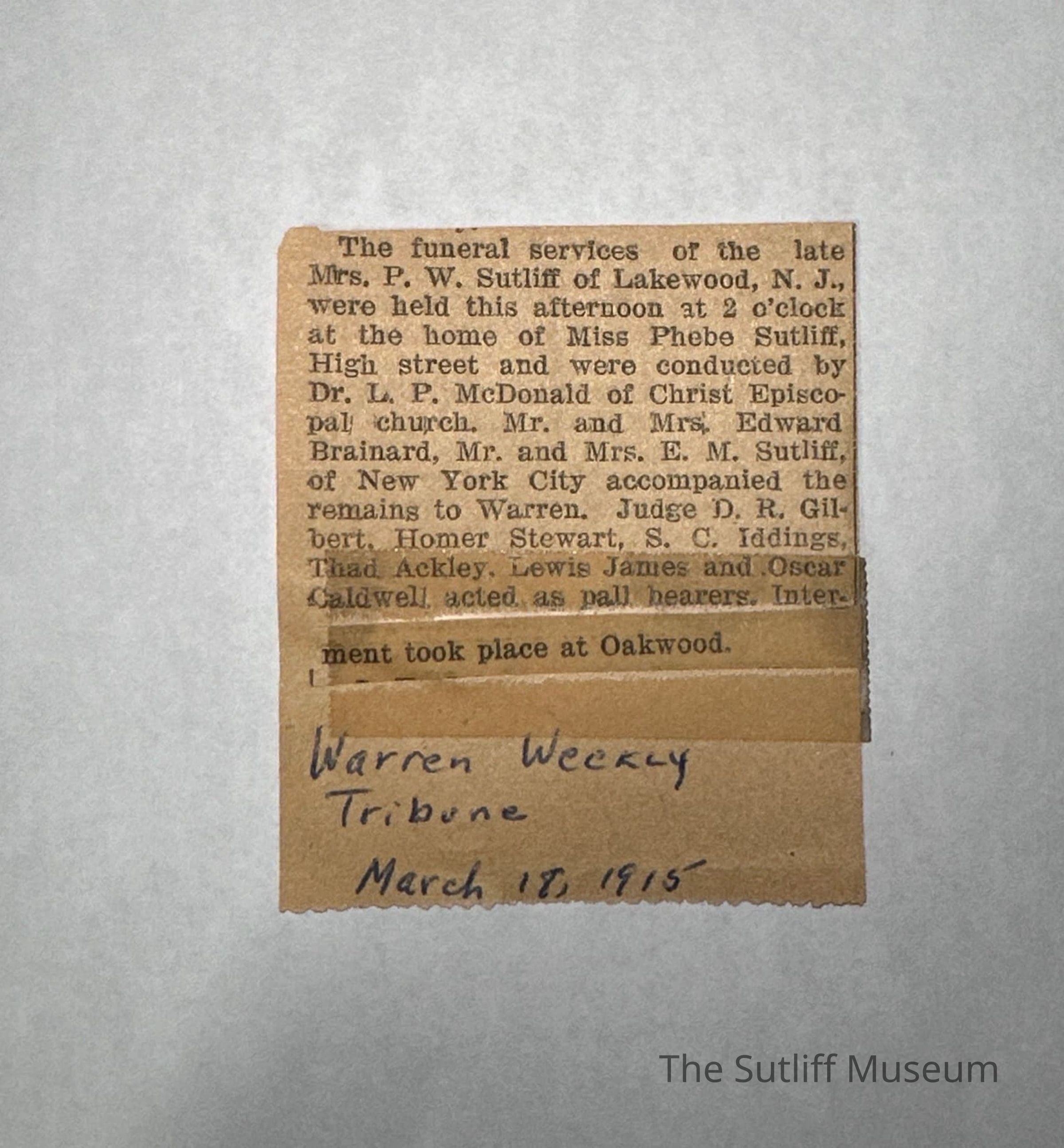 Newspaper clipping with an article about Mrs. P. W. Sutliff's funeral on March 18, 1915Collection