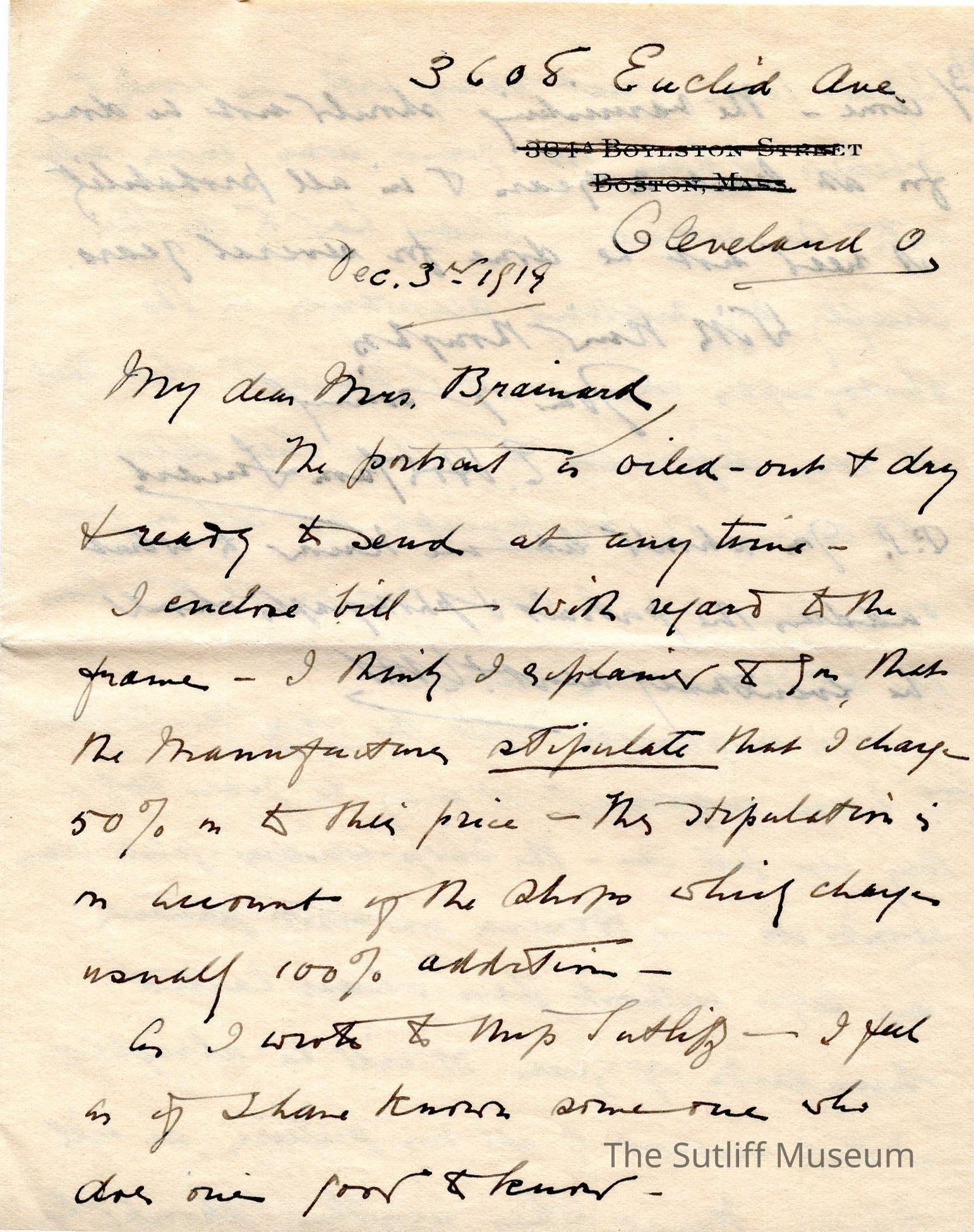 A letter from Mrs. Smart to Lydia Sutliff Brainard regarding Edward Sutliff Brainard's painting and letters.Archive Details